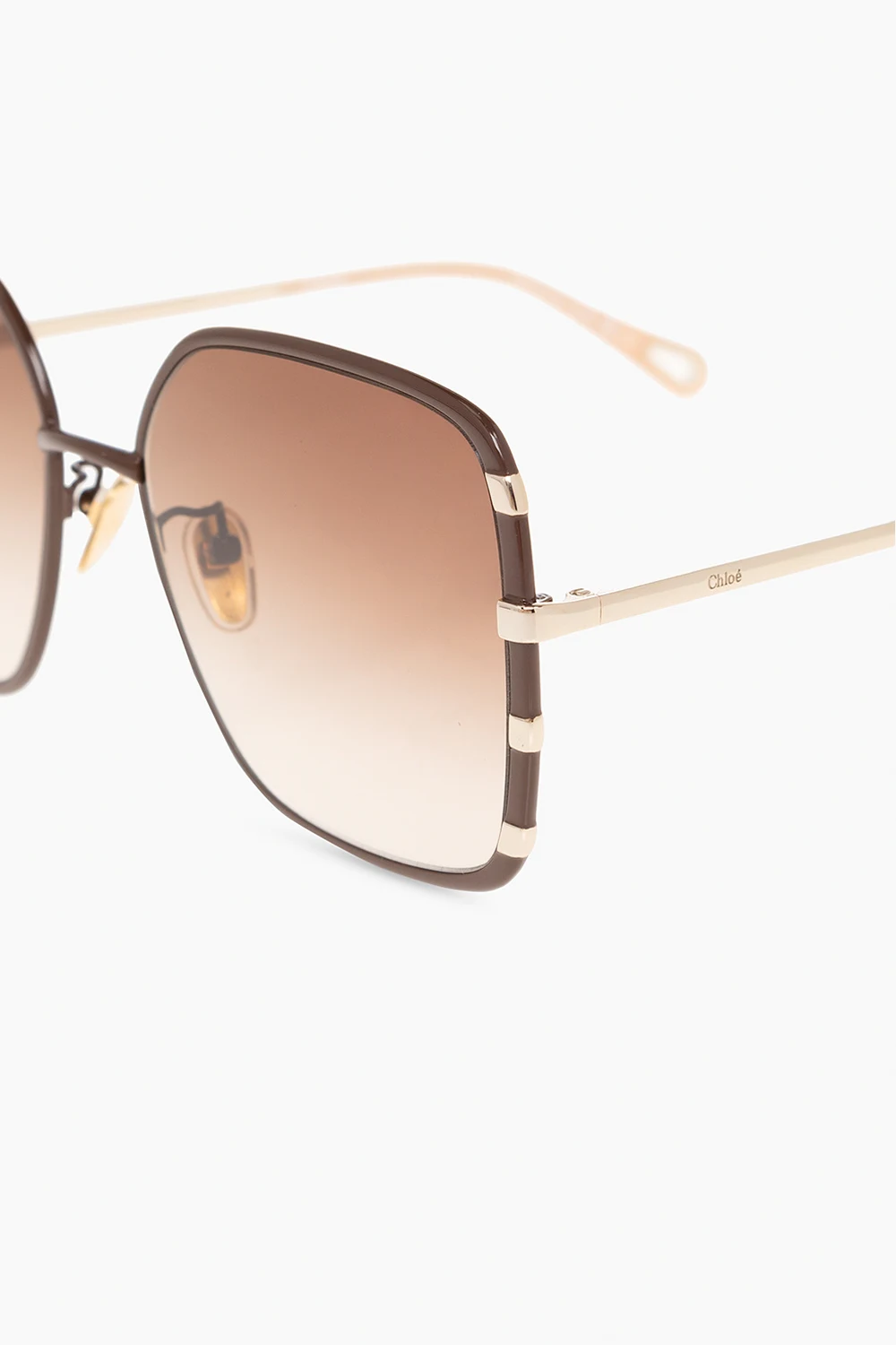 Okulary w kolorze brązowo-złotym, model ‘Celeste’ Chloé. Wykonane z metalu i bioacetatu. Kwadratowe, ponadgabarytowe oprawki z pojedynczym mostkiem ozdobione metalowymi detalami w kolorze złotym. Regulowane noski wykończone silikonową nakładką. Cienkie zauszniki ozdobione logo z końcówkami z metalowym oczkiem. Brązowe, gradientowe szkła ze 100% ochroną przed promieniami UV. Dołączone etui.