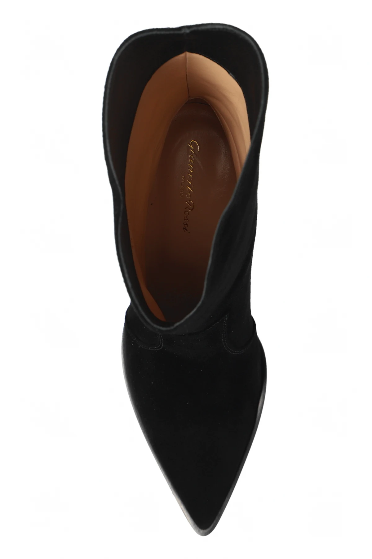 Szpiczasty nosek podkreśla elegancki charakter botków, a na górnej części wewnętrznej strony cholewki znajduje się subtelny napis lub logo projektanta, dodając dyskretnego uroku.