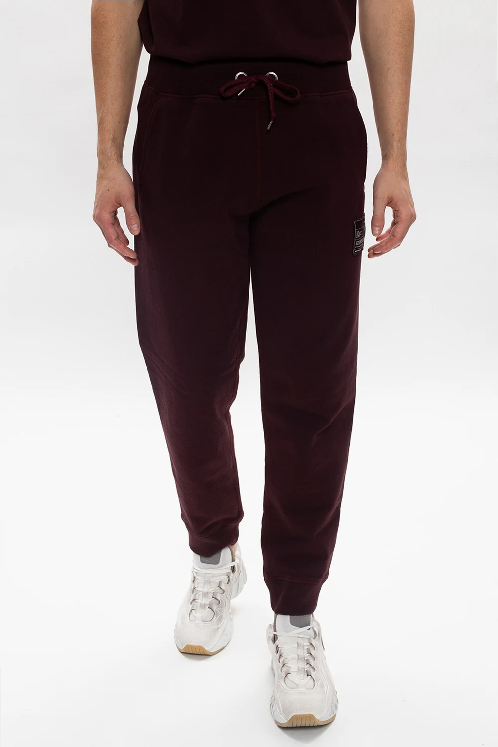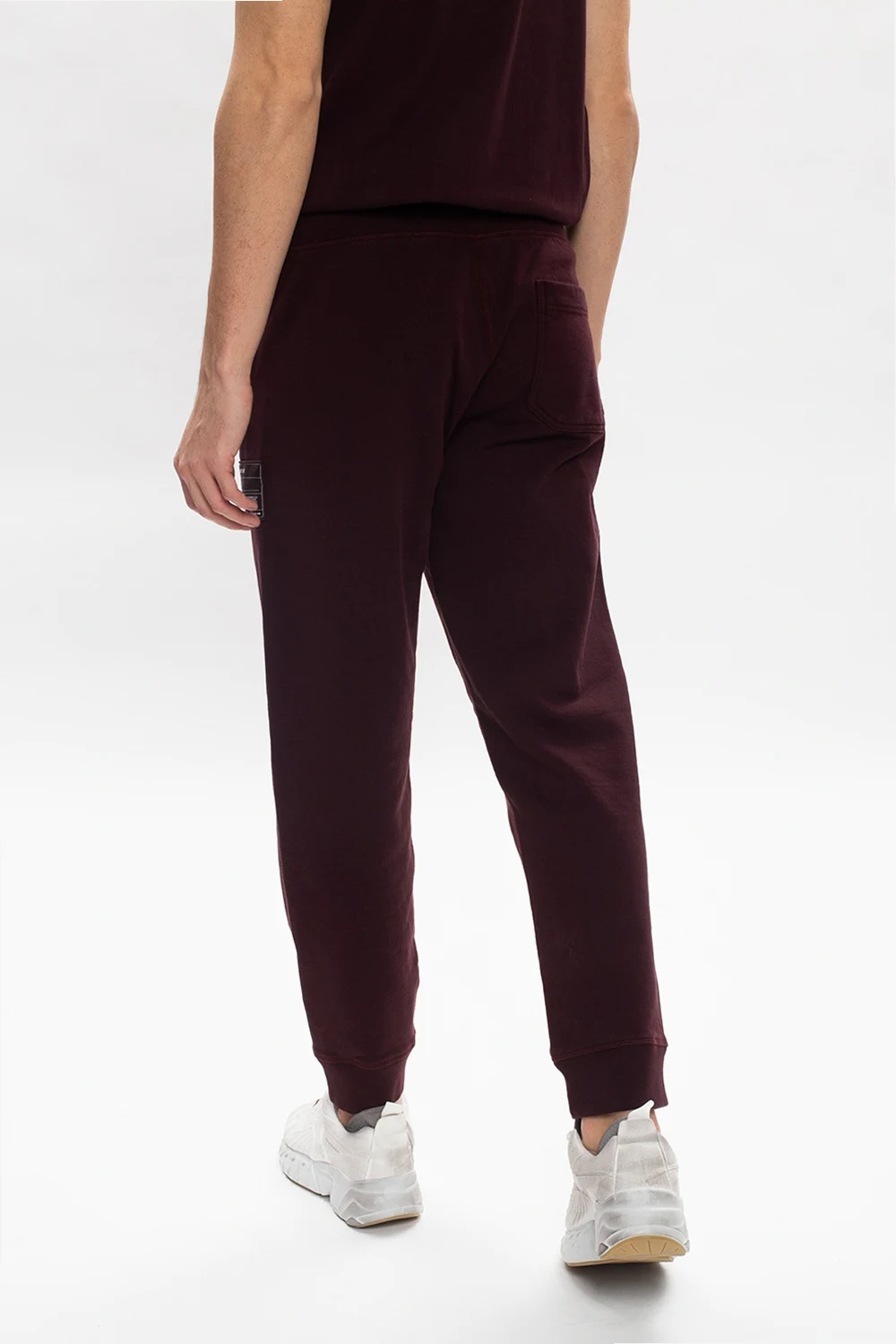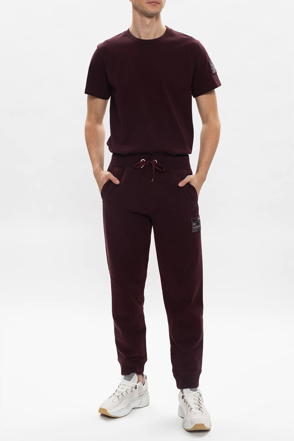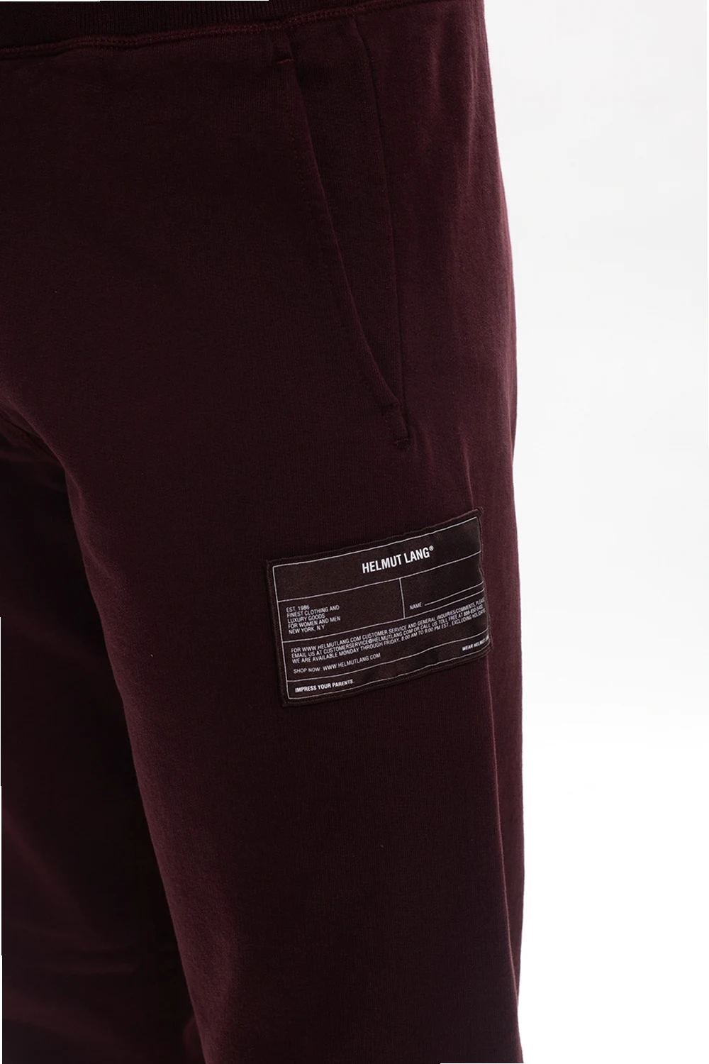 Bordowe spodnie dresowe Helmut Lang. Wykonane z bawełny. W pasie ściągane trokami. Naszywka z logo. Trzy wsuwane kieszenie: dwie z przodu oraz pojedyncza z tyłu. Nogawki zakończone ściągaczami.