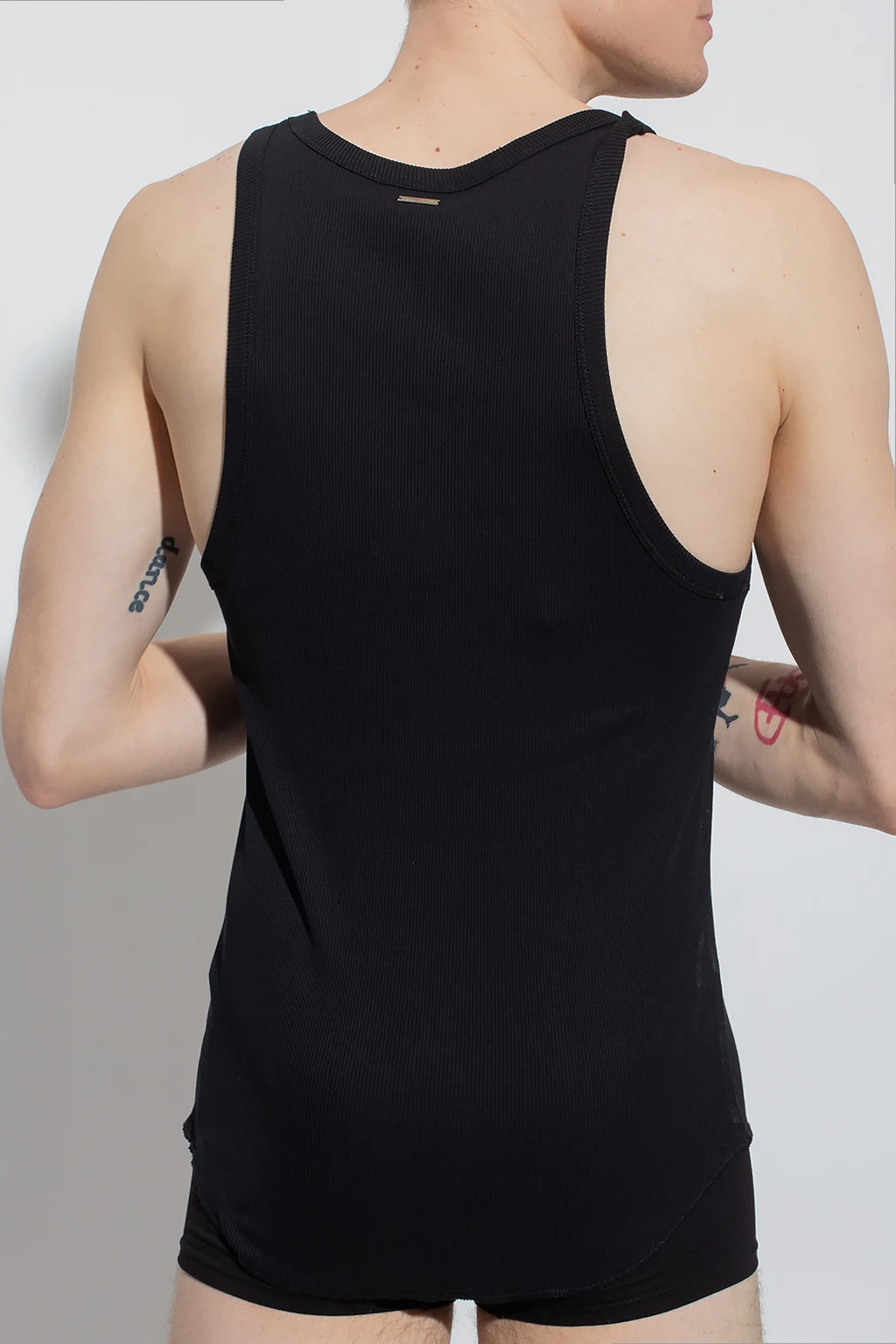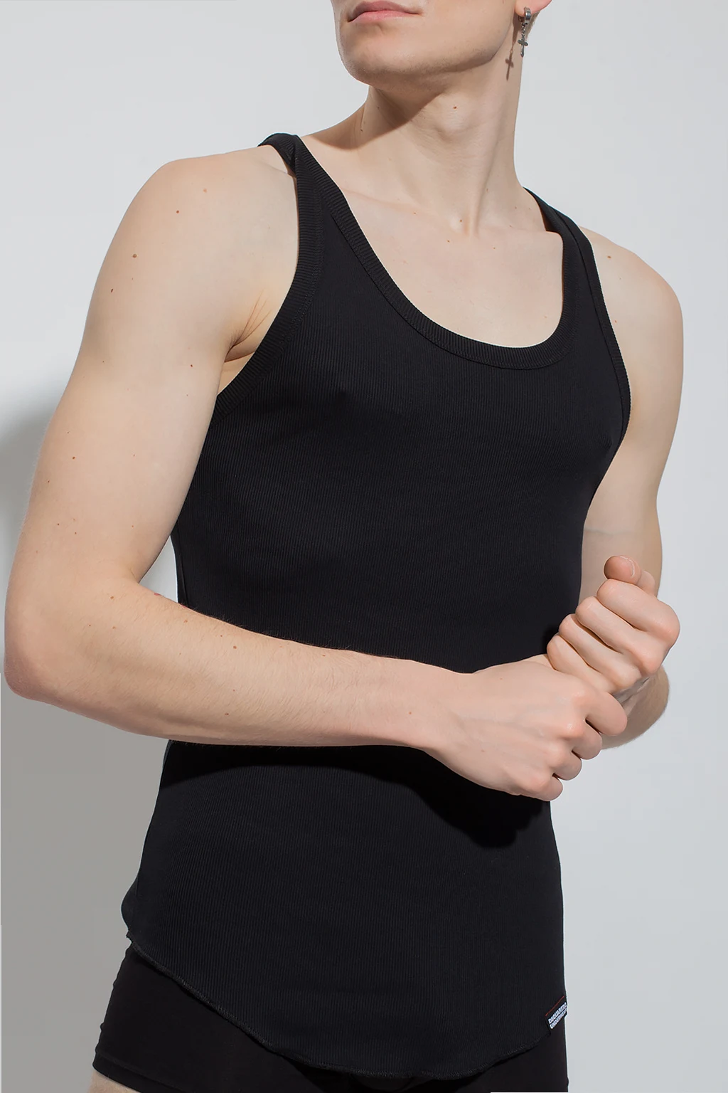 Czarny, prążkowany top bez rękawów Dsquared2. Wykonany z bawełny. Ozdobiony naszywką z logo w kolorze biało-czarno-czerwonym.