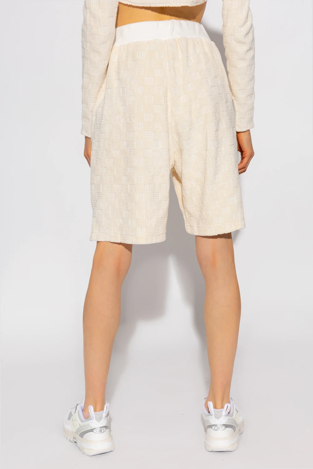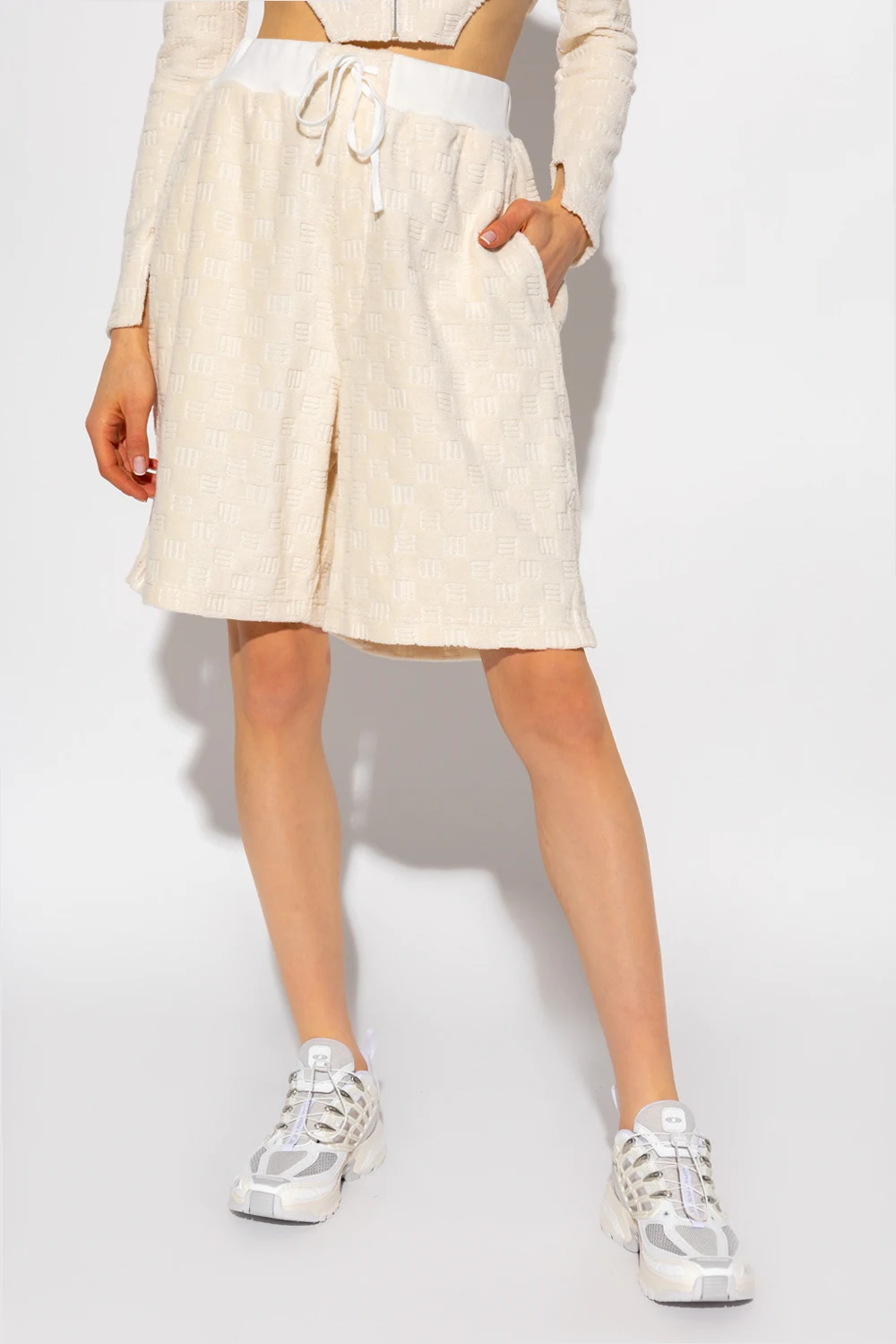 Kremowe szorty Ambush. Wykonane z materiału typu ‘frotte’ ozdobionego wytłoczonym wzorem. Wysoki stan wykończony gumą ściąganą trokami. Dwie wsuwane kieszenie.