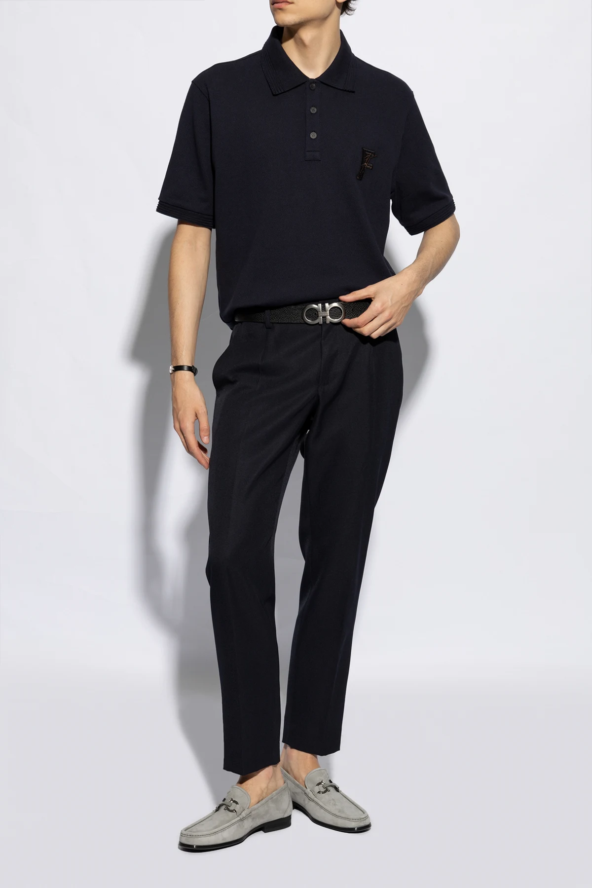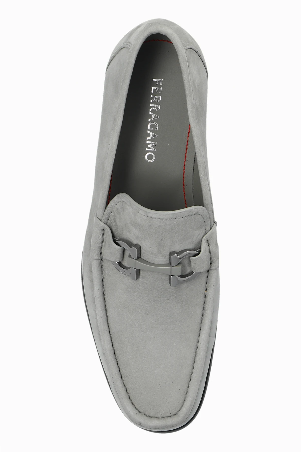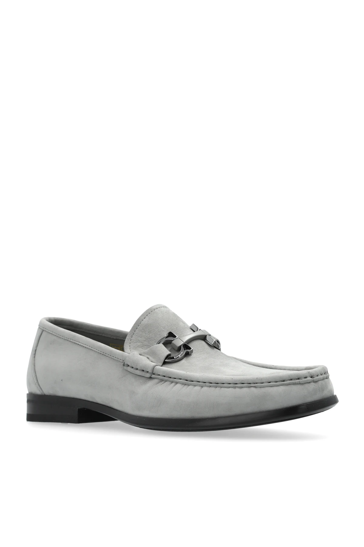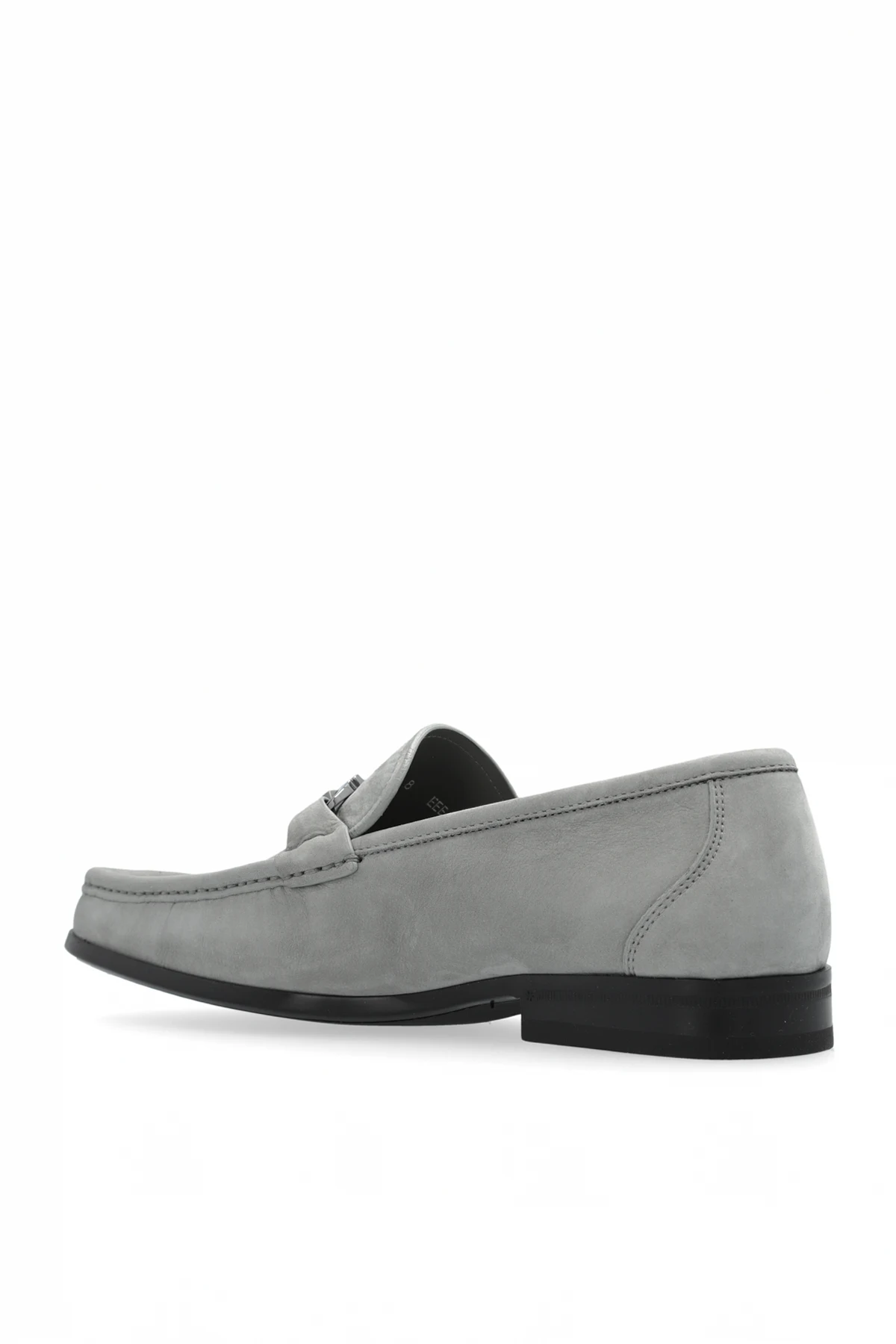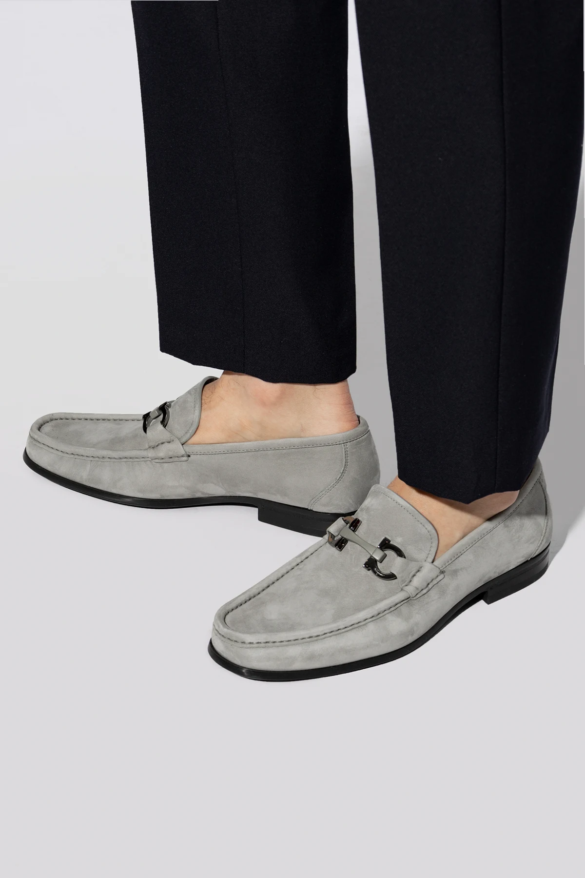Prezentujemy Państwu wykwintne skórzane buty męskie 'Grandioso2' od renomowanego projektanta FERRAGAMO , które stanowią kwintesencję elegancji i komfortu. Wykonane z najwyższej jakości zamszowej skóry, te szare mokasyny łączą w sobie klasyczny design z nowoczesnymi detalami, takimi jak metalowa klamra na wierzchu, dodając im wyrafinowanego charakteru.
