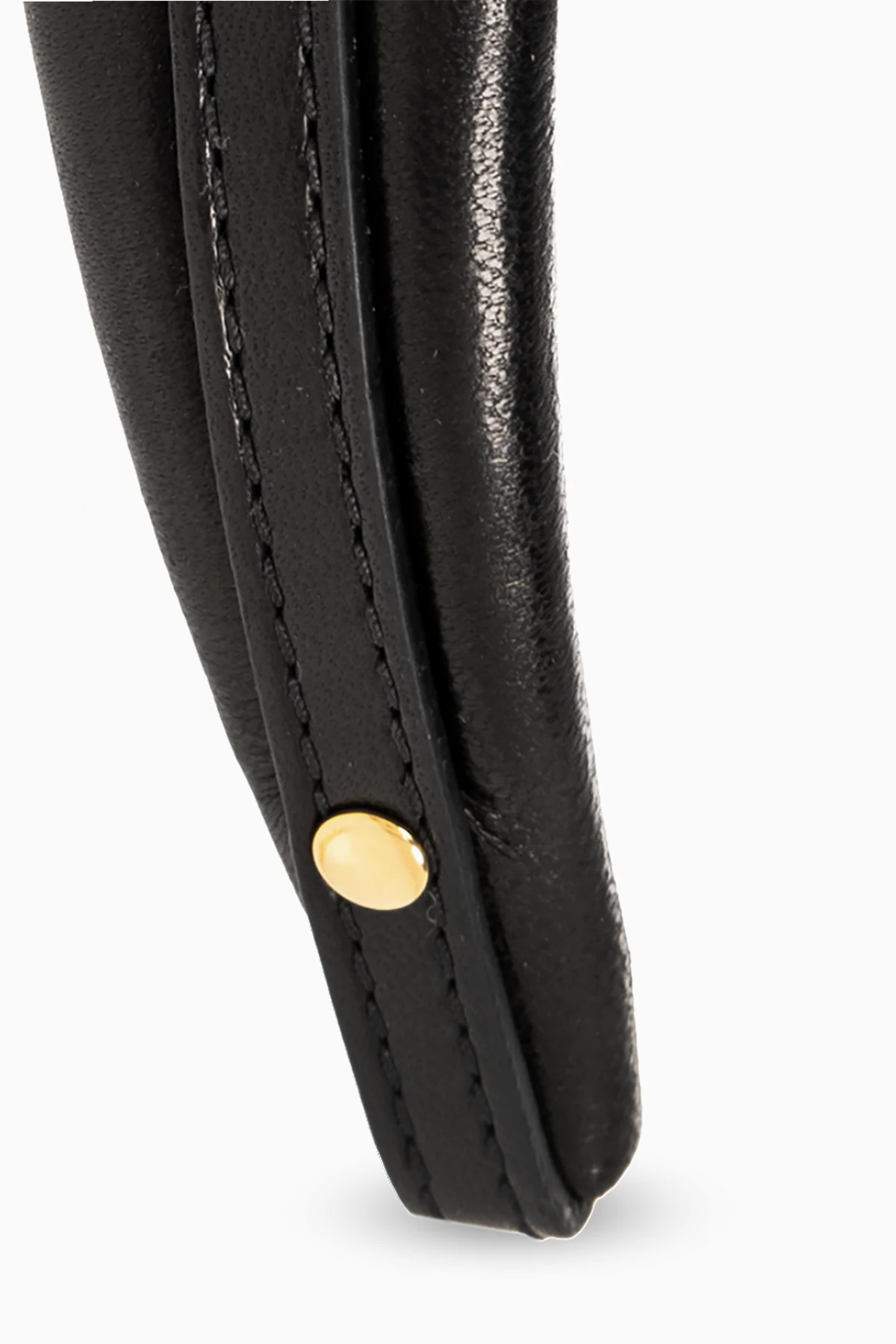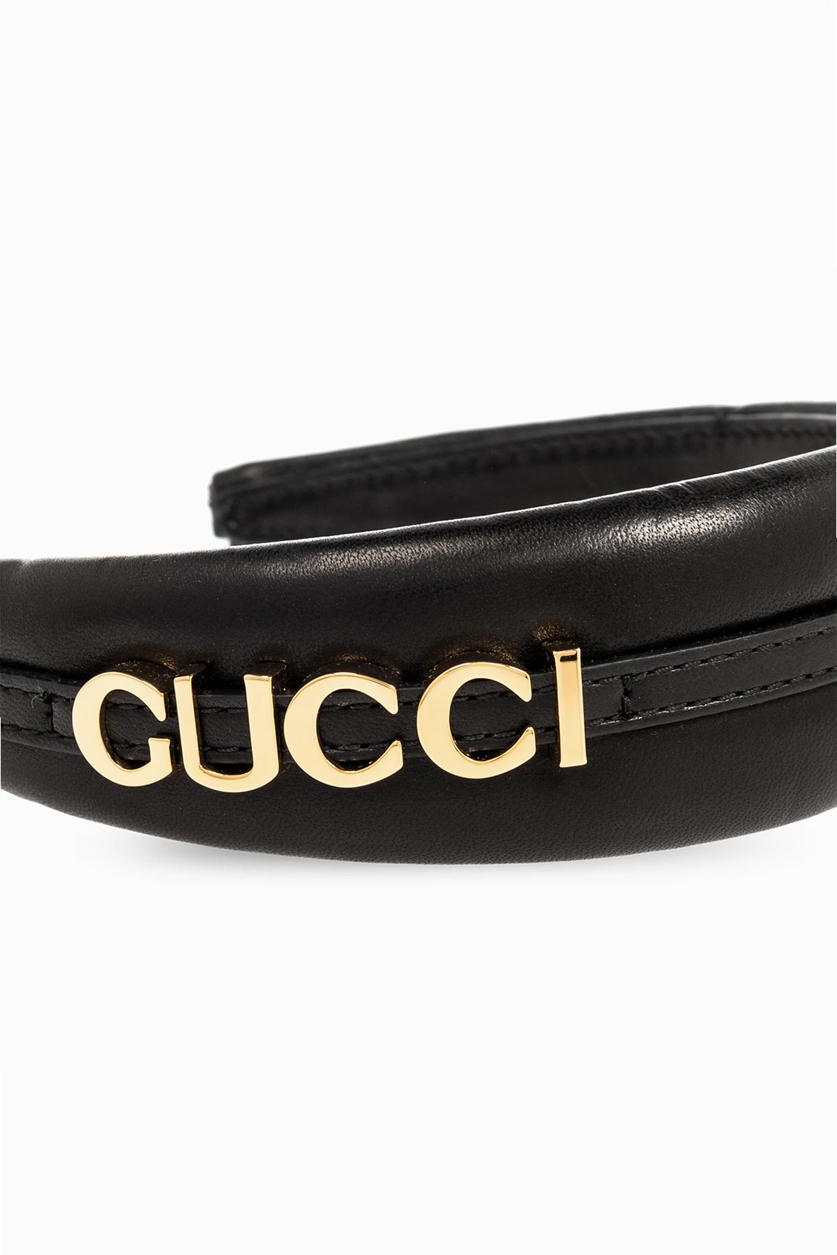 Czarna opaska na głowę Gucci. Wykonana z jagnięcej skóry. Ozdobiona metalową aplikacją w kształcie logo w kolorze złotym.