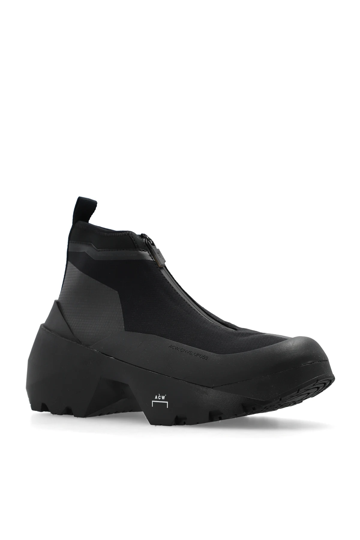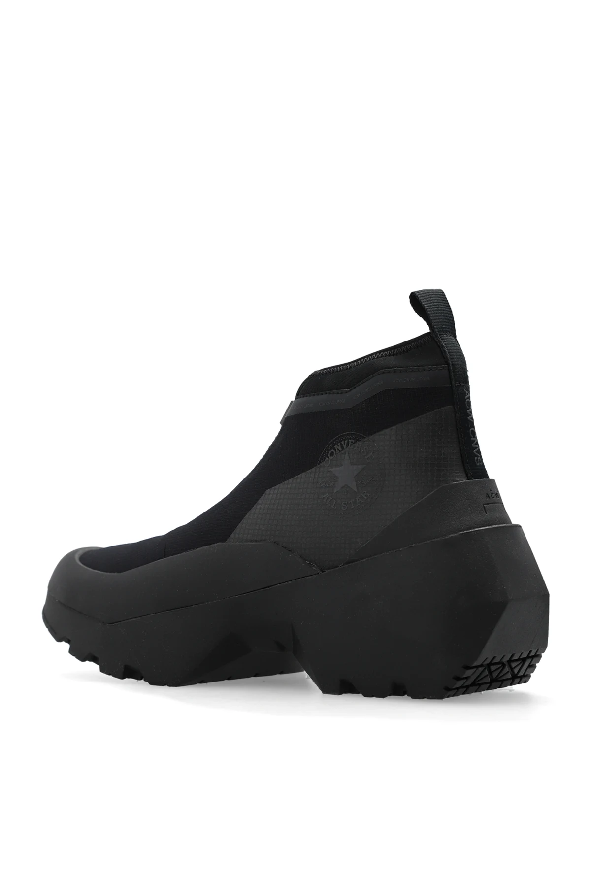 Czarne buty za kostkę na platformie, model 'Geo Forma’ Converse x A-COLD-WALL*. Wykonane z rozciągliwego materiału. Zapinane z przodu na zamek. Z tyłu i po bokach ozdobione logo. Czarna, gumowa podeszwa.