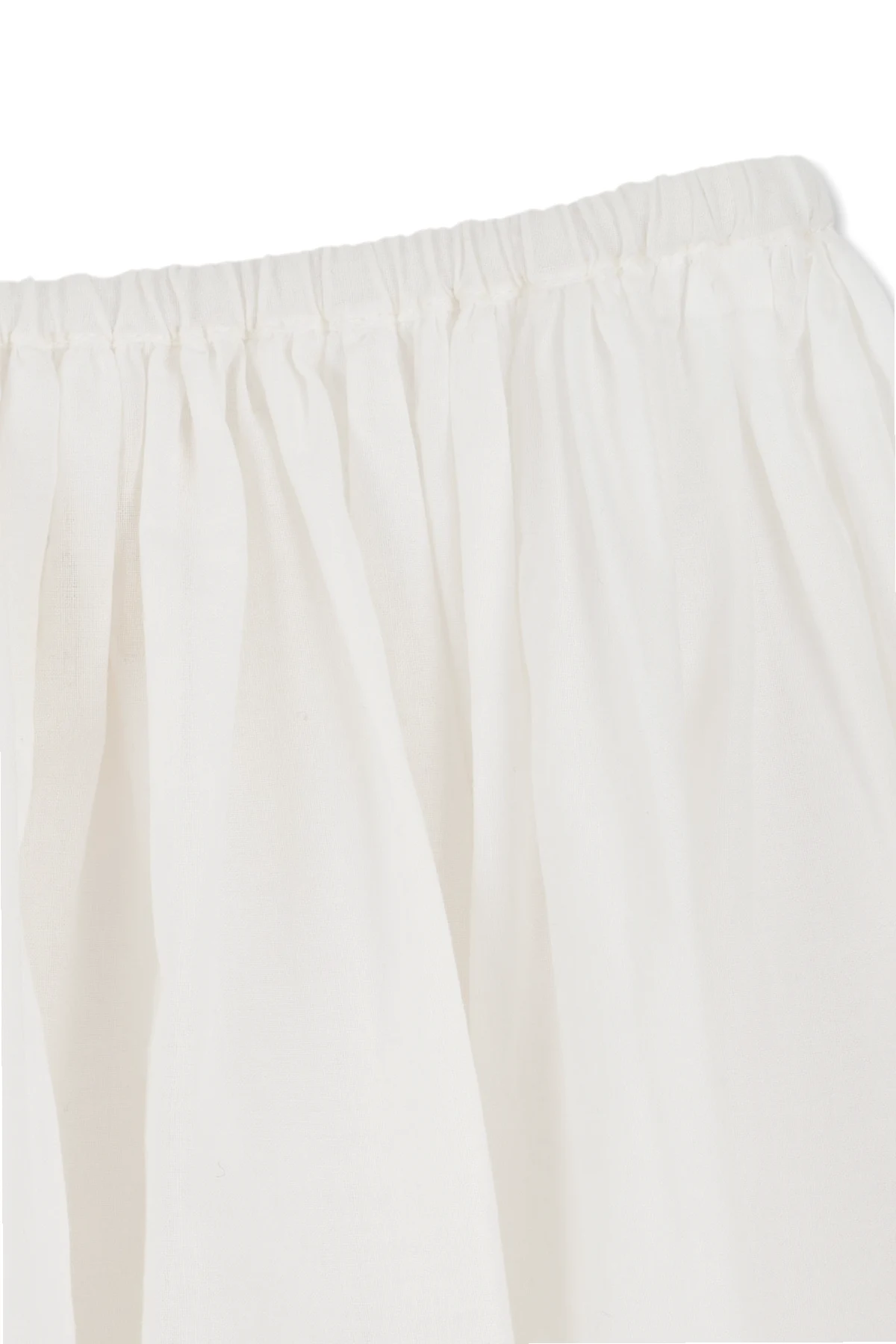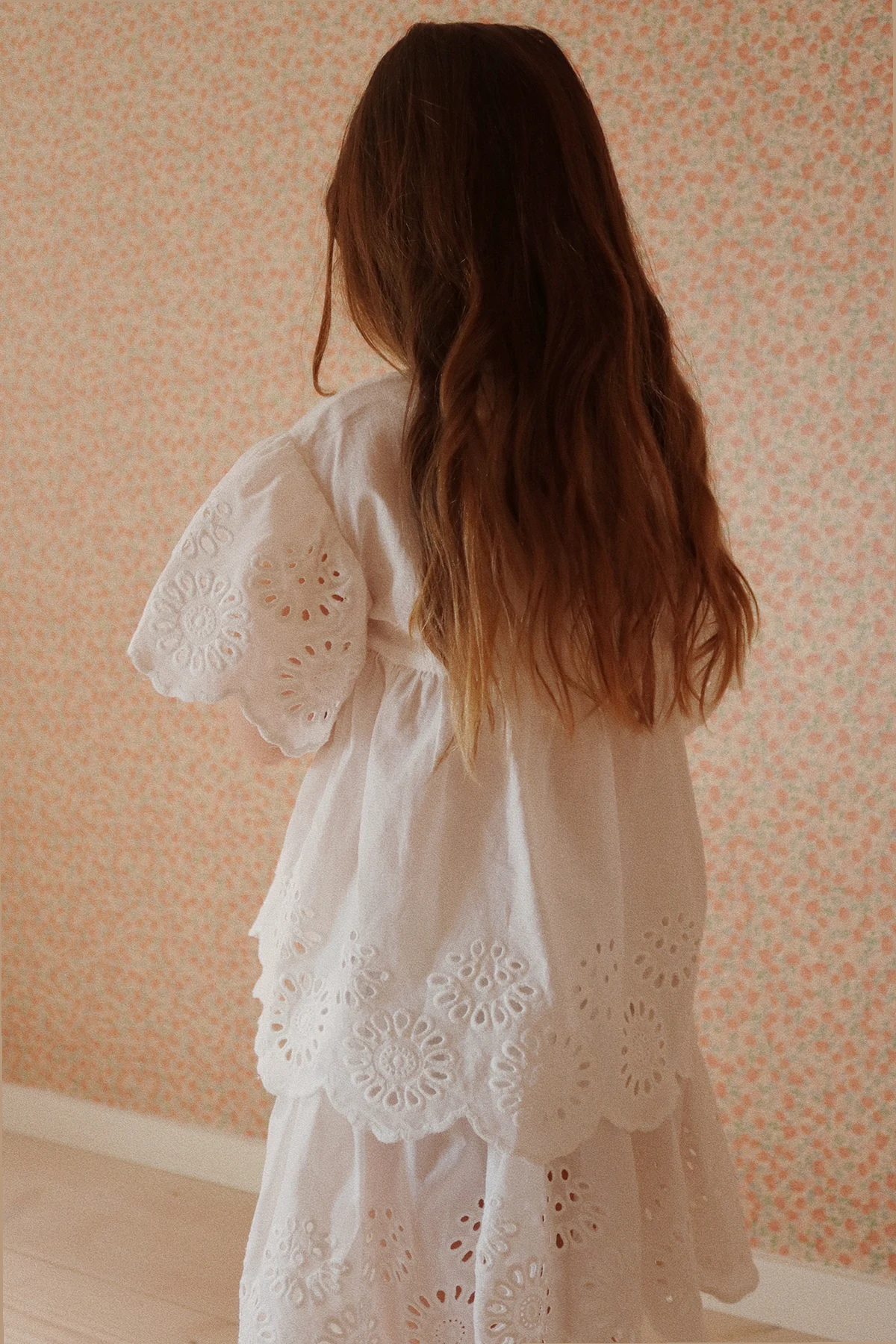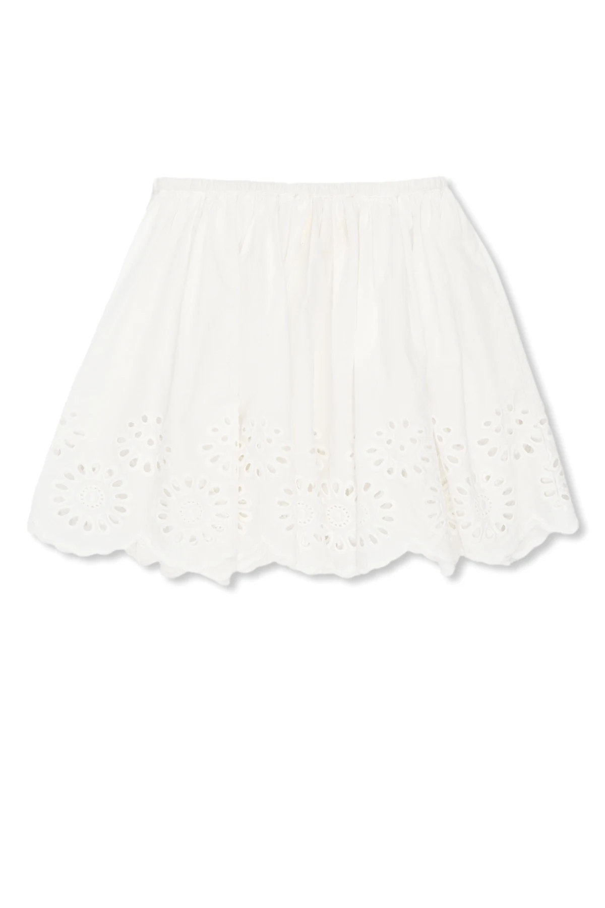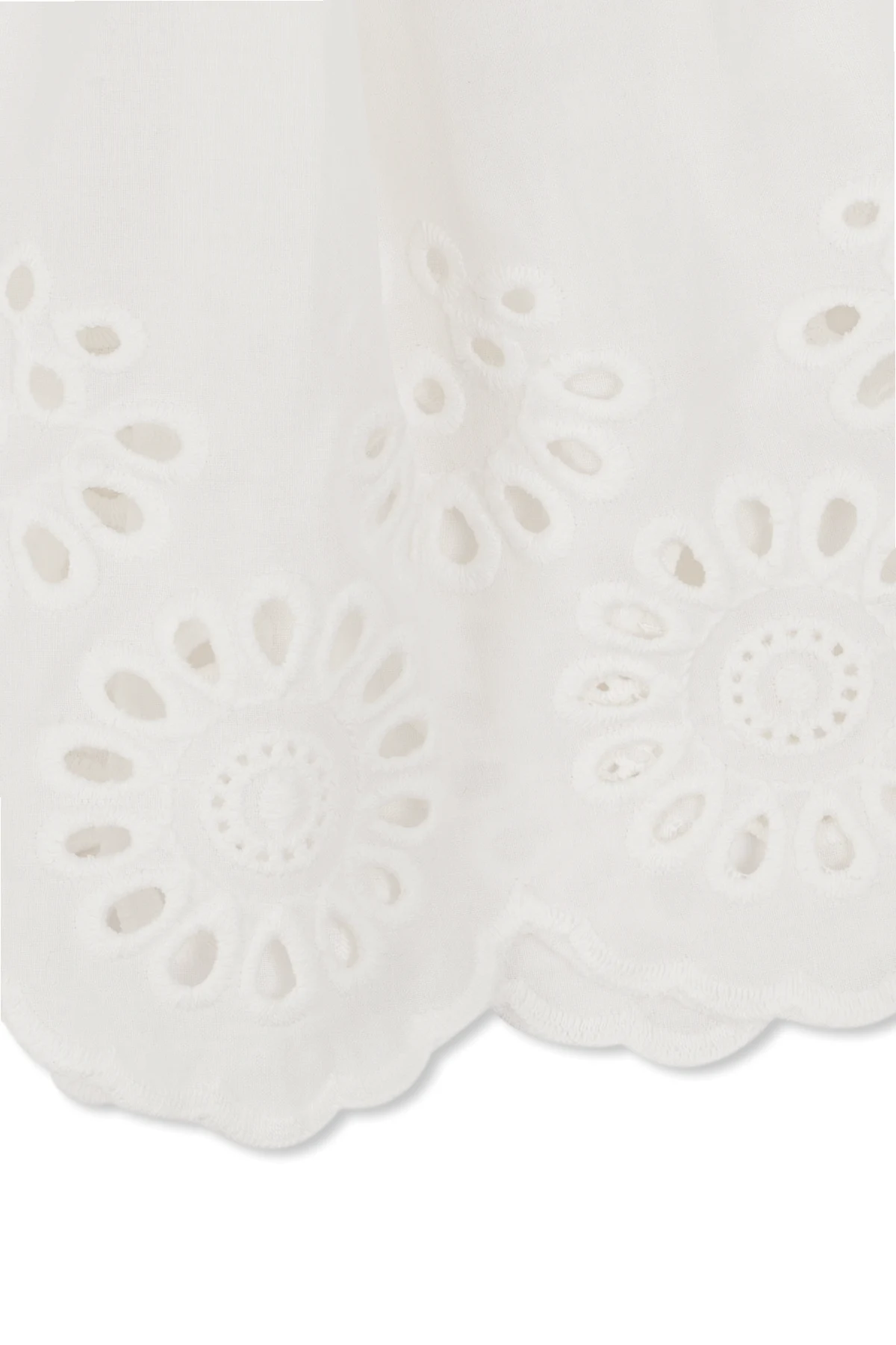 Charakterystyczny haft angielski , z jego precyzyjnie wycinanymi wzorami, nadaje spódnicy unikatowego charakteru, a rozkloszowany fason z delikatnie marszczonym pasem pięknie podkreśla sylwetkę, dodając objętości i lekkości. Krótka długość, sięgająca powyżej kolan, sprawia, że jest to idealny wybór na cieplejsze dni. Projektant Konges Sløjd pozostawia detale zapięcia spódnicy subtelnie ukryte, co dodaje całej kreacji minimalistycznego uroku.