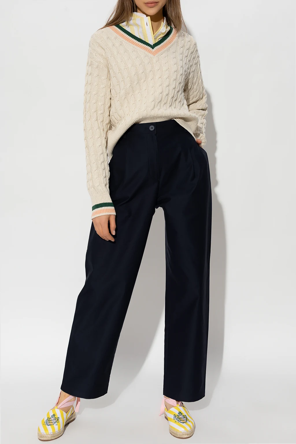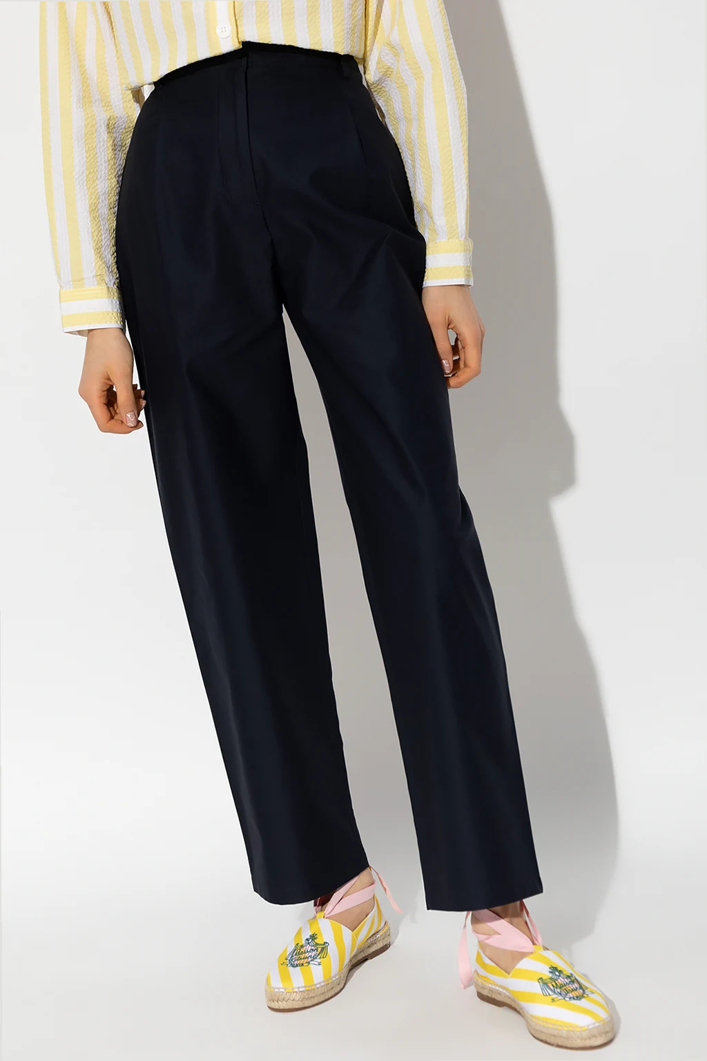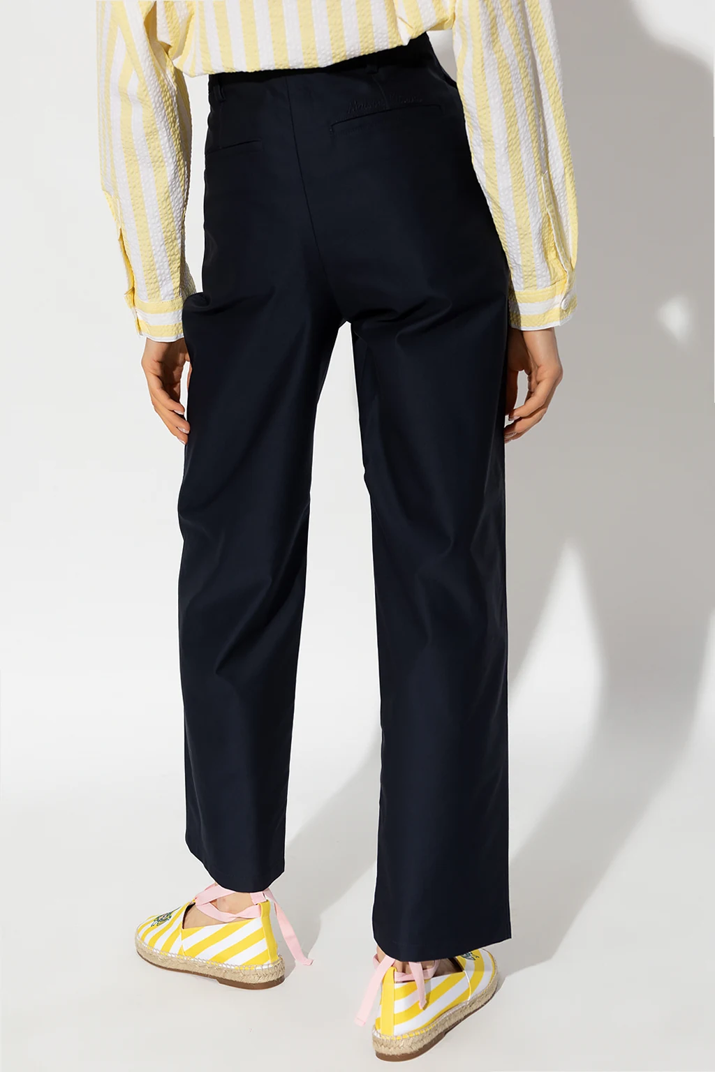 Granatowe spodnie o prostym kroju Maison Kitsune. Wykonane z bawełny. Zapinane na zamek i guzik. Z tyłu wyszyte logo. Cztery wsuwane kieszenie. Długie nogawki.