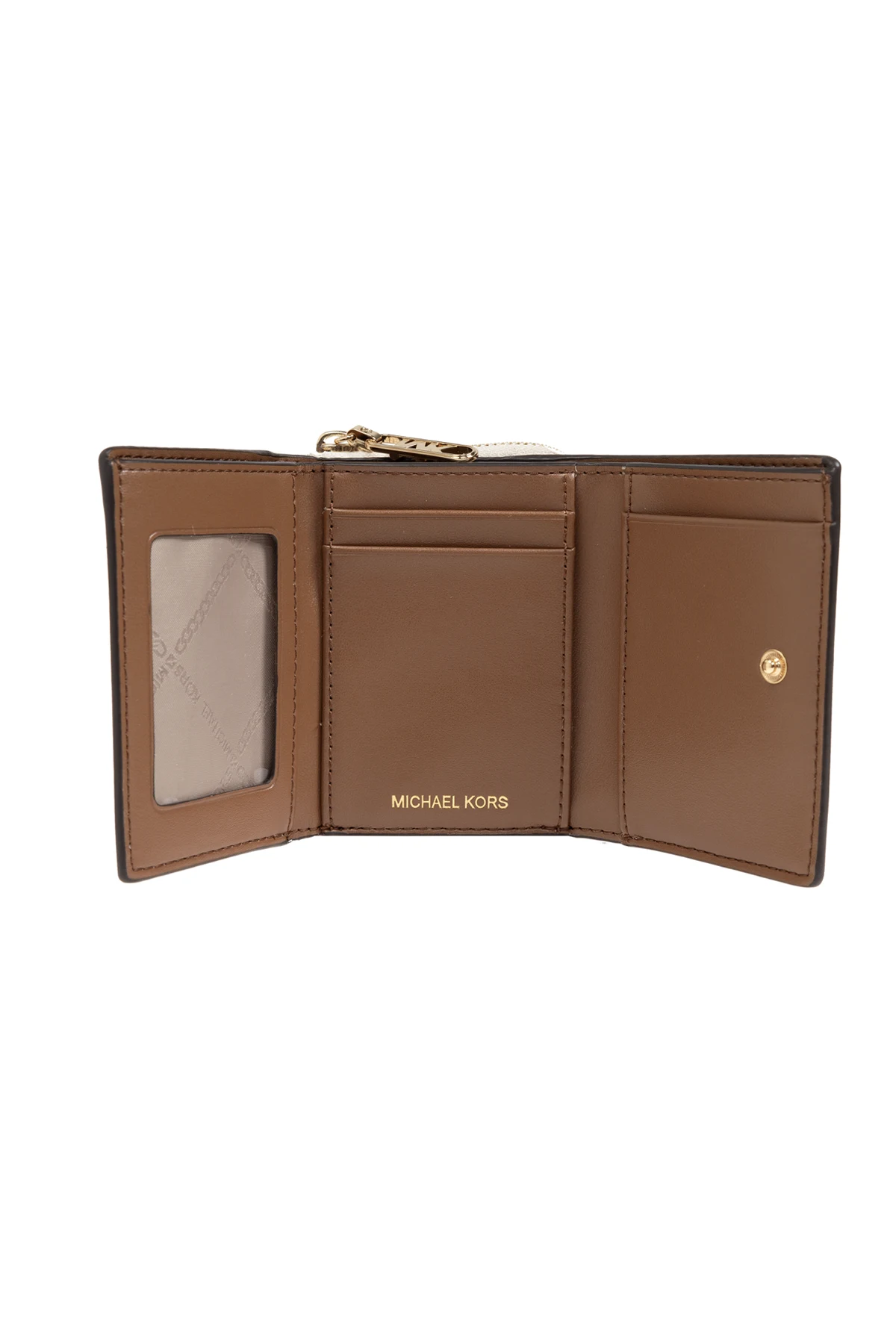 Portfel posiada zapięcie na zamek błyskawiczny oraz dodatkowe zapięcie na zatrzask, co zapewnia bezpieczeństwo przechowywanych w nim przedmiotów. Wnętrze portfela, utrzymane w eleganckim brązowym kolorze, zawiera różne przegrody na karty oraz przeźroczystą kieszeń na dokumenty. Dodatkowo, logotyp Michael Kors nadrukowany na jednej z przegródek oraz metalowy zamek błyskawiczny z zawieszką w kształcie litery "MK" dodają portfelowi ekskluzywnego charakteru.