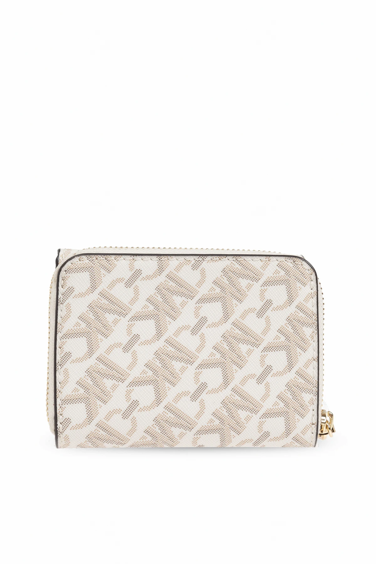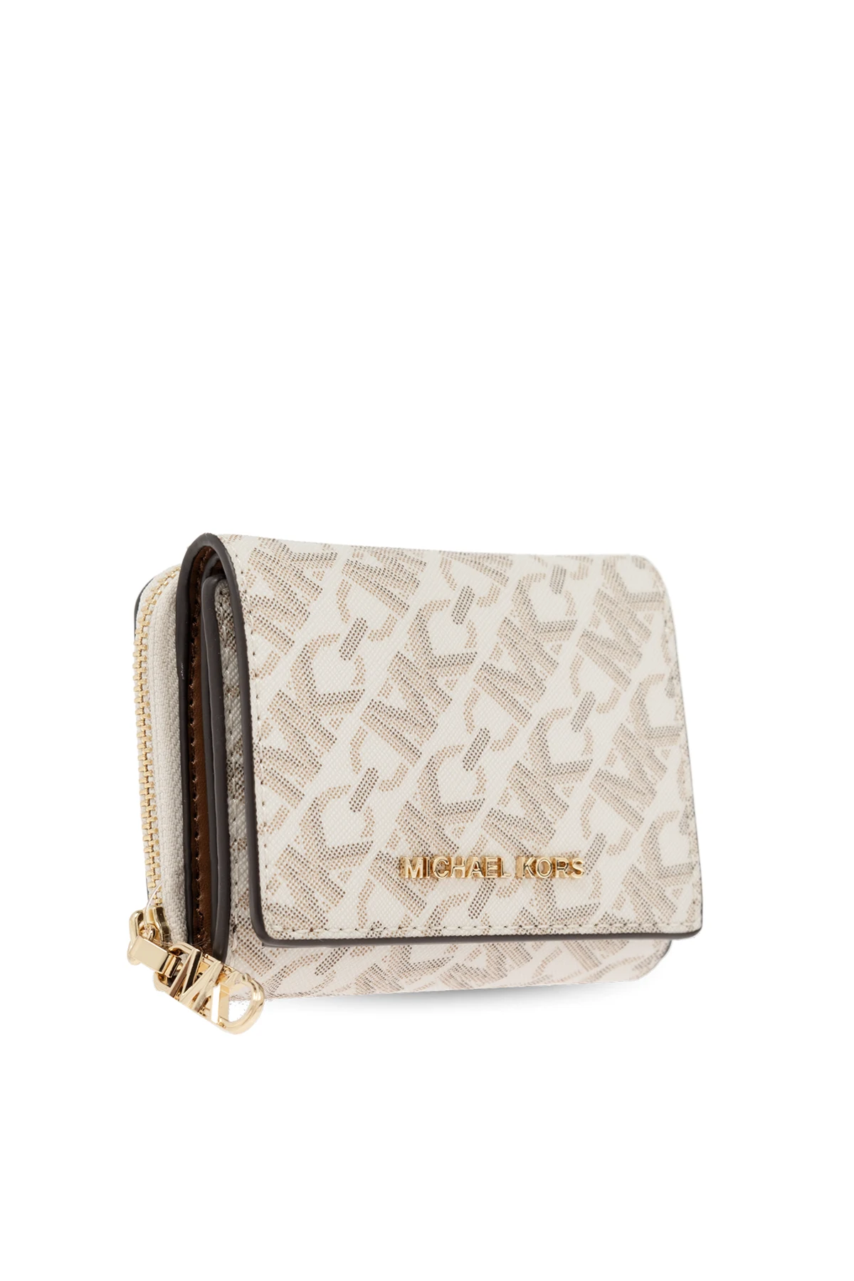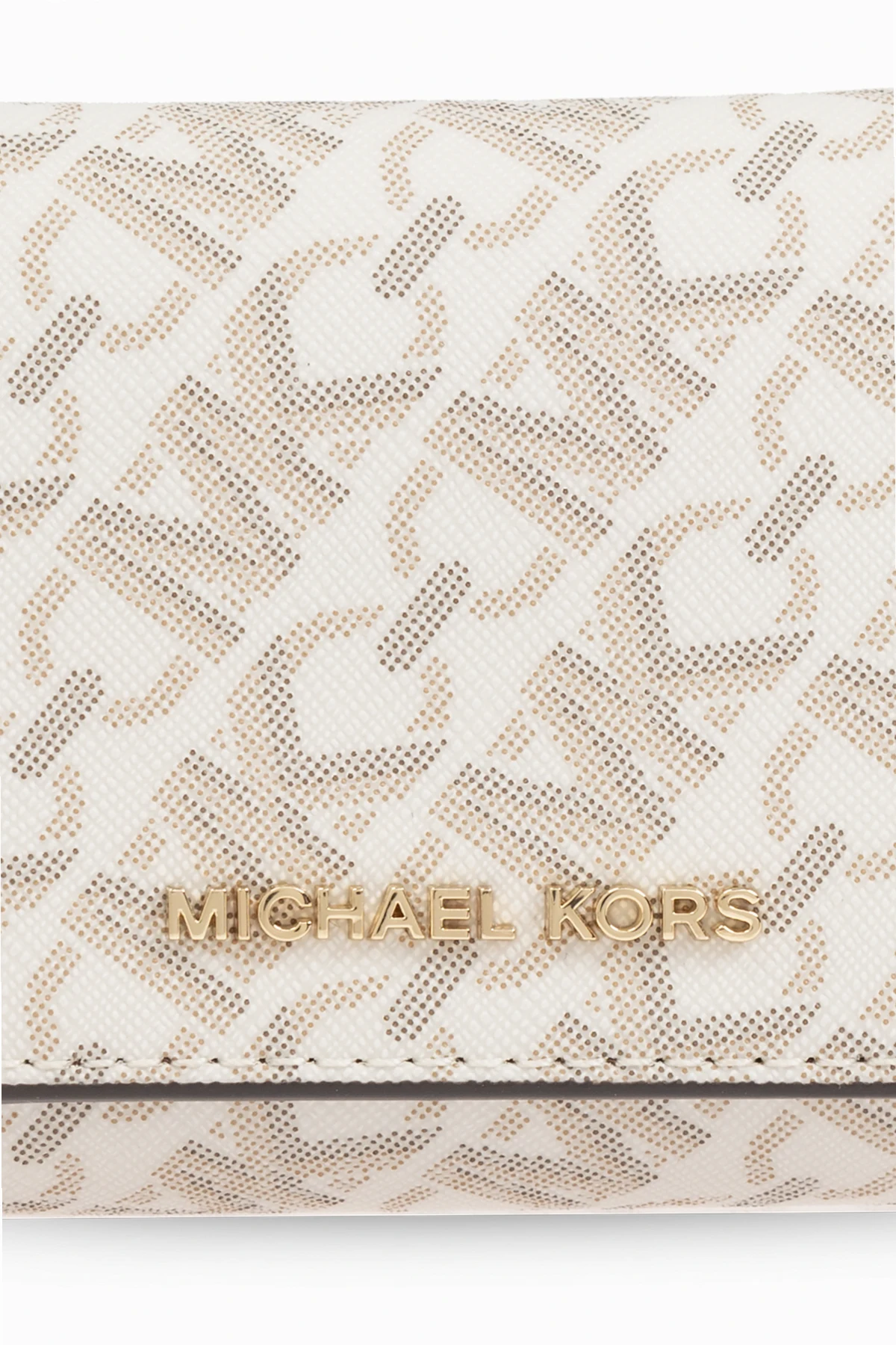 Wykonany z wysokiej jakości kremowego materiału z beżowym nadrukiem, portfel zachwyca subtelnym wzorem składającym się z powtarzających się liter "MK" ułożonych w diagonalny sposób. Na przedniej klapce znajduje się złoty napis "MICHAEL KORS", który podkreśla prestiż produktu.