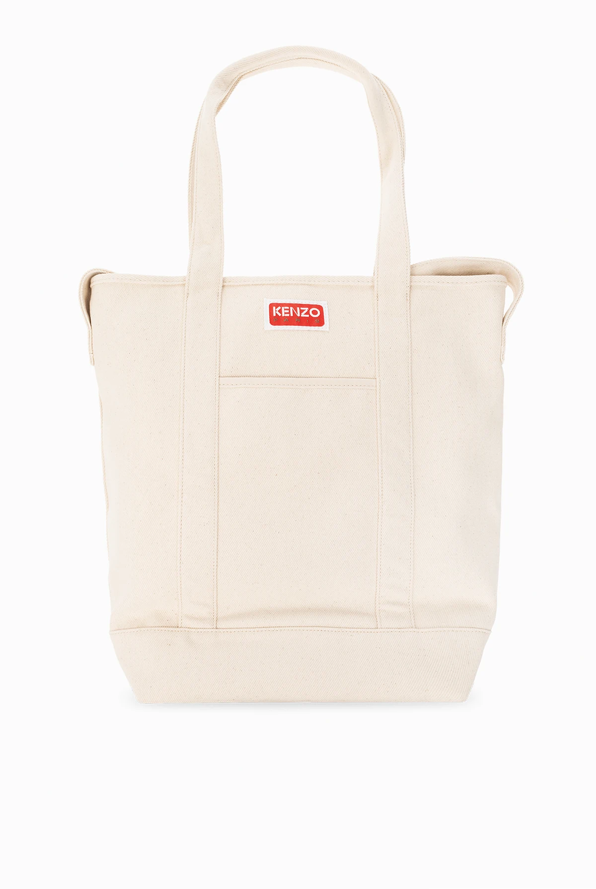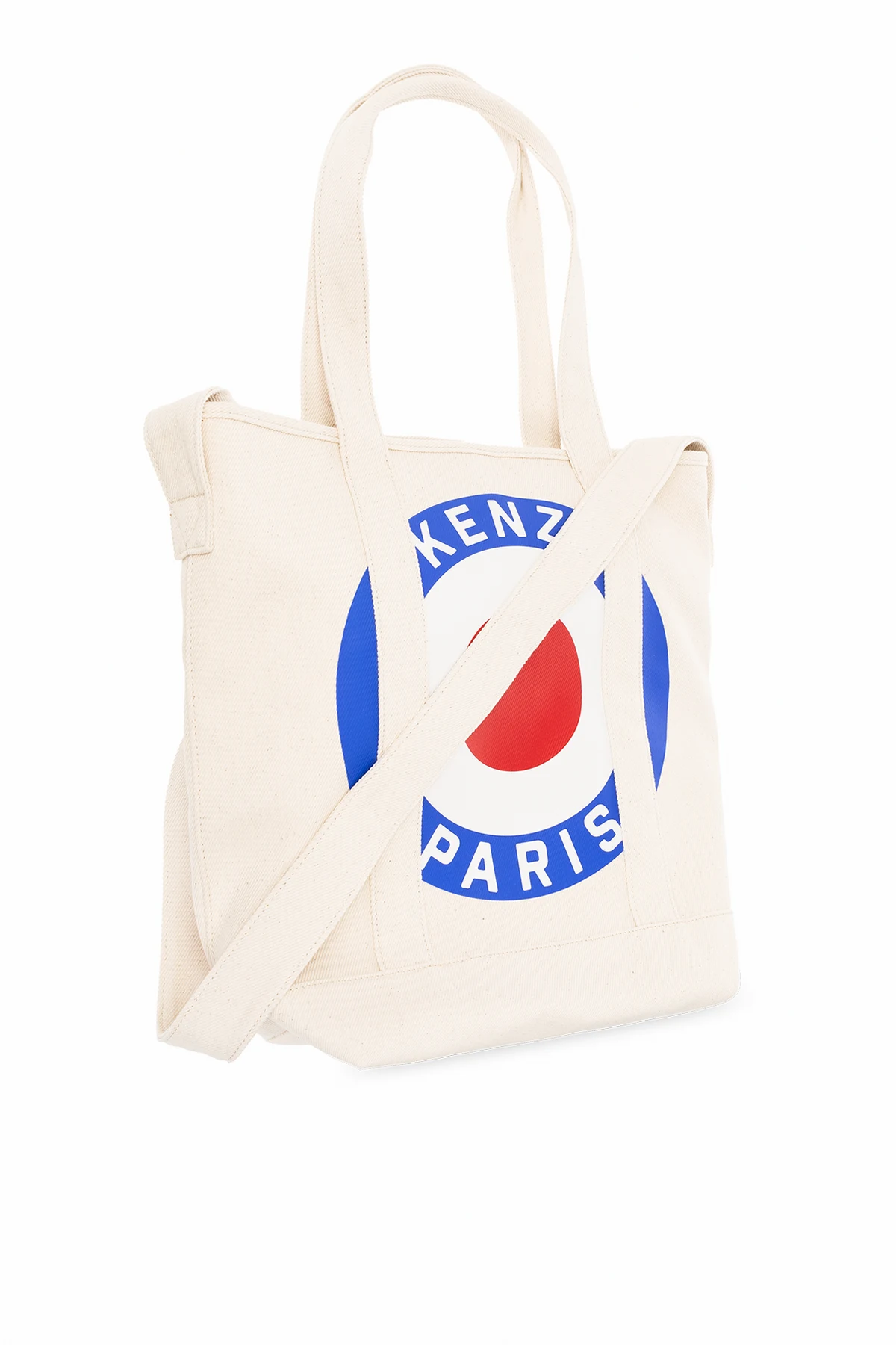 Kremowa torba typu 'shopper' Kenzo. Wykonana z bawełny. Zapięcie na karabińczyk. Ozdobiona nadrukowanym logo oraz wzorem. Z tyłu wsuwana kieszeń. Dwie półokrągłe rączki oraz jedna dłuższa. Wewnątrz komora oraz wsuwana kieszeń. Metalowe elementy w kolorze srebrnym.