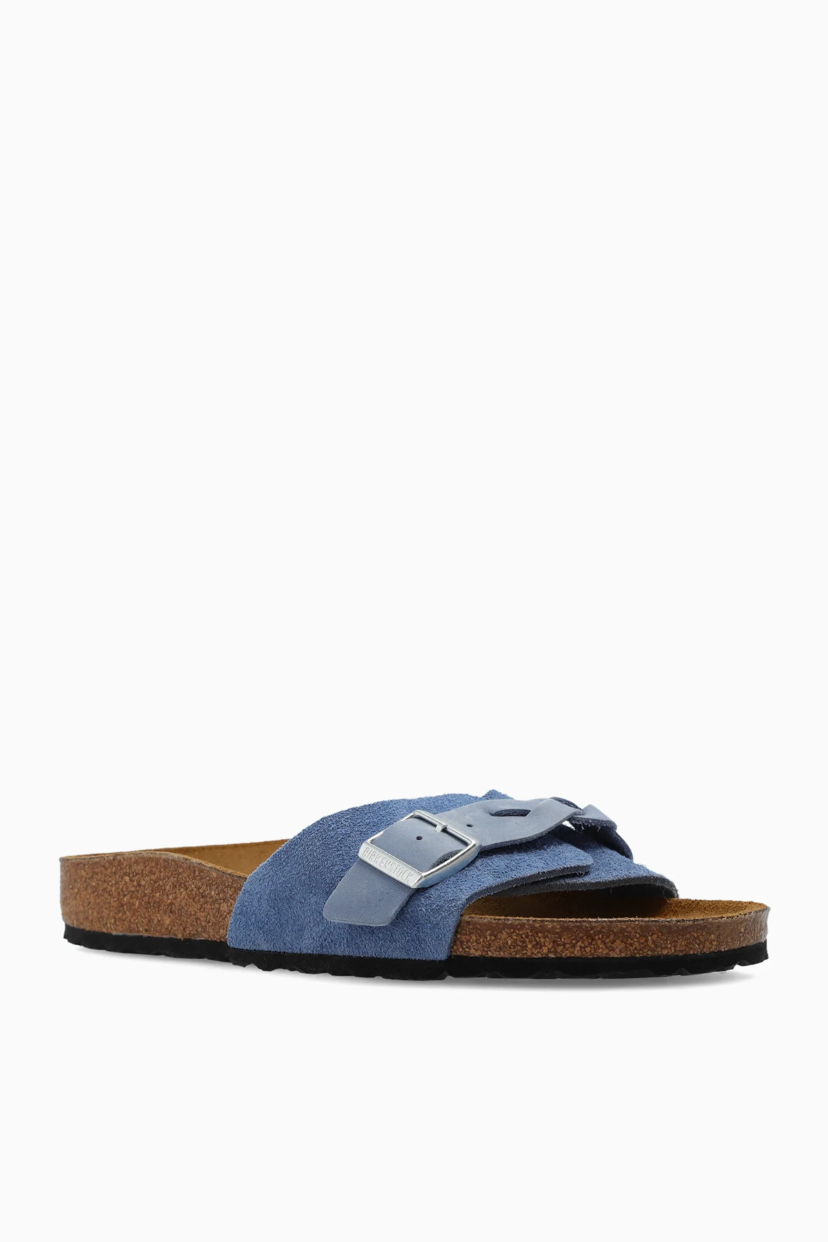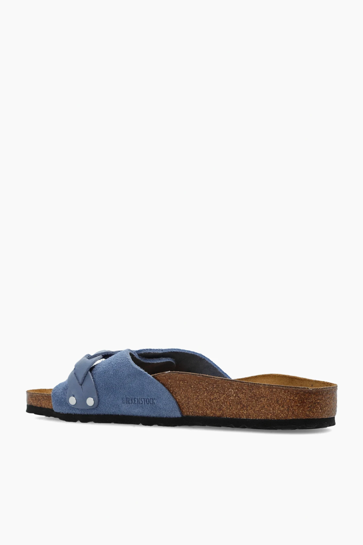 Niebieskie klapki, model ‘Oita Braided’ Birkenstock. Wykonane z zamszu i nubuku. Zapinane na pleciony pasek z klamrą. Ozdobione wytłoczonym logo. Anatomicznie ukształtowana wkładka korkowo-lateksowa o zwężanej szerokości. Brązowo-czarna podeszwa wykonana z naturalnego korka oraz pianki EVA.