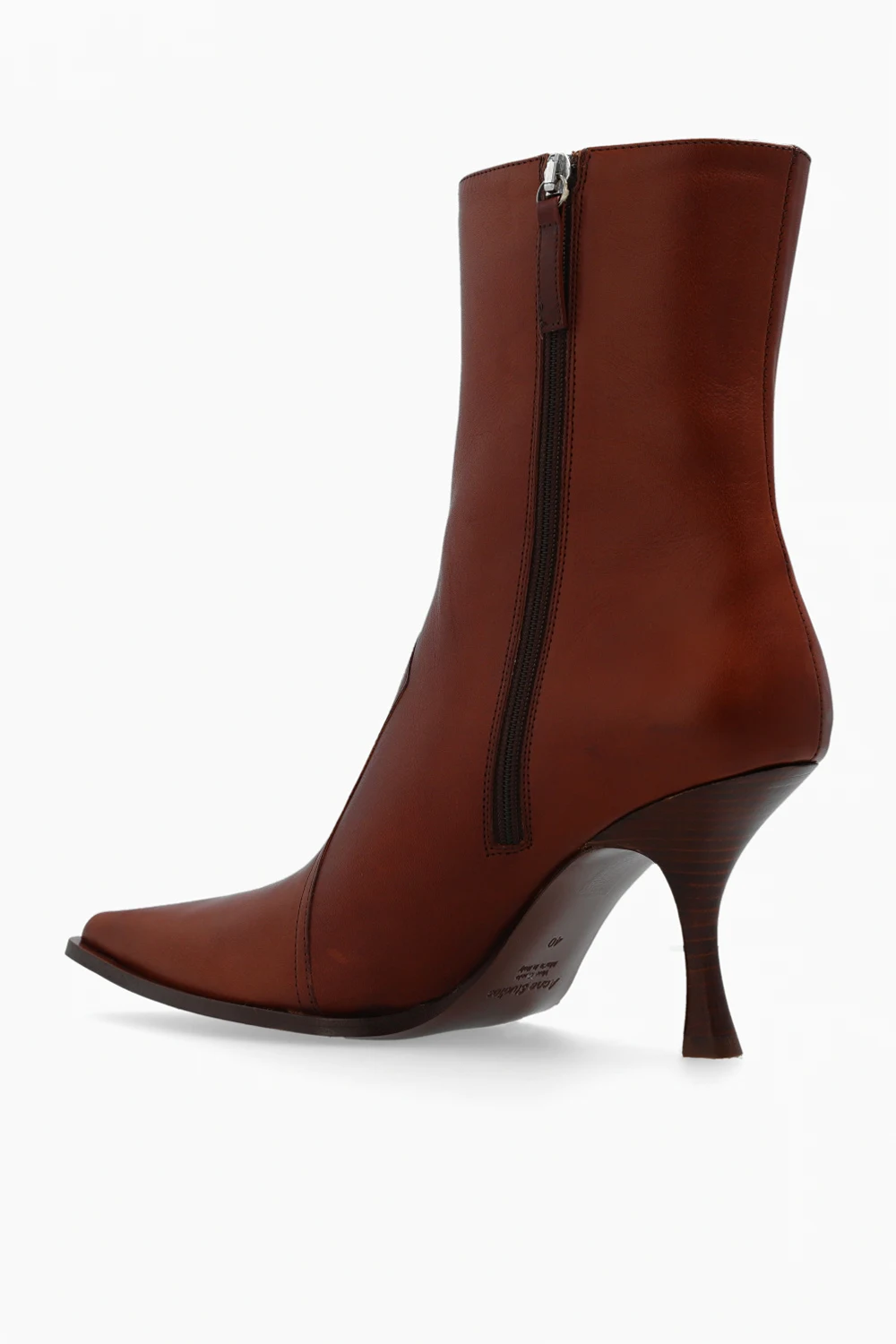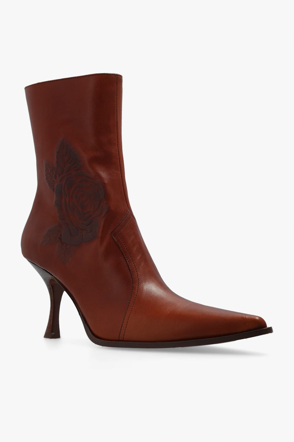 Brązowe botki na obcasie Acne Studios. Wykonane ze skóry. Z boku zapinane na zamek. Ozdobione wypukłym wzorem z motywem róży. Nosek w szpic. Brązowa, skórzana podeszwa.