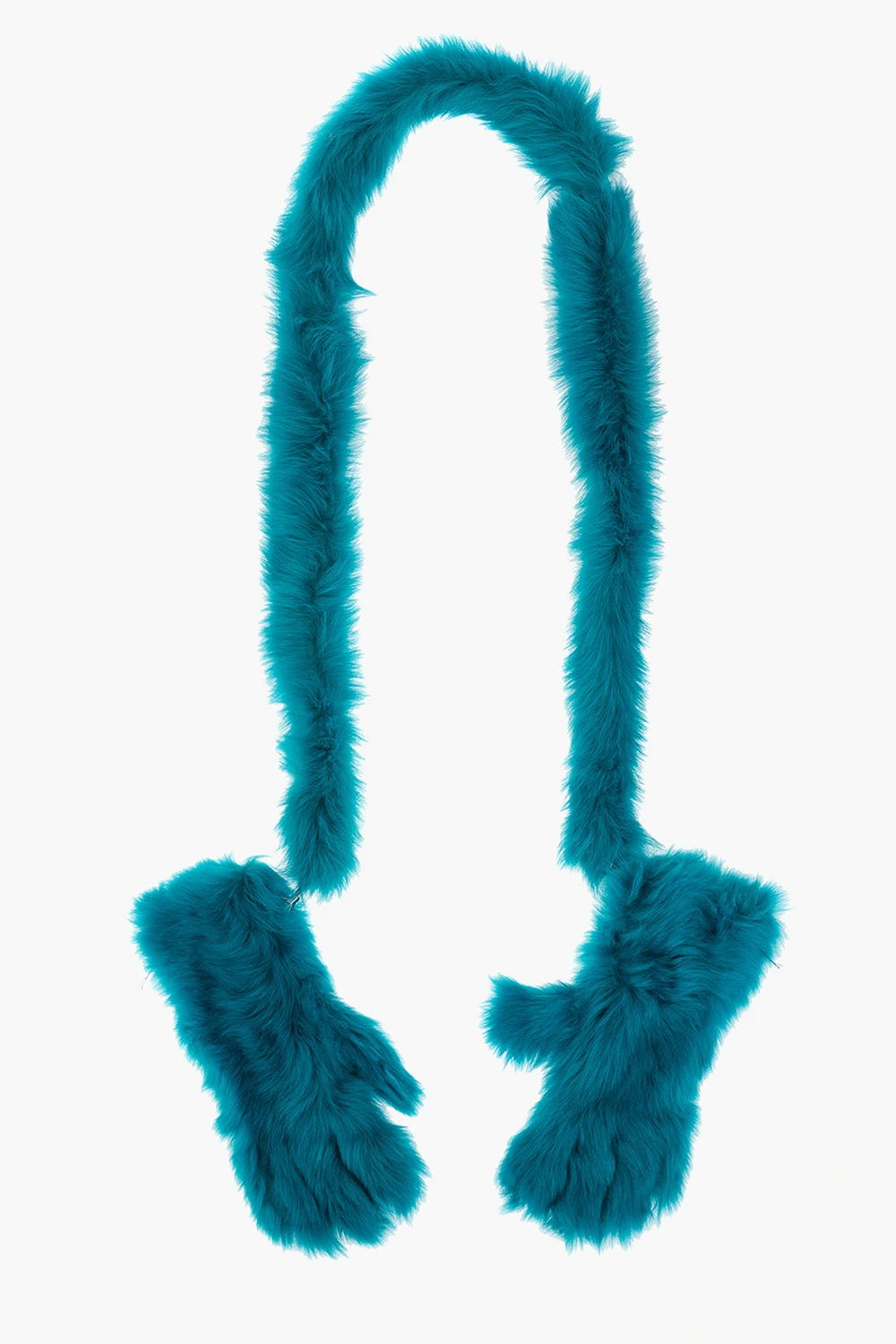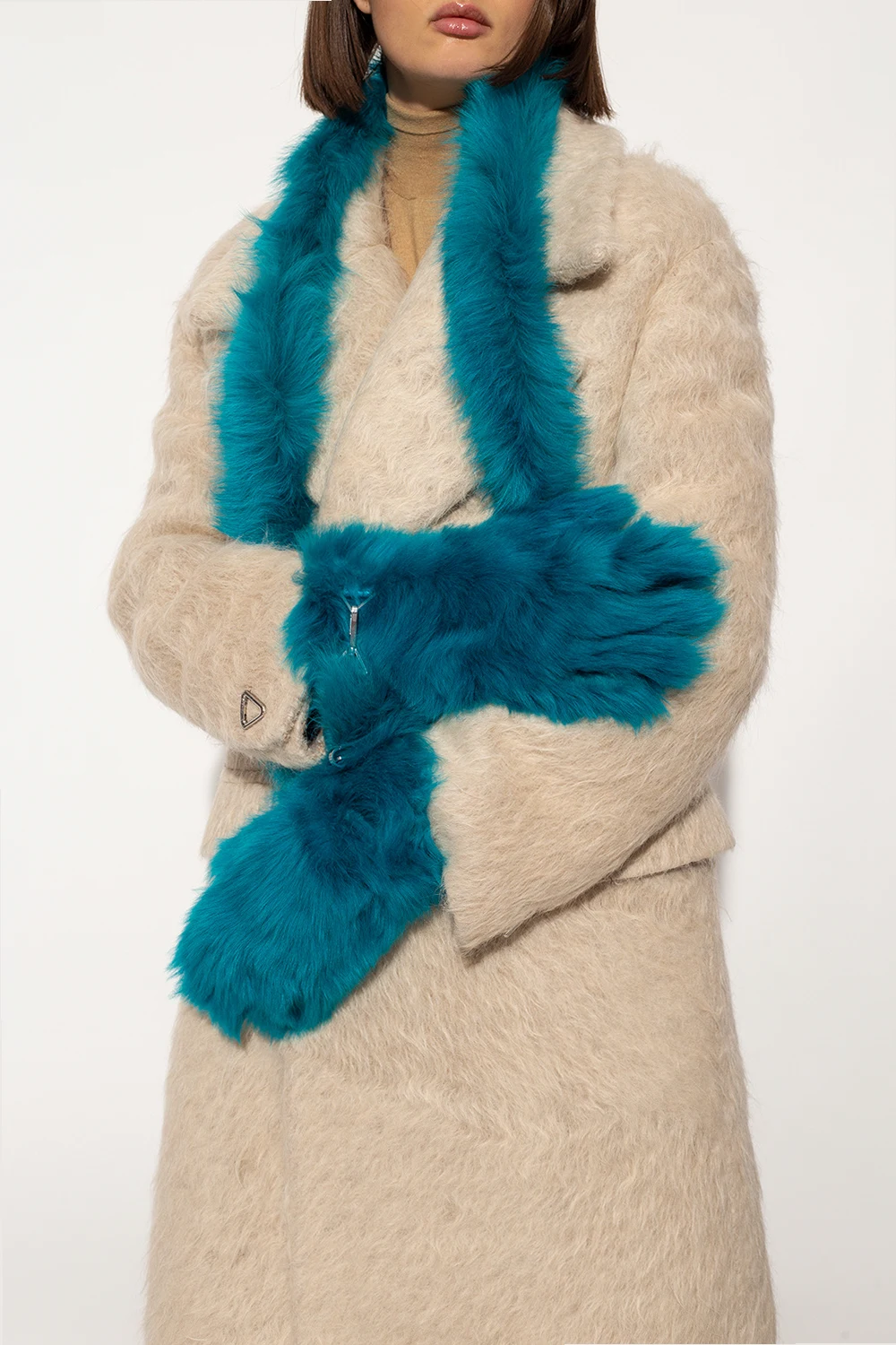 Niebieskie rękawiczki Bottega Veneta. Wykonane z futra jagnięcego. Odpinany pasek.