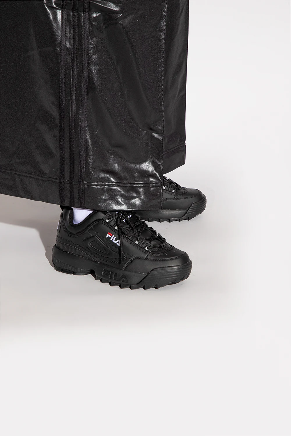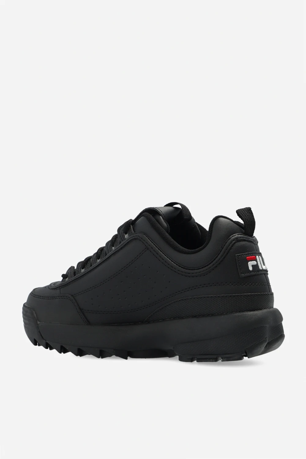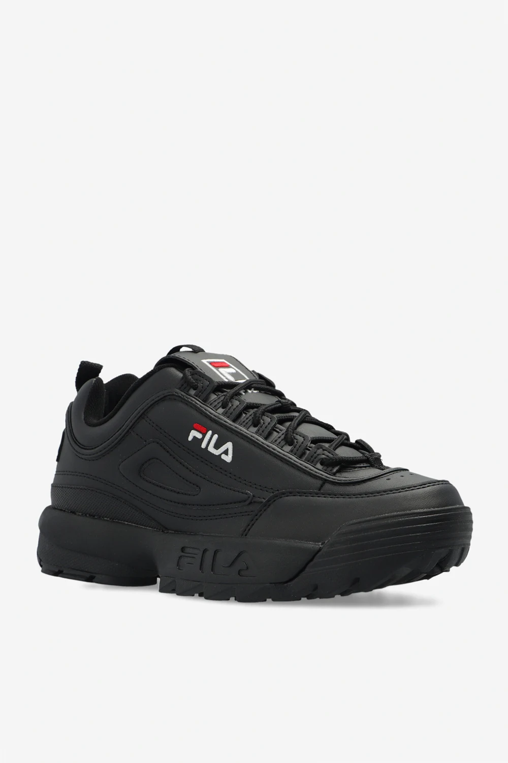 Czarne, sznurowane buty sportowe, model ‘Disruptor’ Fila. Wykonane z materiału imitującego skórę. Ozdobione wyszytym logo. Czarna, gumowa podeszwa.