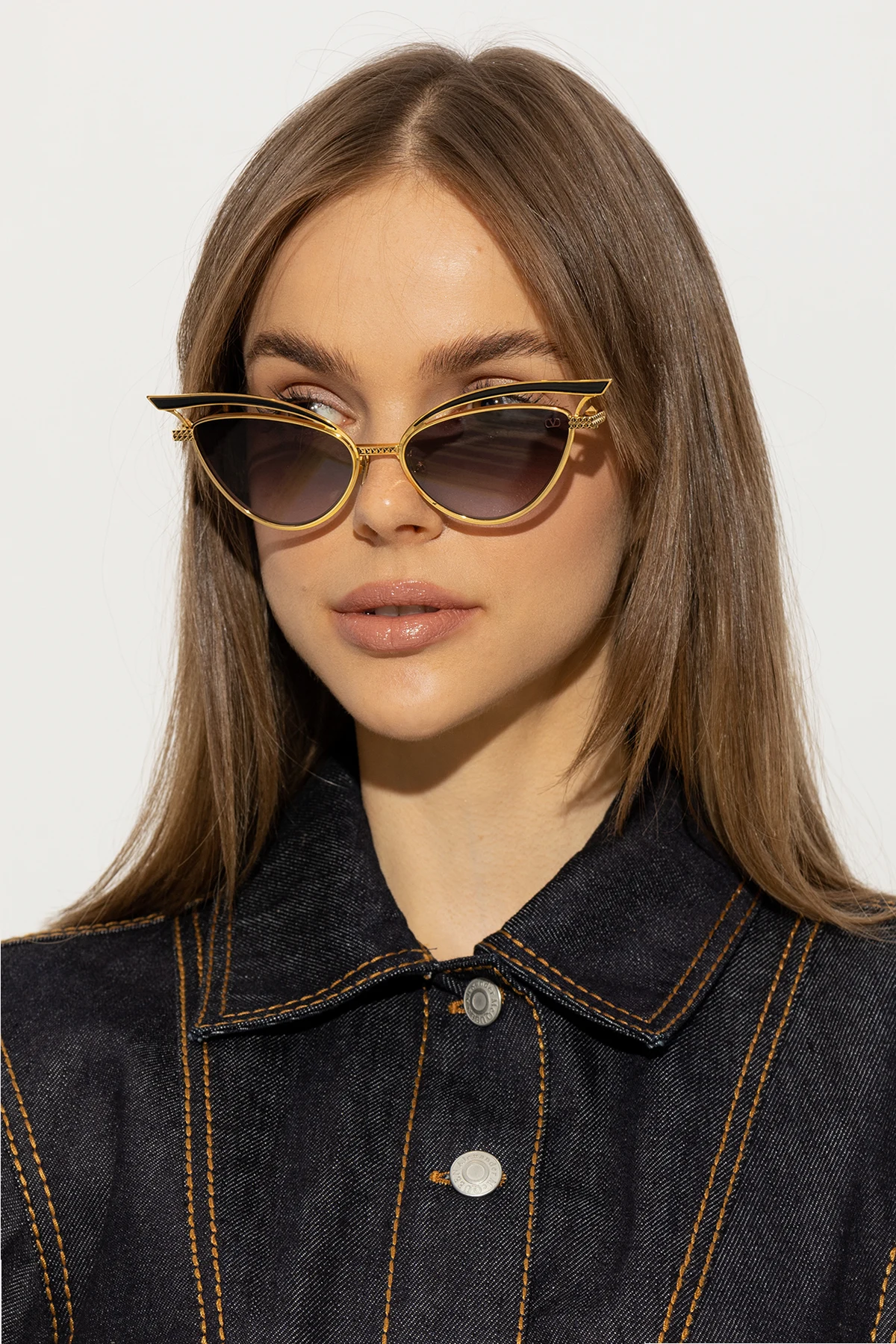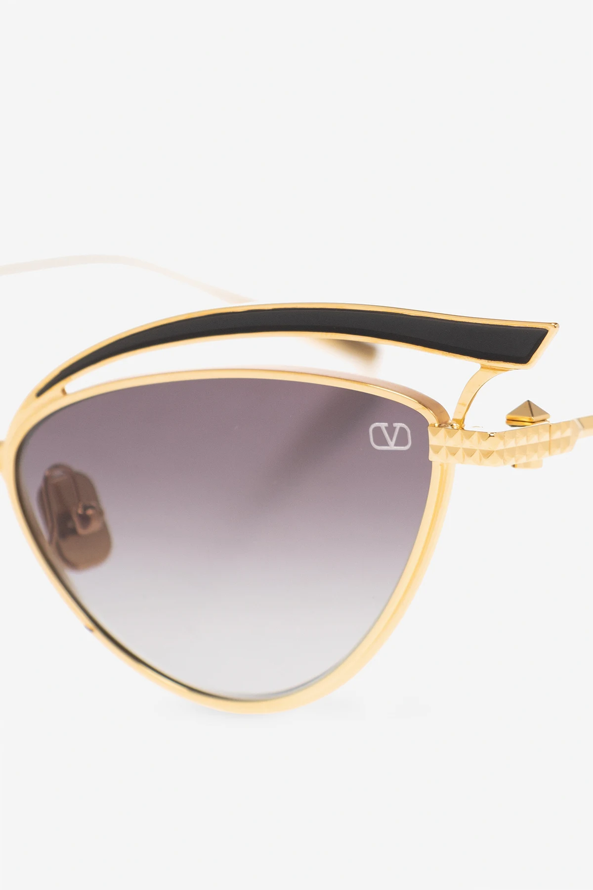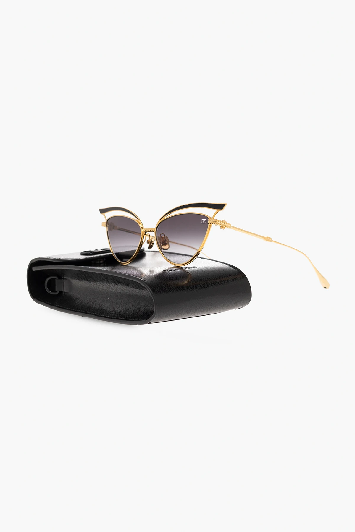 Okulary przeciwsłoneczne w kolorze złoto-czarnym, model ‘V’ Valentino Eyewear. Wykonane z tytanu. Oprawki w kształcie kocich oczu z wycięciem. Dekoracyjne wykończenie. Na zauszniku logo. Szare, gradientowe soczewki ze 100% ochroną przez promieniowaniem UV. Dołączone etui.