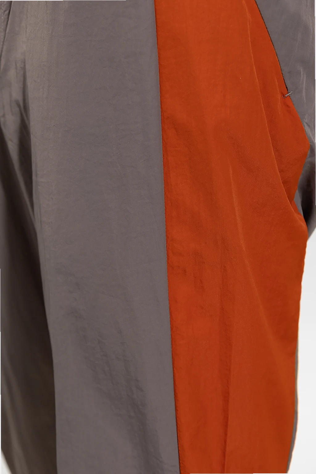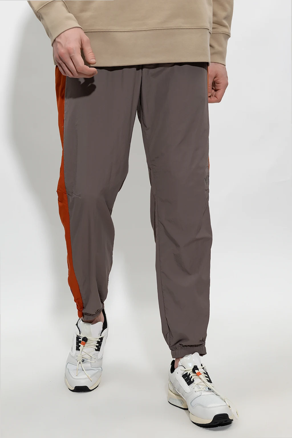 Brązowo-pomarańczowe spodnie dresowe Y-3 Yohji Yamamoto. Wykonane z bardzo lekkiego materiału. W pasie wszyta guma ściągana trokami. Z przodu zapięcie na zamek kryte plisą. Cztery kieszenie zapinane na zamek. Długie nogawki zakończone ściągaczem.