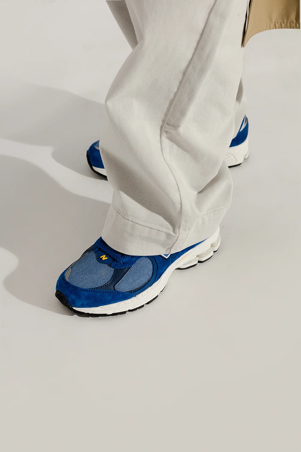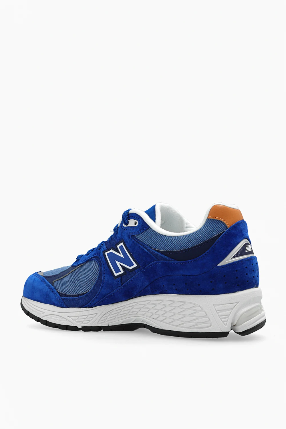 Niebiesko-białe, sznurowane buty sportowe, model ‘M2002REA’ New Balance. Wykonane ze skóry i materiału. Ozdobione aplikacją z logo oraz oznaczeniem serii modelu. Biała, gumowa podeszwa.