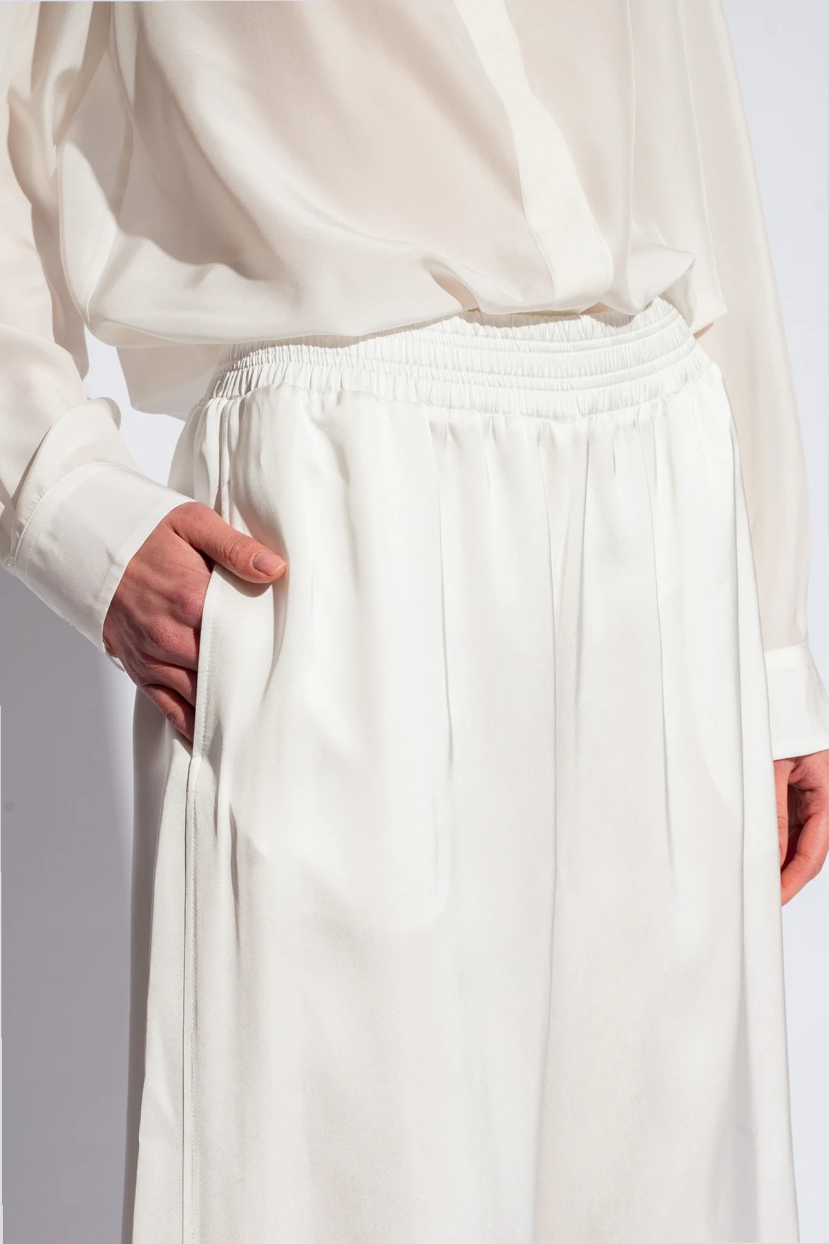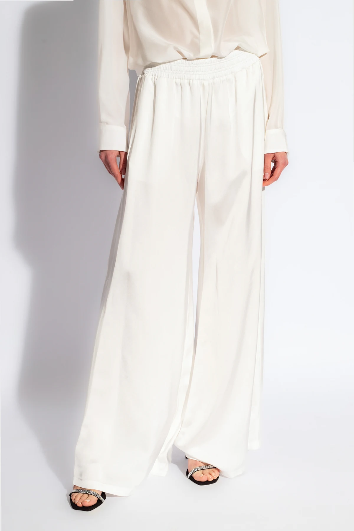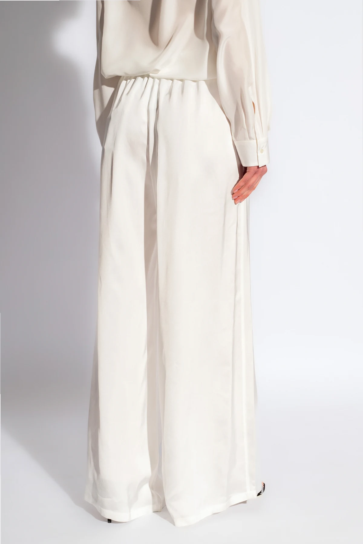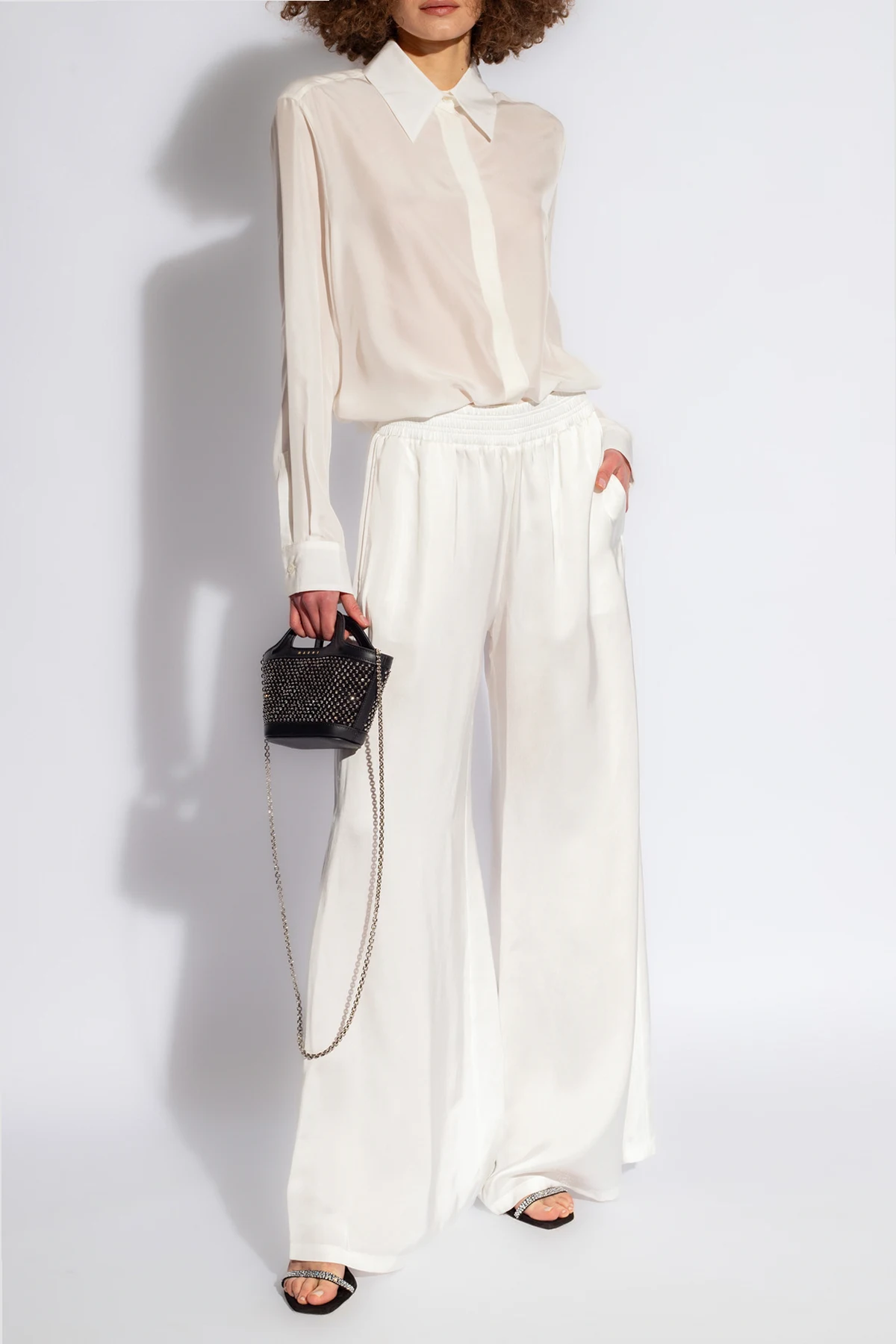 Białe, satynowe spodnie Fabiana Filippi. W pasie wszyta guma. Dwie wsuwane kieszenie. Długie, szerokie nogawki.