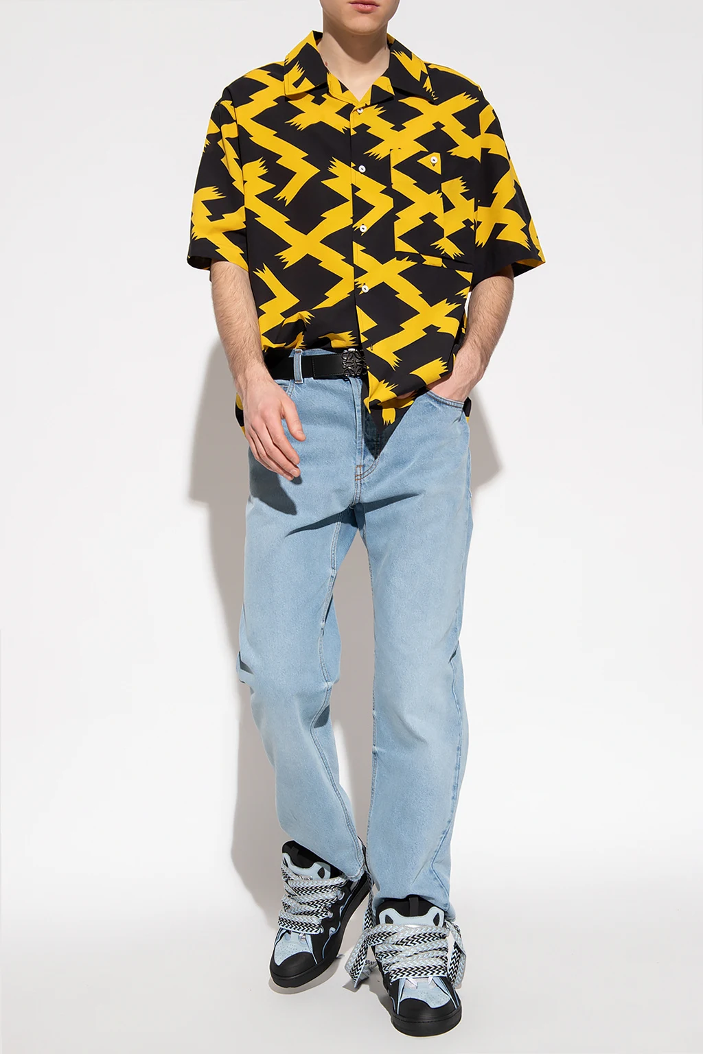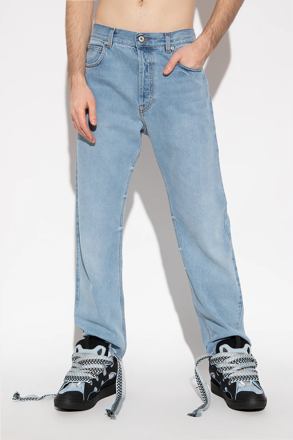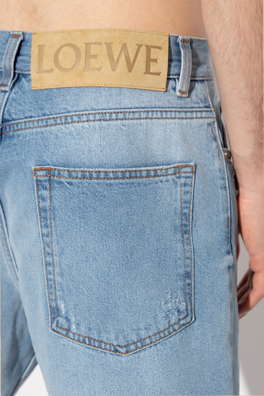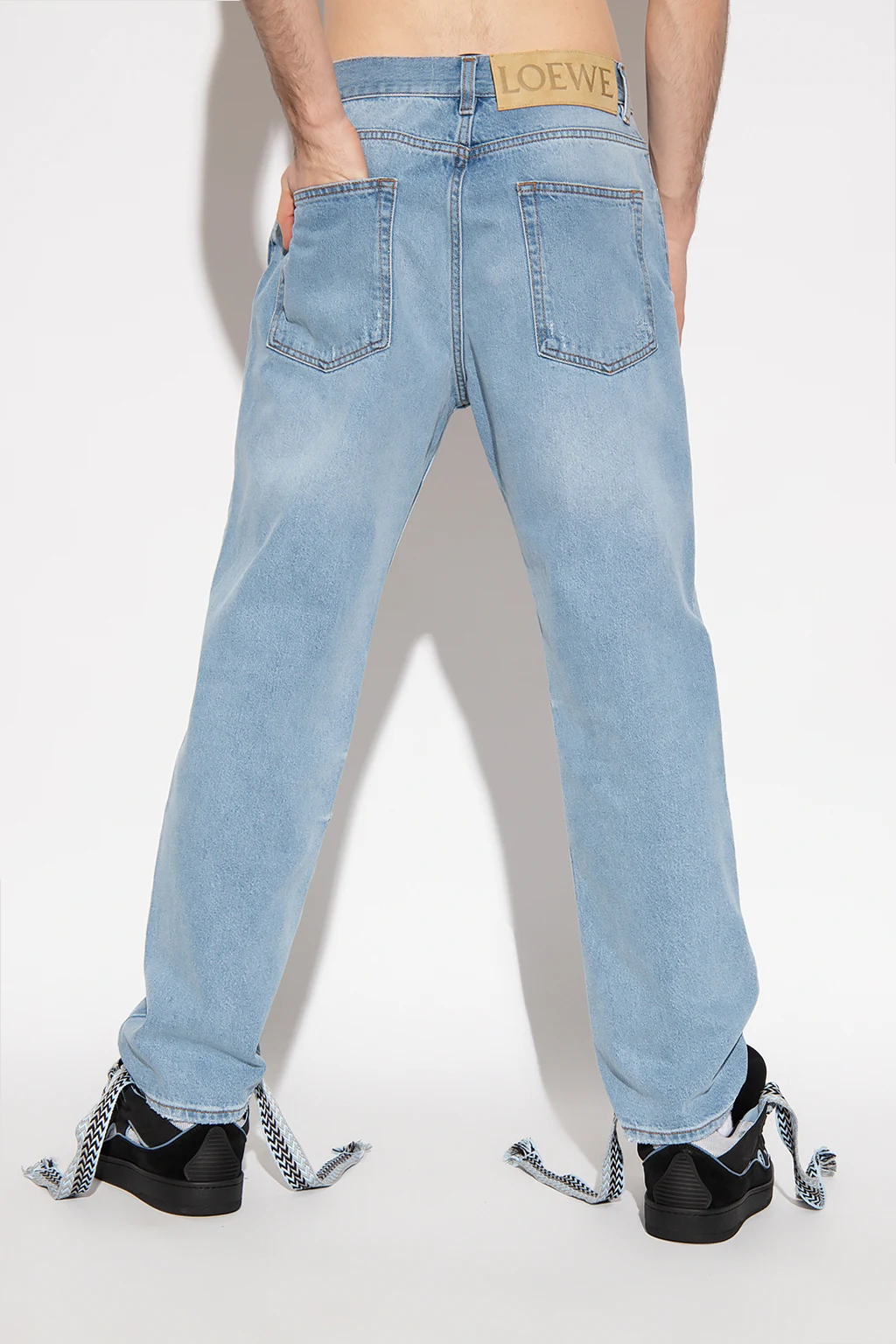 Jasnoniebieskie jeansy z przetarciami Loewe. Zapinane na guziki. Z tyłu naszywka z wytłoczonym logo wykonana ze skóry cielęcej. Pięć wsuwanych kieszeni. Lekko zwężane nogawki.