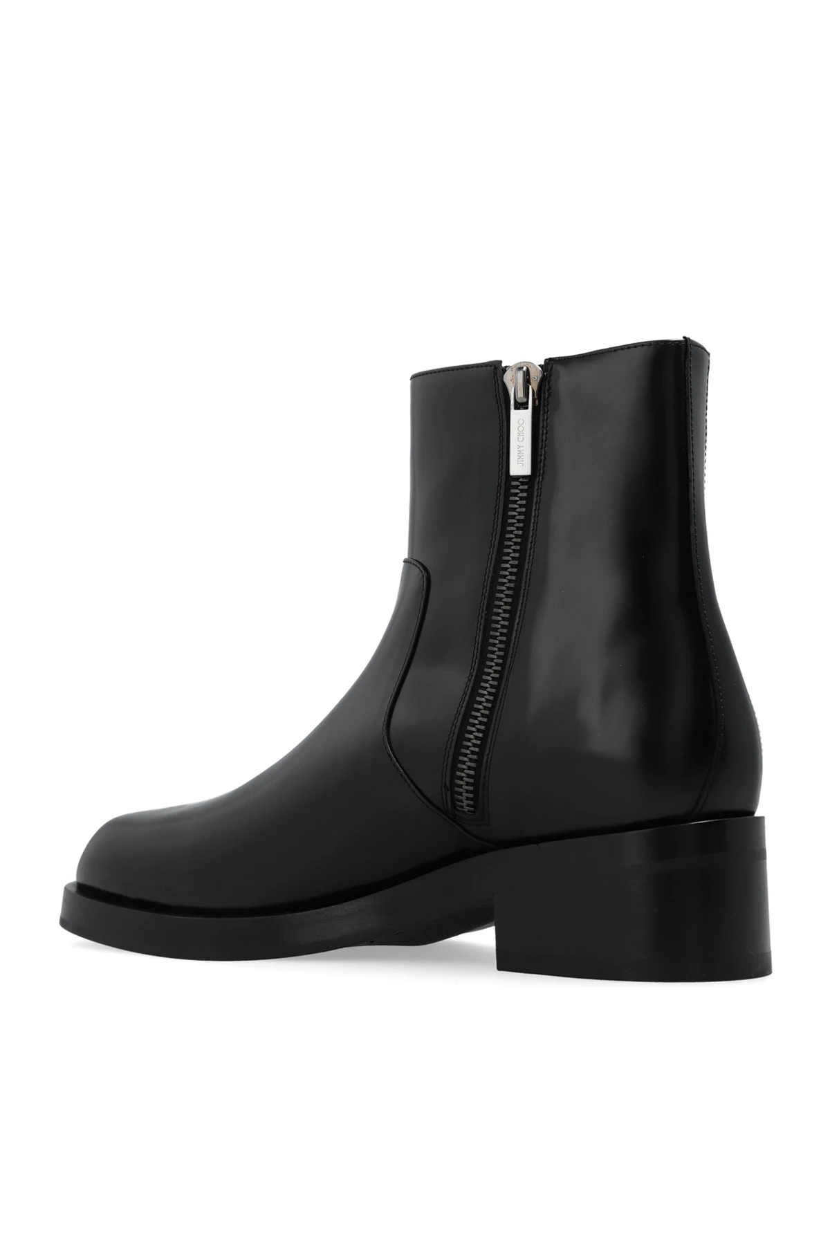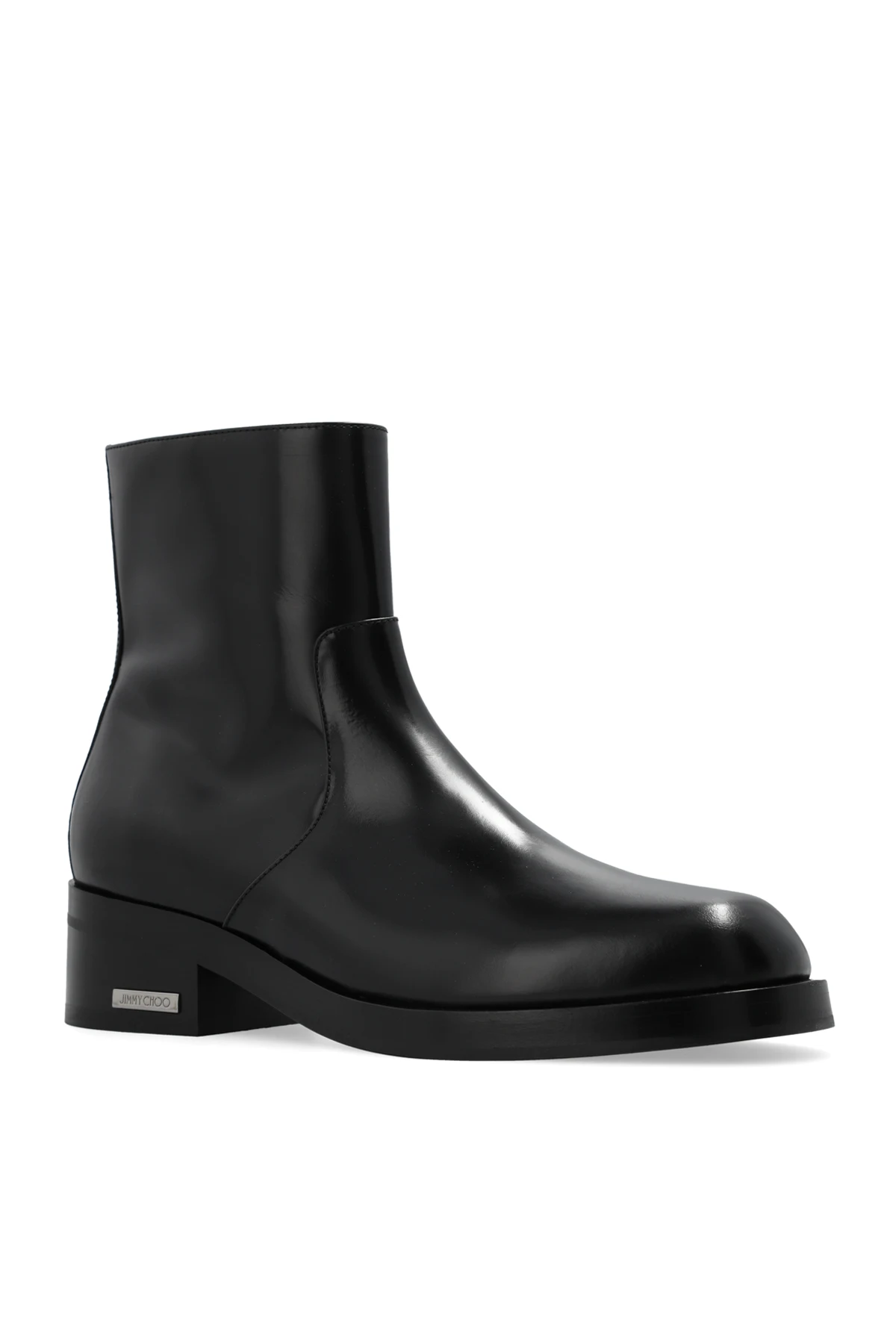 Czarne botki, model ‘Elias’ Jimmy Choo. Wykonane ze skóry. Zapinane z boku na zamek. Zaokrąglony nosek. Z boku metalowa aplikacja w kolorze srebrnym ozdobiona wygrawerowanym logo. Czarna, skórzana podeszwa wykończona gumą.