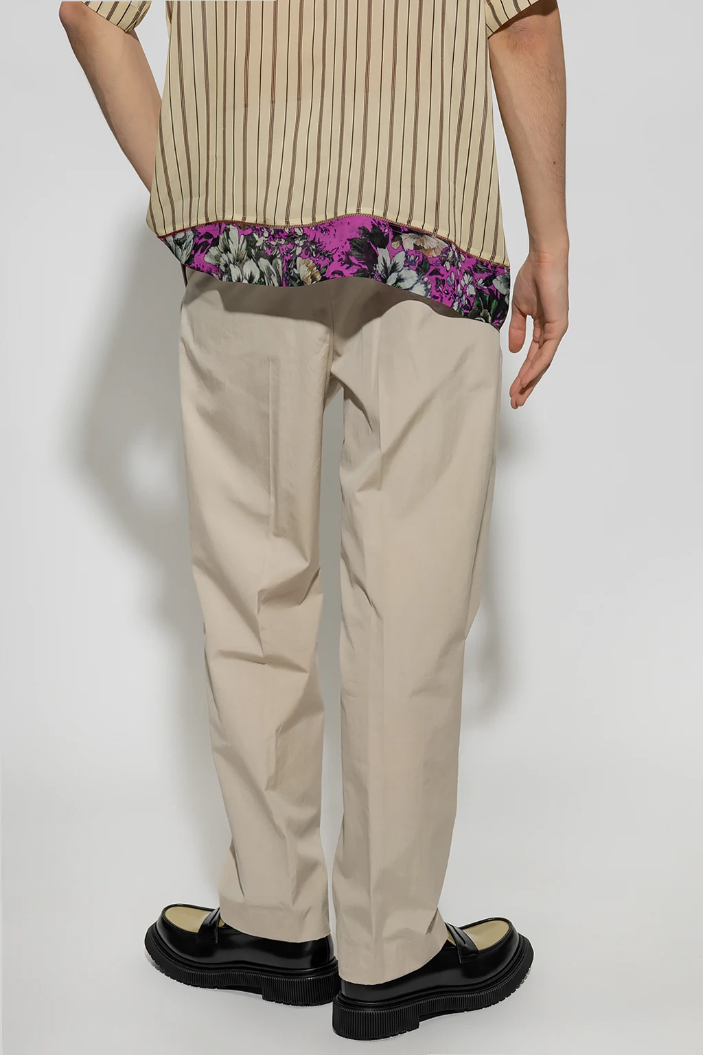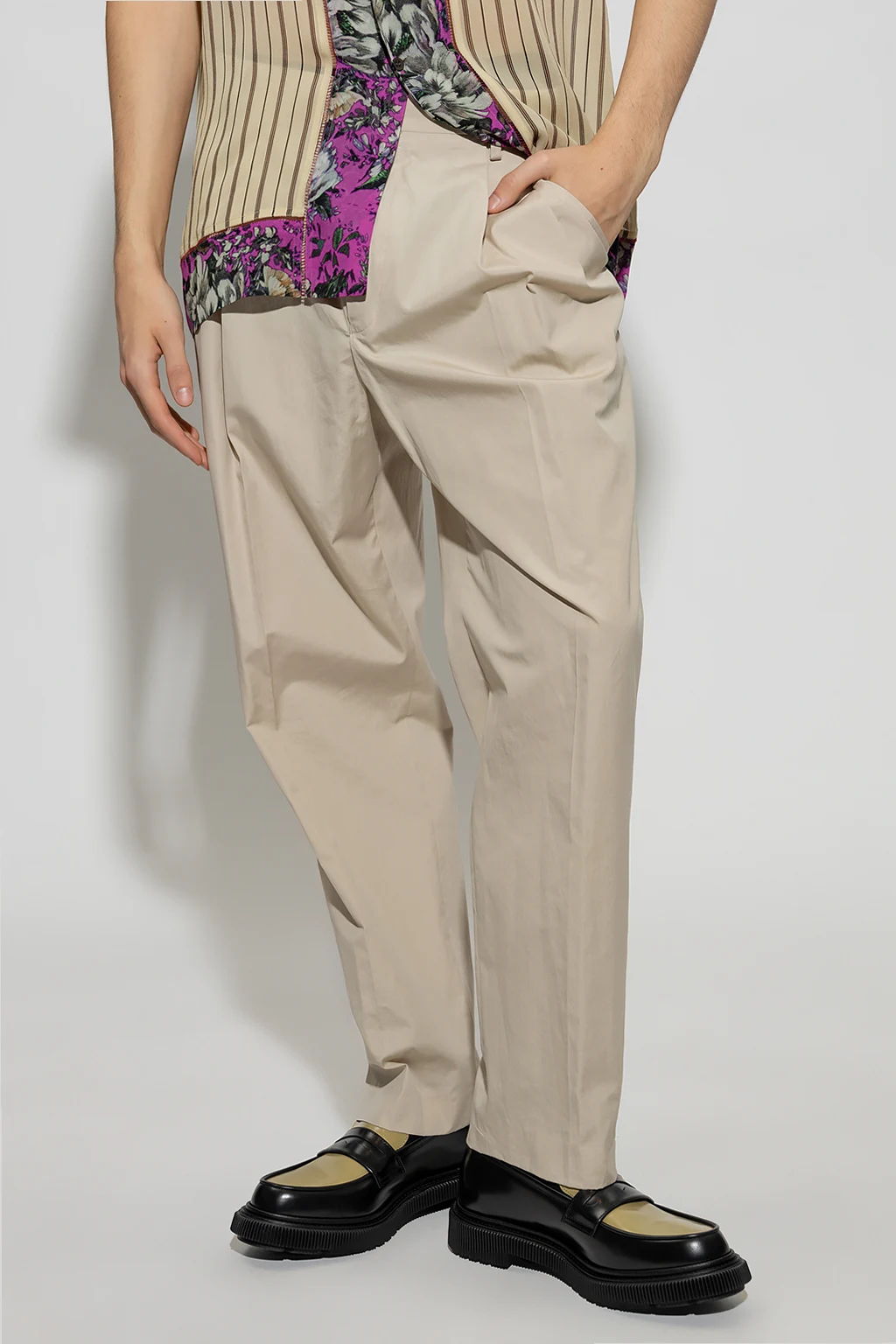Beżowe spodnie w kant Dries Van Noten. Wykonane z bawełny. Zapinane na zamek oraz guzik. Cztery kieszenie. Lekko zwężane nogawki.