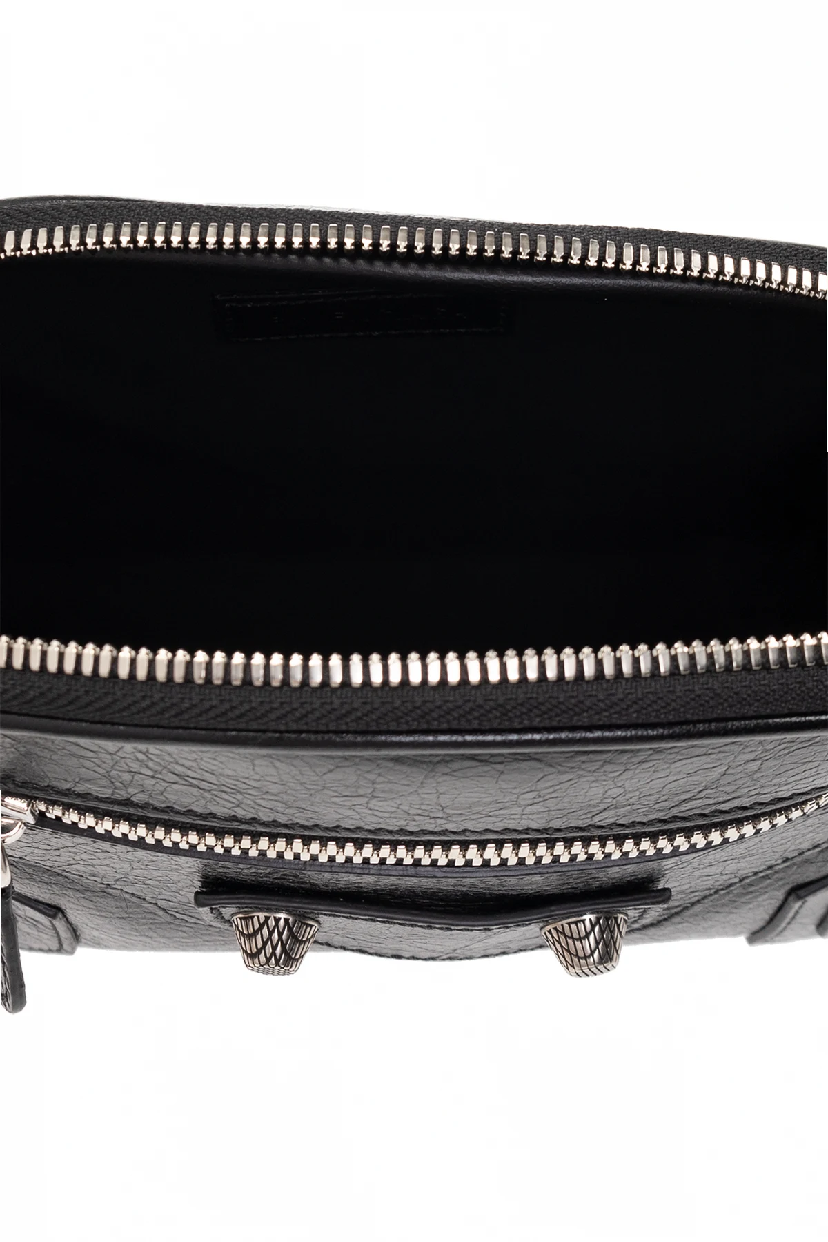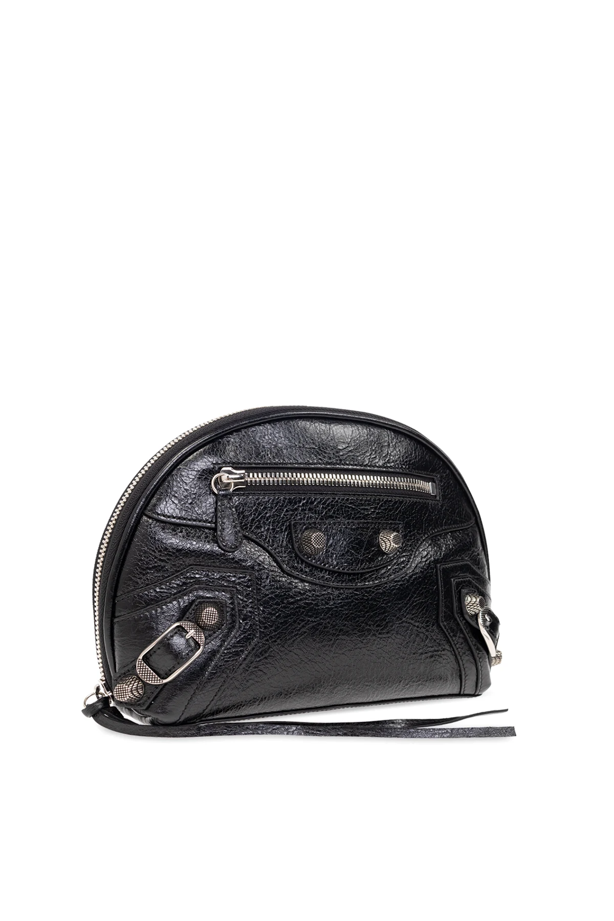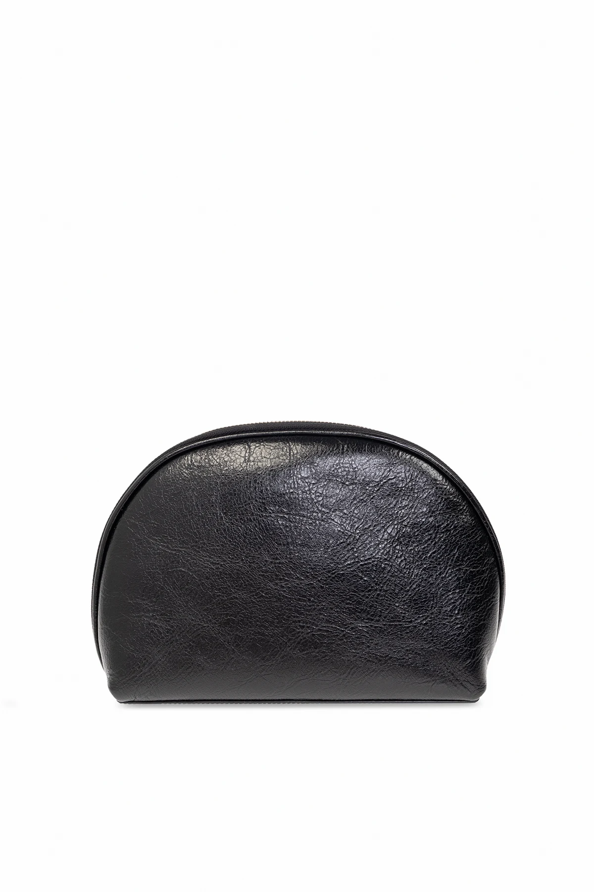 Czarna kosmetyczka Balenciaga. Wykonana ze skóry jagnięcej o postarzanej fakturze. Zamykana na zamek. Ozdobiona metalowymi ćwiekami i paskami z klamrą w kolorze srebrnym. Z przodu kieszeń zamykana na zamek. Wewnątrz komora.