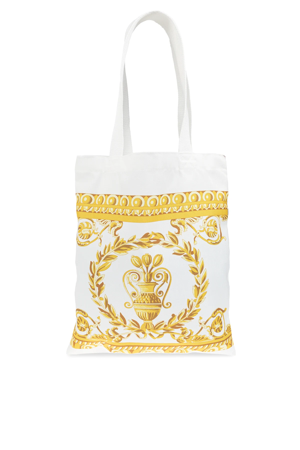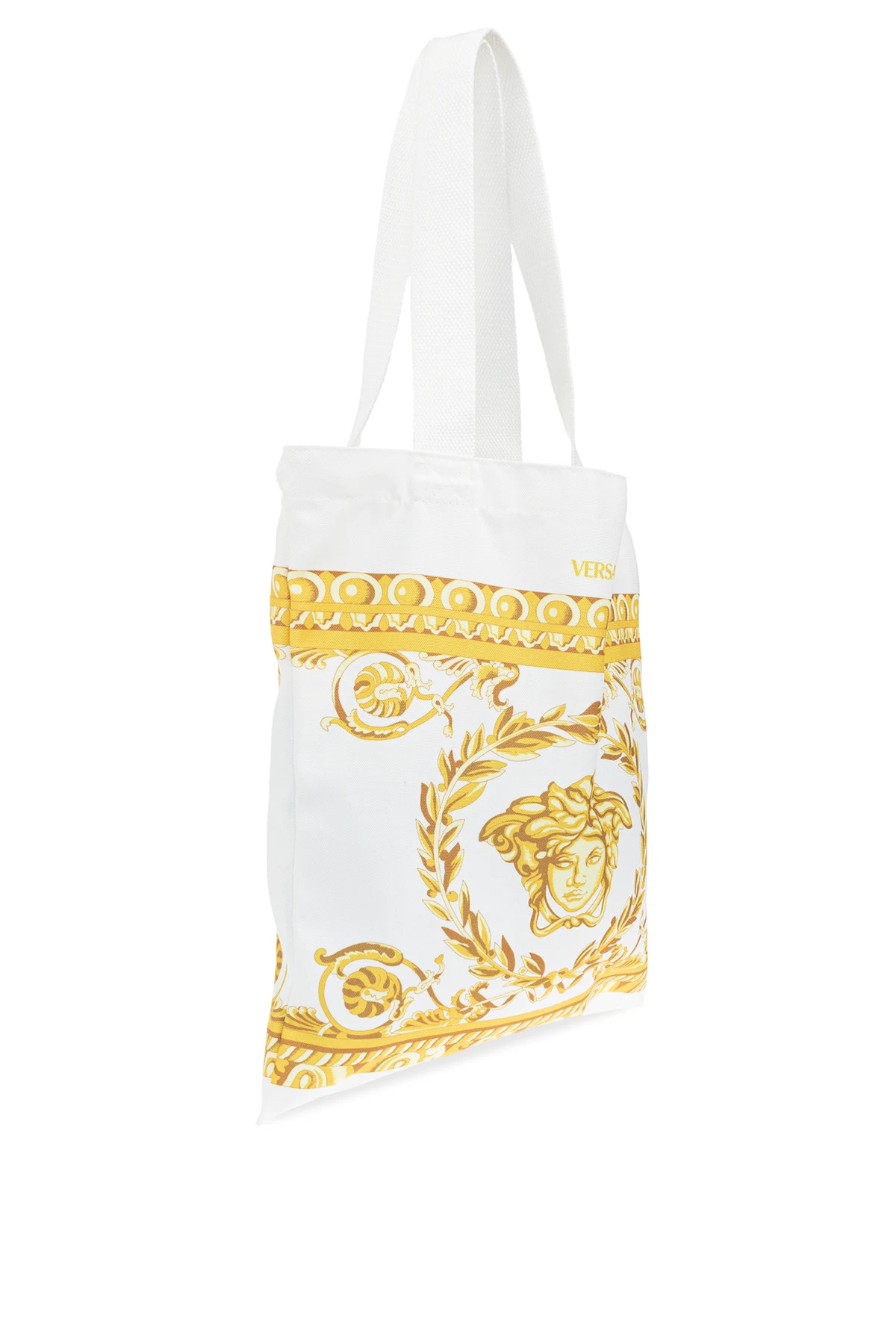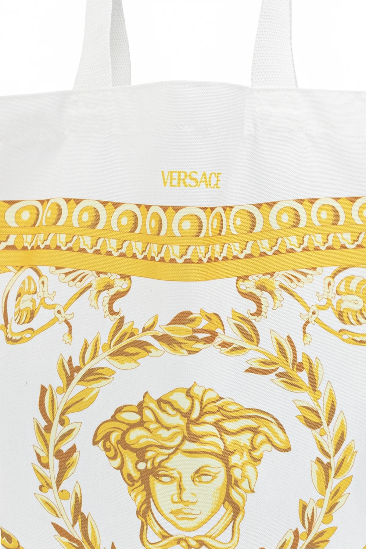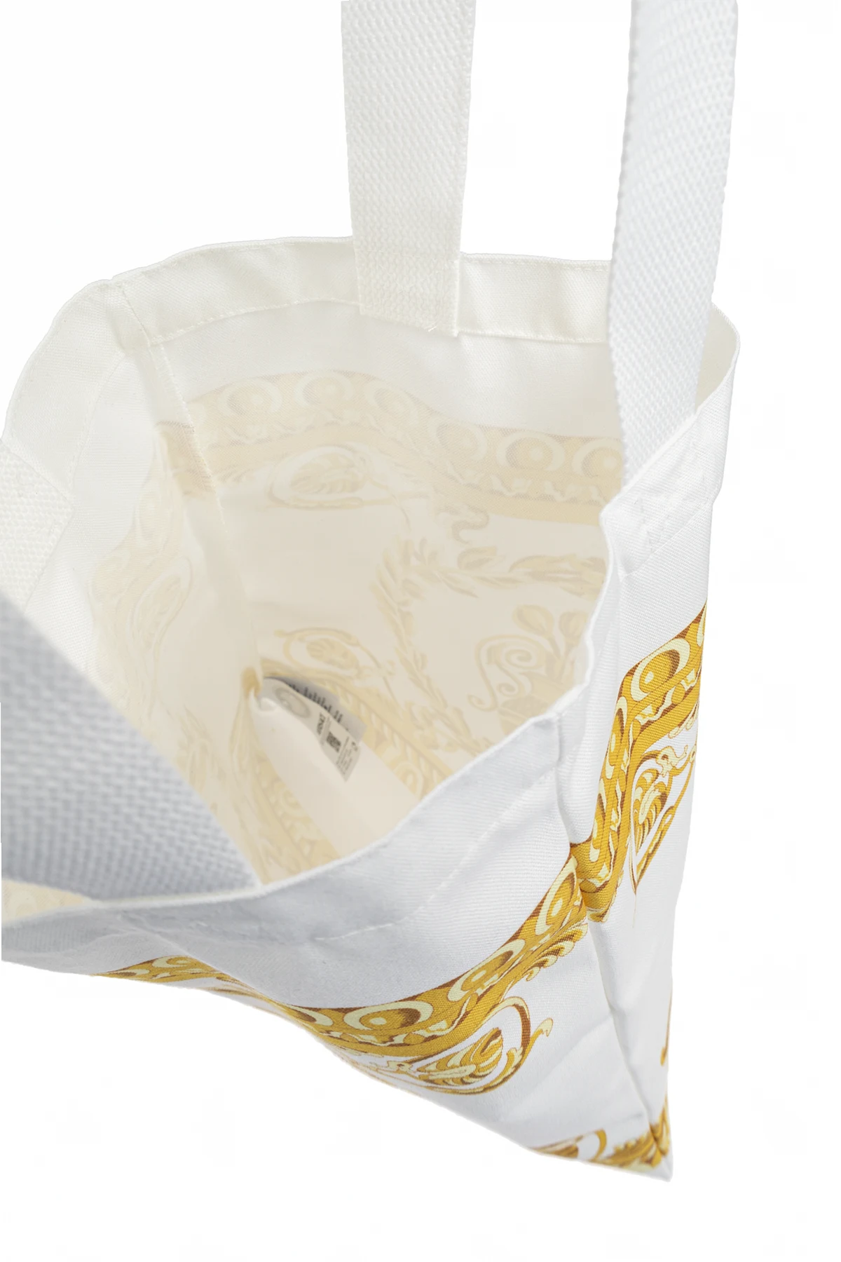 Torba wykonana została z trwałego materiału, przypominającego płótno, a dominujący biały kolor efektownie kontrastuje z złotymi akcentami. Logo "VERSACE" w złotym kolorze na górze torby dopełnia całości, podkreślając prestiż i elegancję.