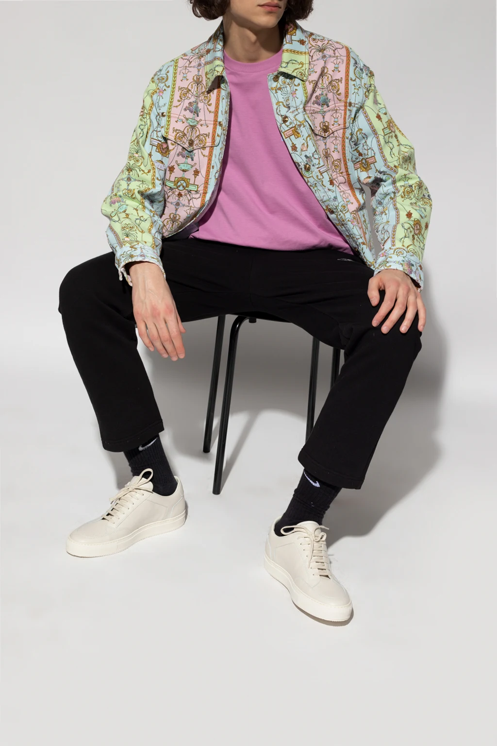 Szare, skórzane, sznurowane buty sportowe, model ‘Zeus’ Common Projects. Ozdobione nadrukowanym wzorem w kolorze złotym. Biała, gumowa podeszwa.