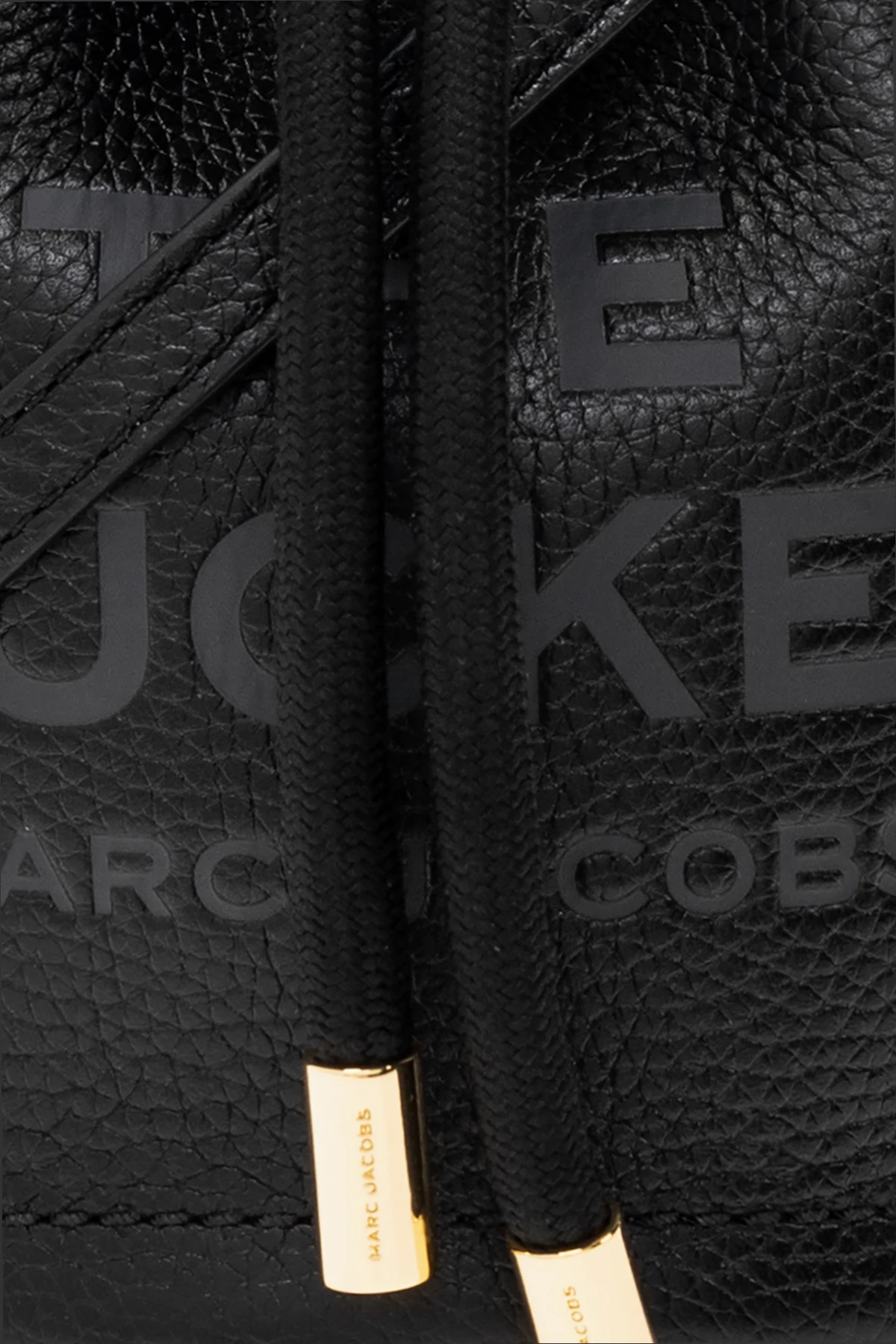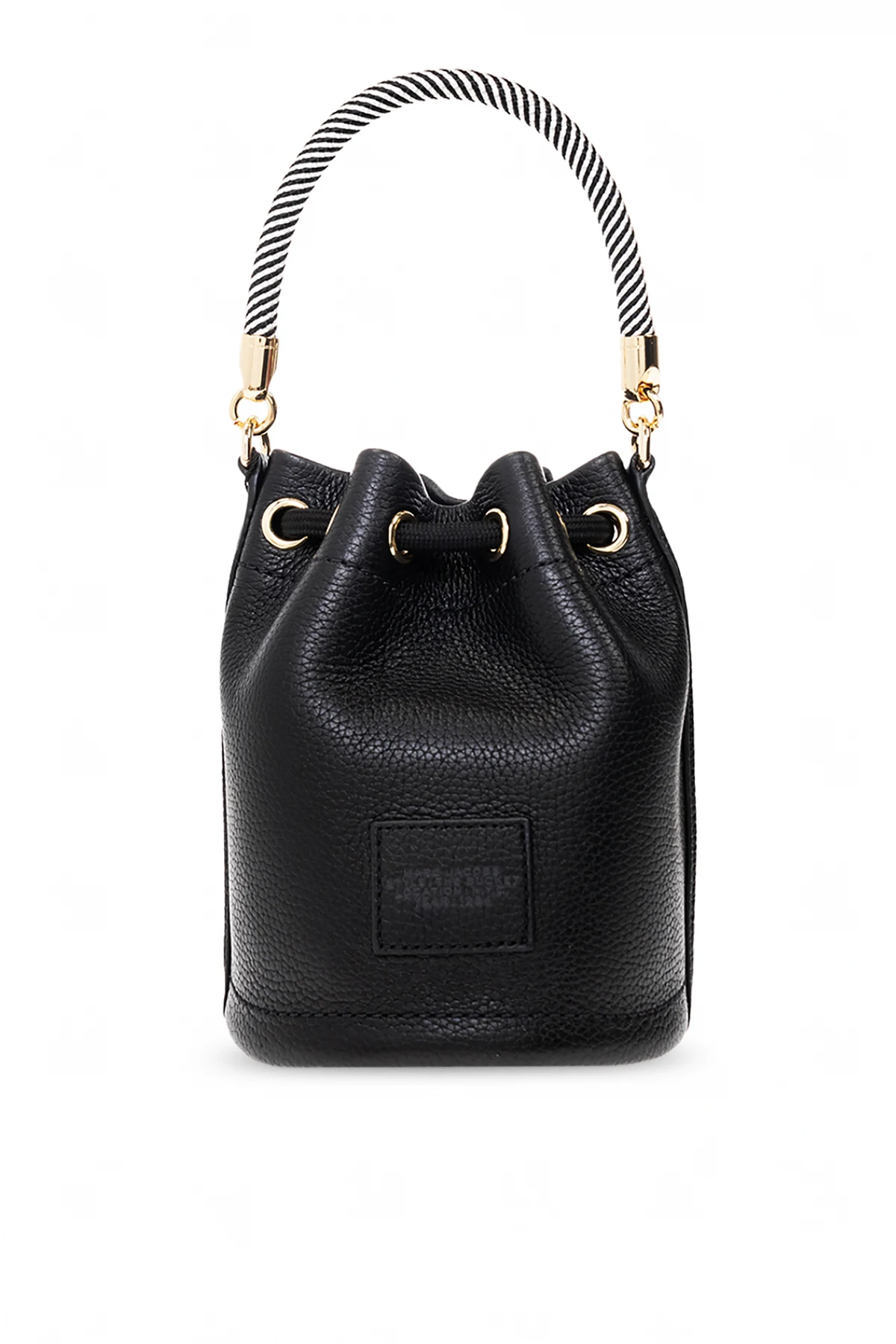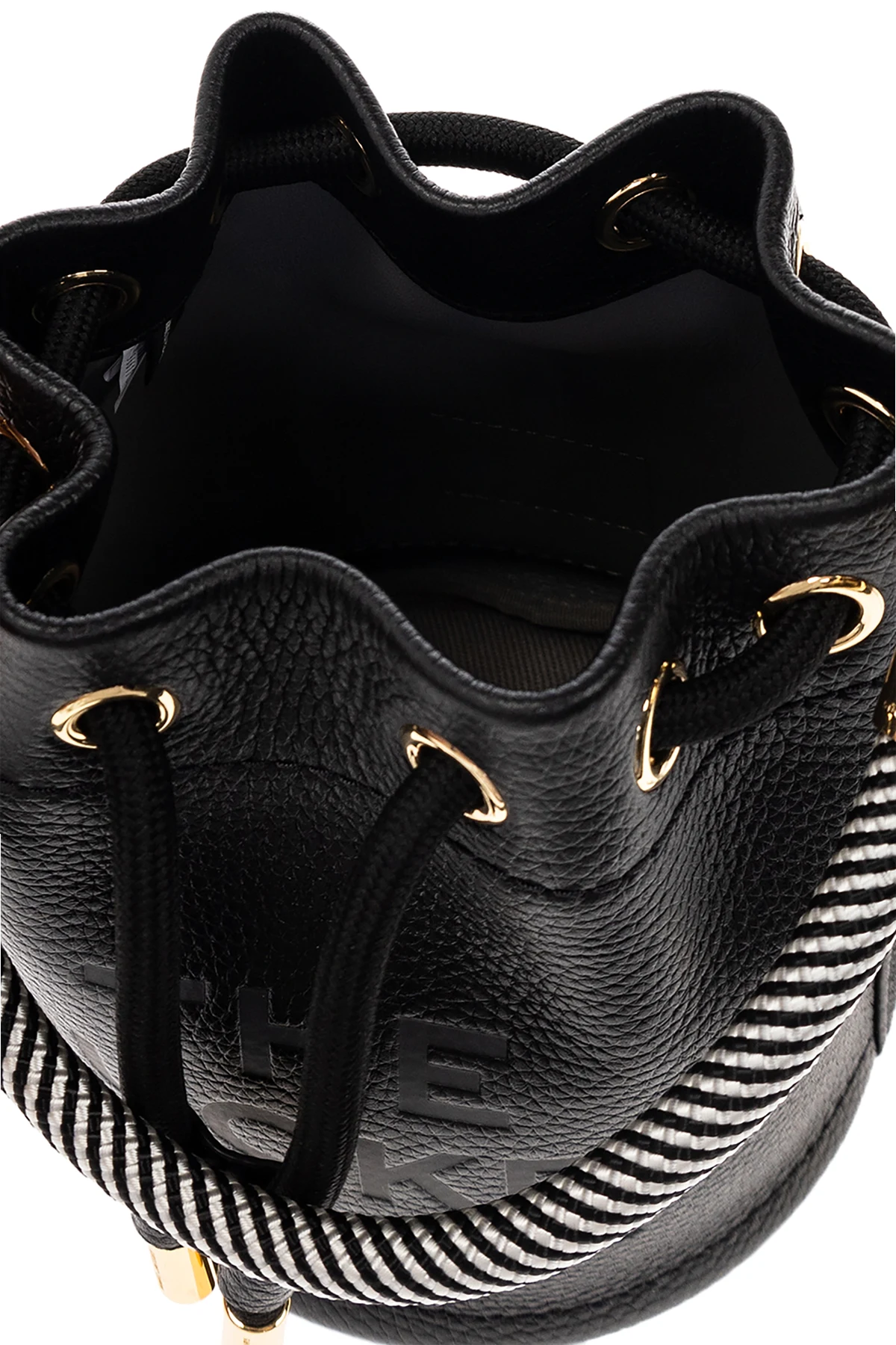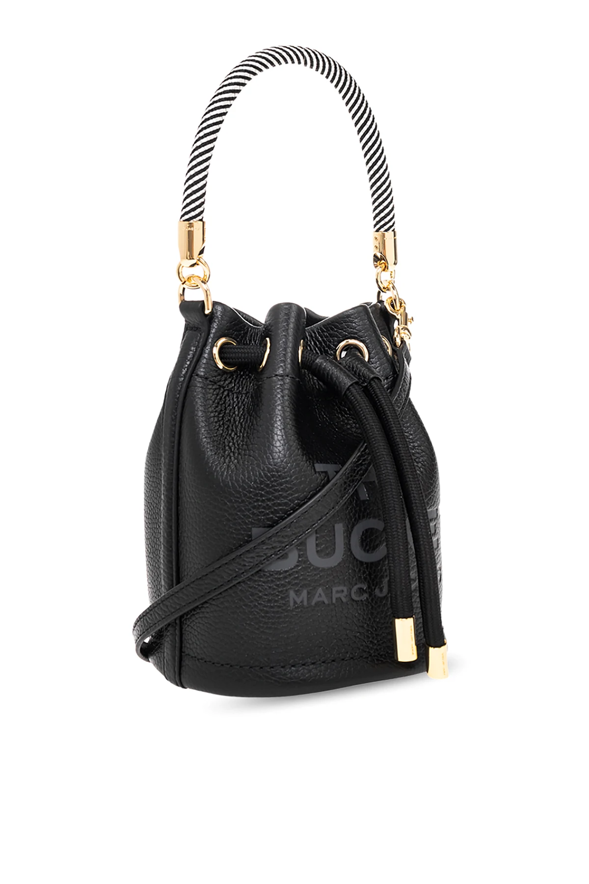 Czarna torba na ramię, model ‘The Bucket Micro’ Marc Jacobs. Wykonana ze skóry o ziarnistej fakturze. Ściągana trokami. Z przodu ozdobiona logo. Z tyłu naszywka. Półokrągła rączka w kolorze biało-czarnym oraz odpinany pas na ramię z możliwością regulacji długości. Wewnątrz komora. Metalowe wykończenie w kolorze złotym.
