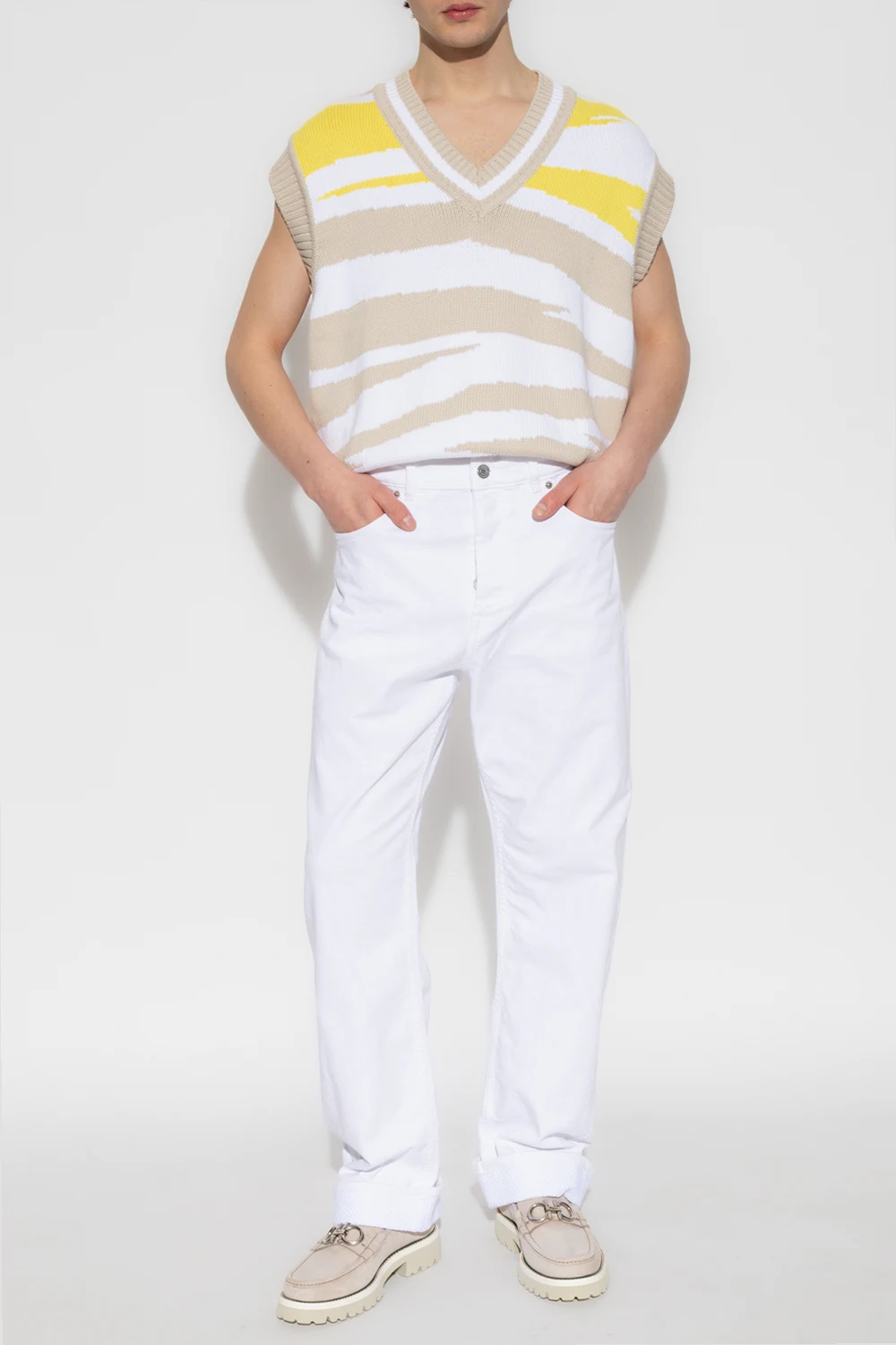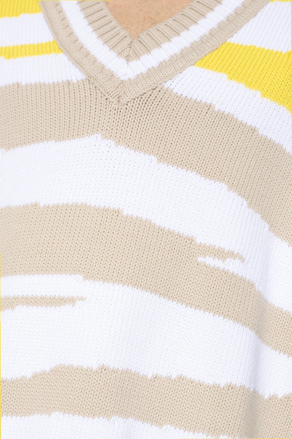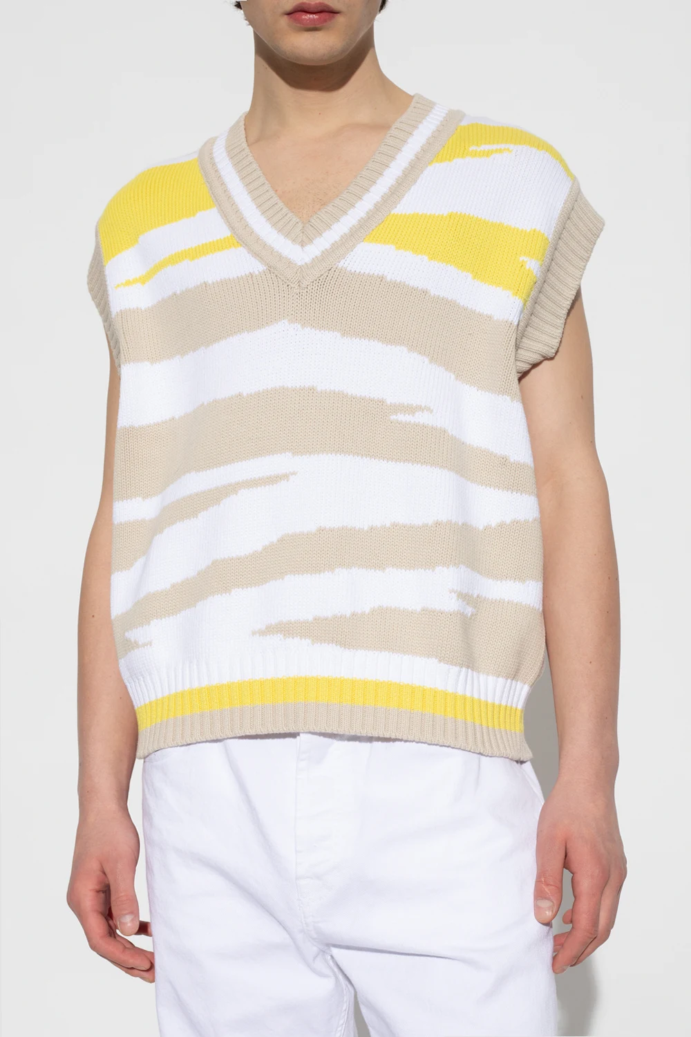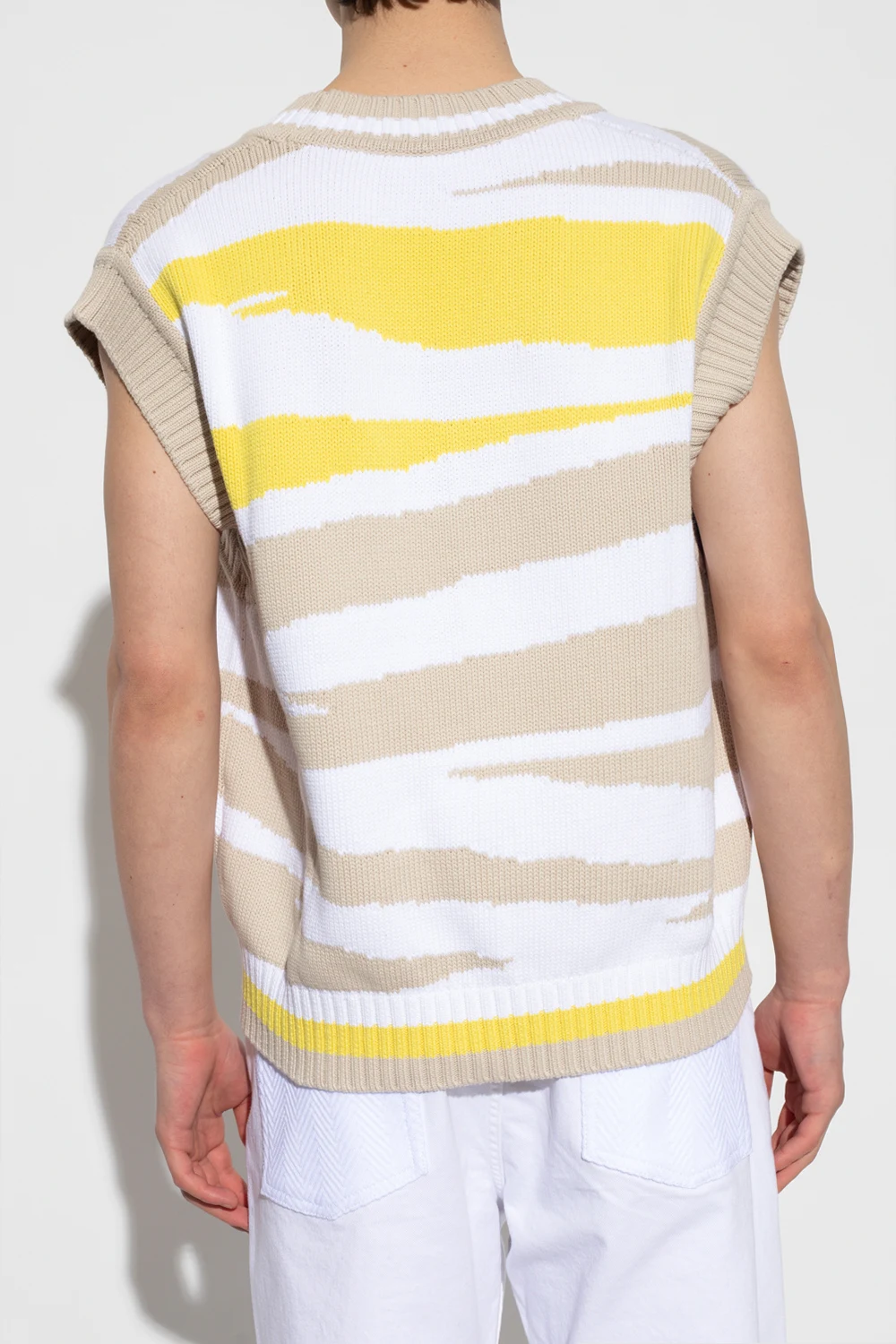 Biało-beżowo-żółta kamizelka Missoni. Wykonana z mieszanki bawełny. Ozdobiona wzorem w pasy. Dekolt w serek, ramiona oraz dół wykończone ściągaczem.