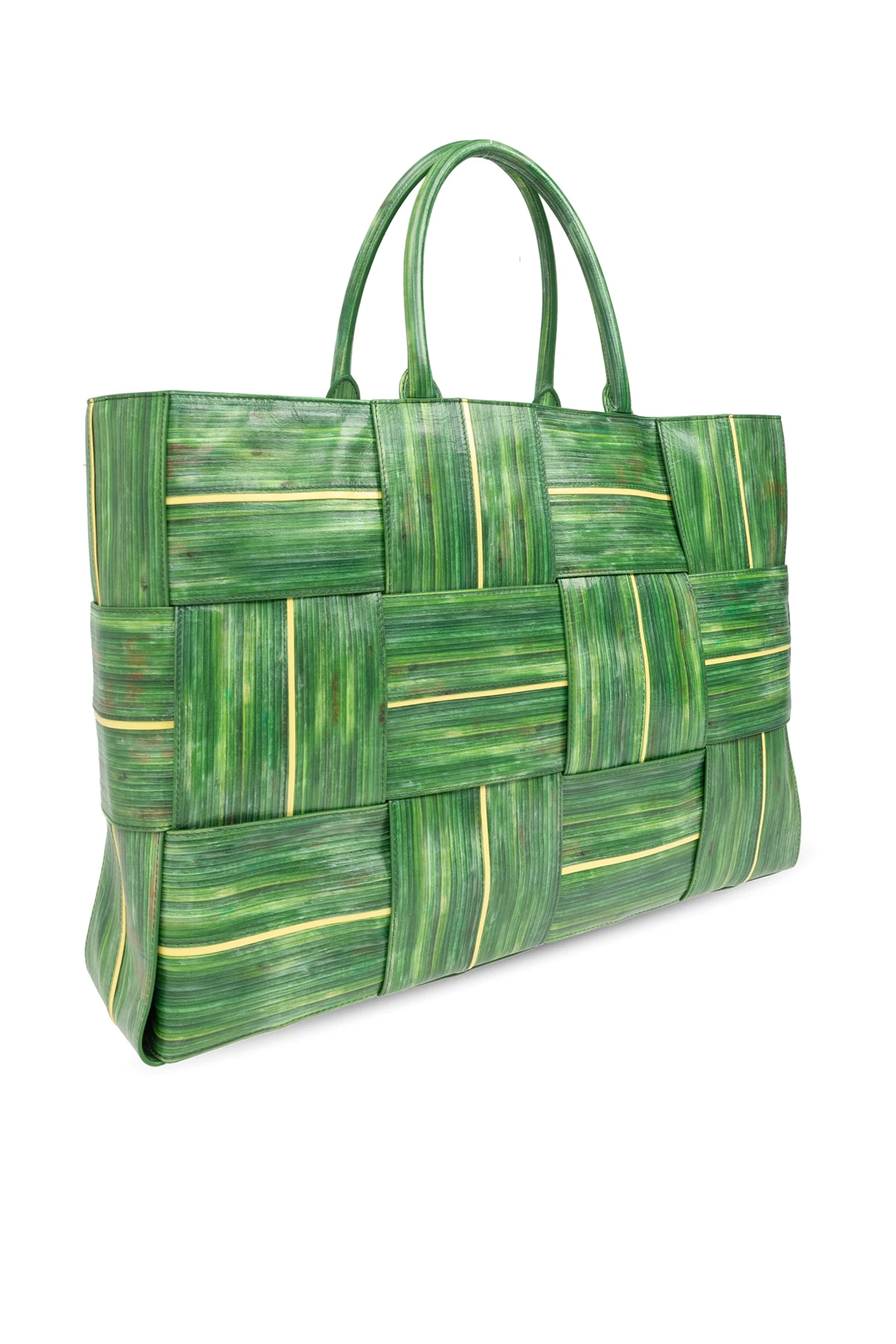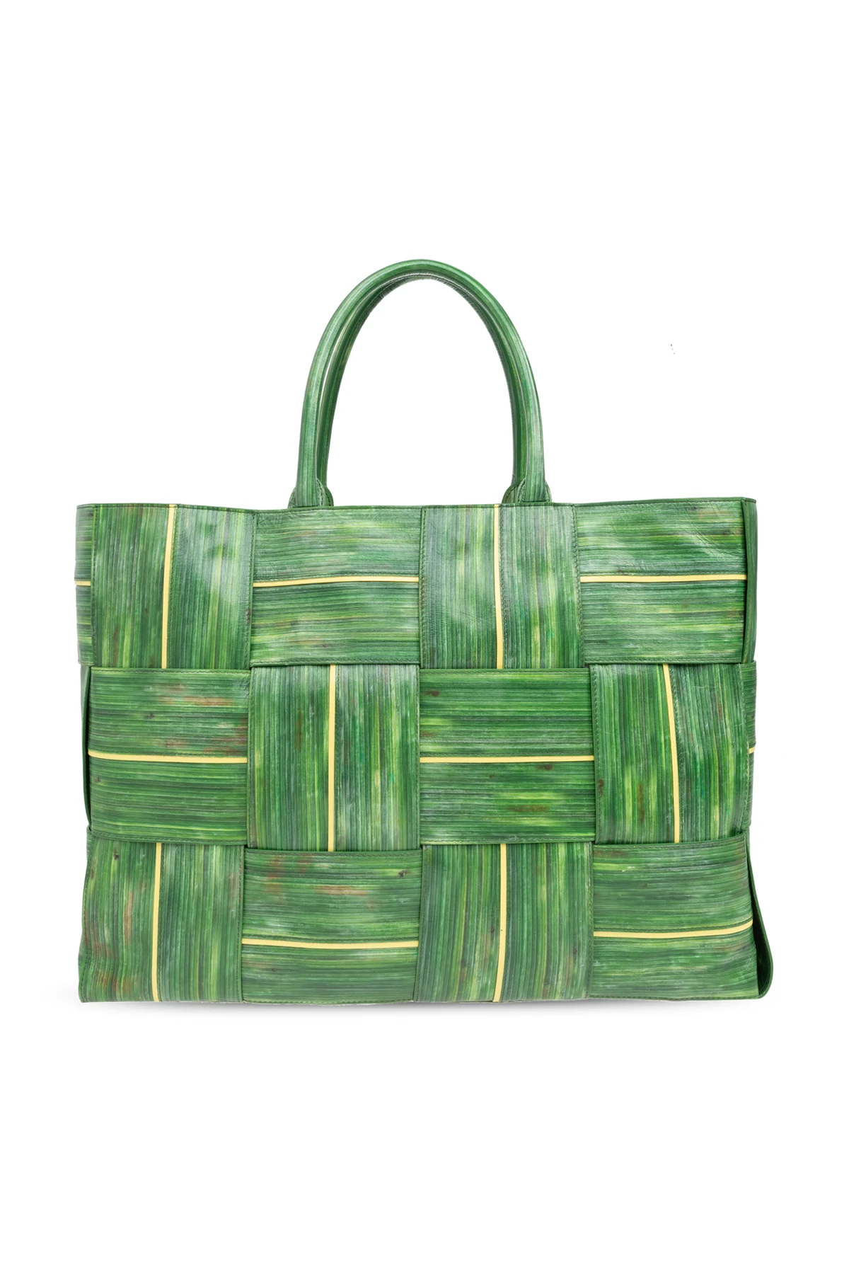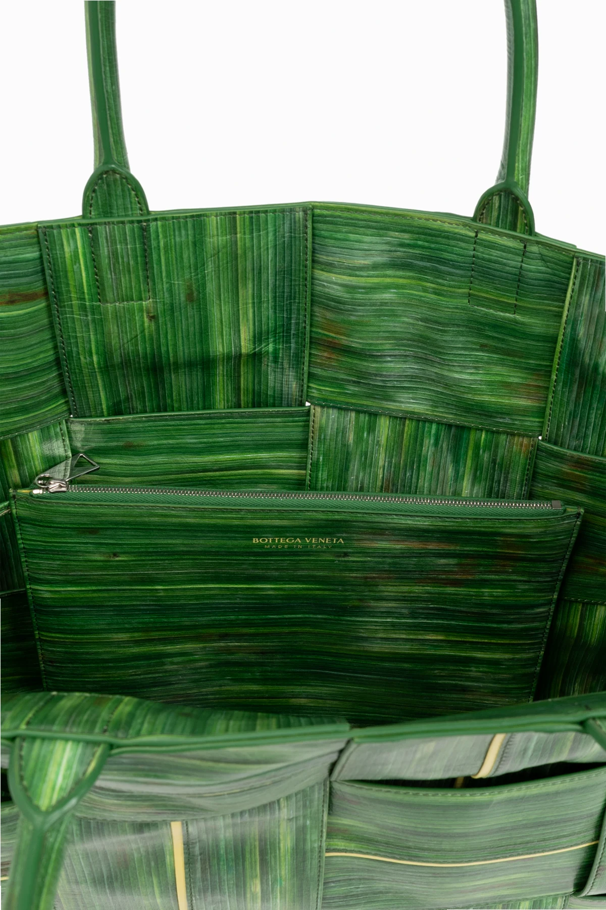 Odkryj wyrafinowanie w każdym detalu z torbą `Arco Large` od luksusowej marki Bottega Veneta . Prezentując się w odcieniach zieleni i żółci, ten ekskluzywny model shopper zachwyca unikatowym nadrukiem, który naśladuje efekt tropikalnych liści. Eleganckie sploty `Intrecciato` , charakterystyczne dla rzemiosła tej marki, dodają głębi i tekstury, tworząc wzór przypominający naturalny splot bambusowych lub trawiastych elementów.