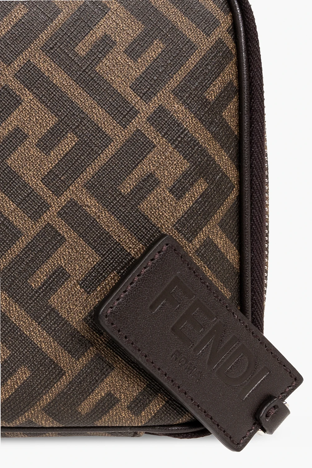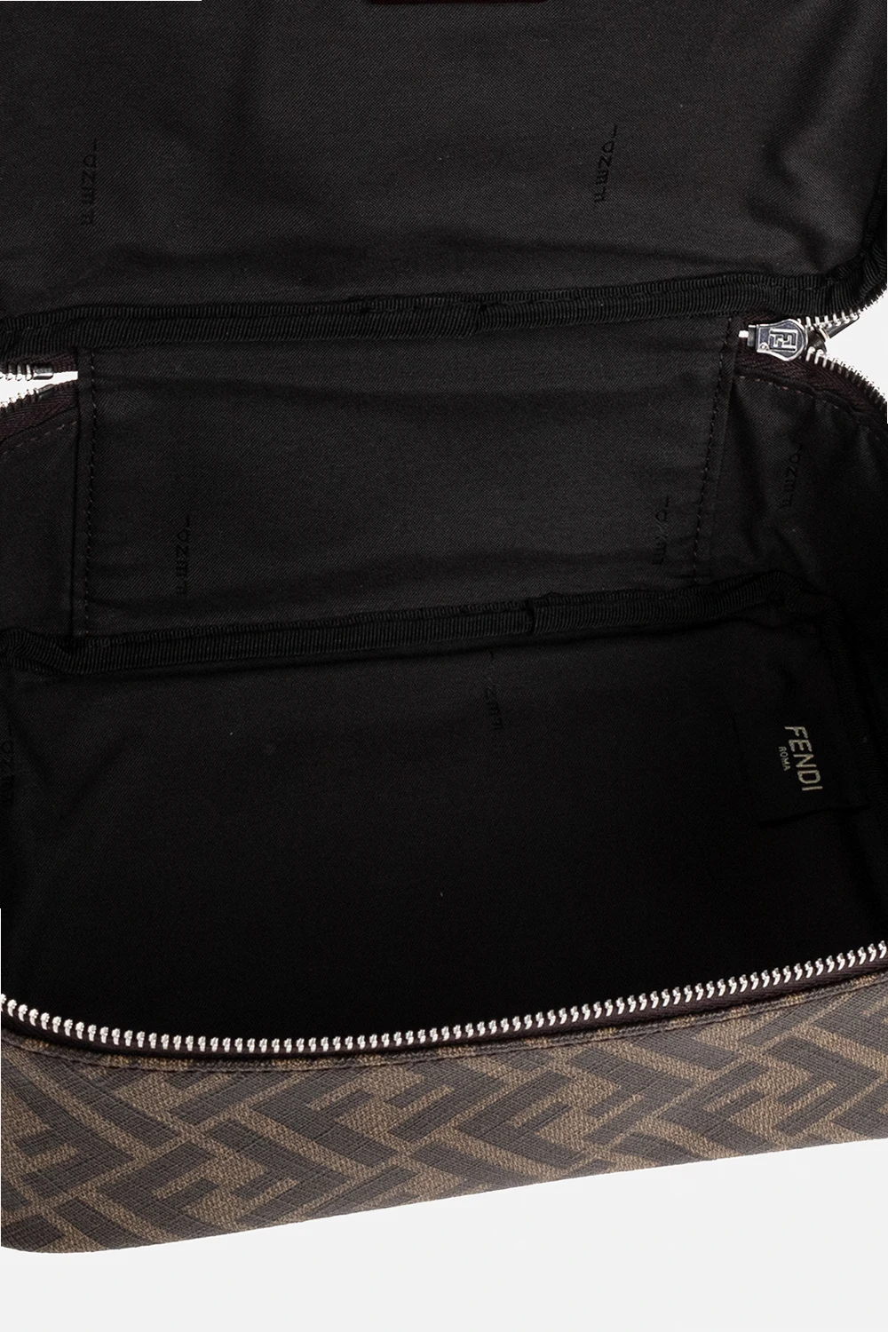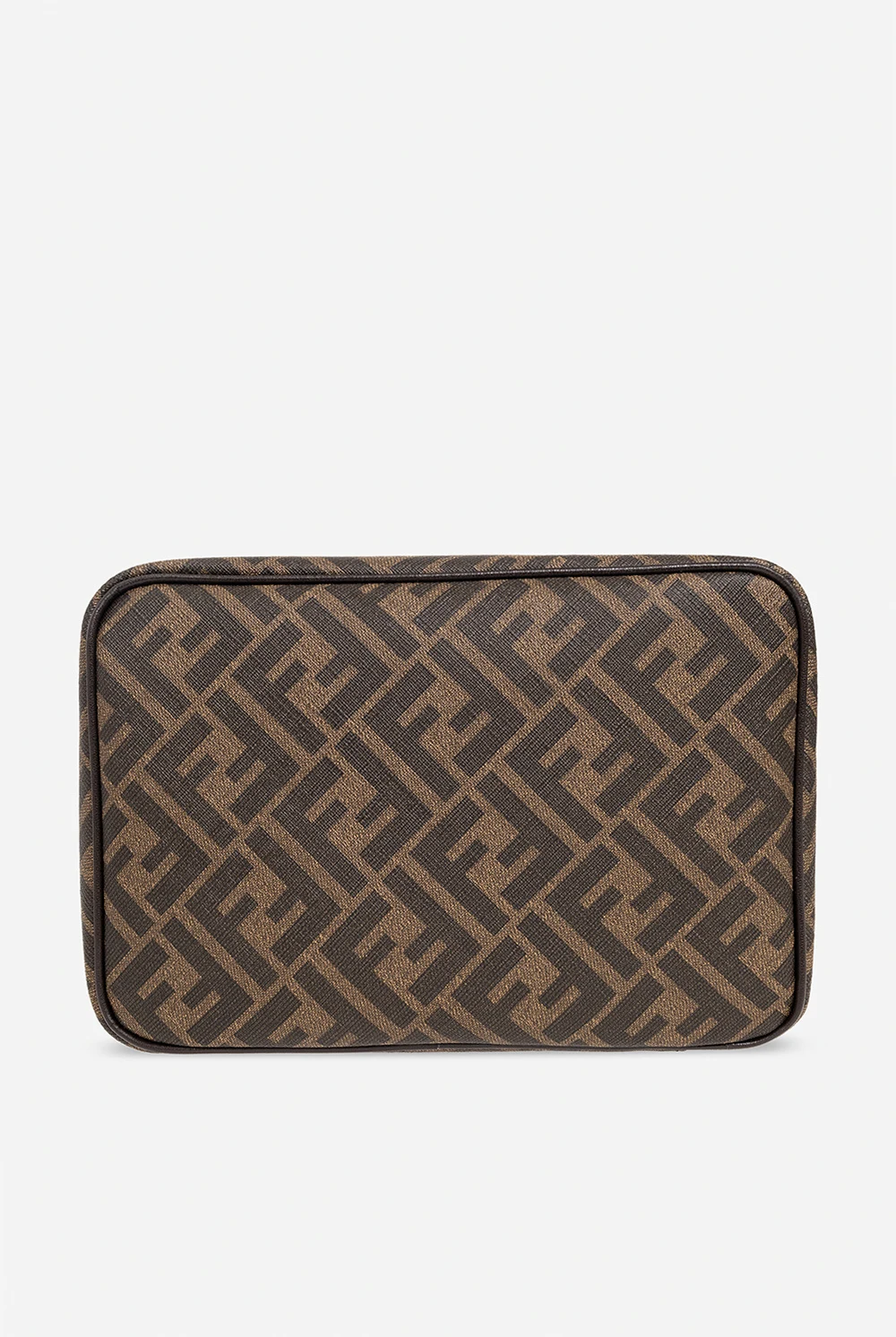Brązowa kosmetyczka Fendi. Wykonana z powlekanego płótna ozdobionego wzorem z monogramem ‘FF’ i wykończona skóra cielęcą. Zamykana na zamek zakończony zawieszką z wytłoczonym logo. Wewnątrz komora. Metalowe wykończenie w kolorze srebrnym.