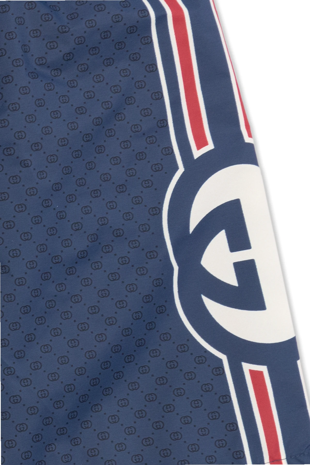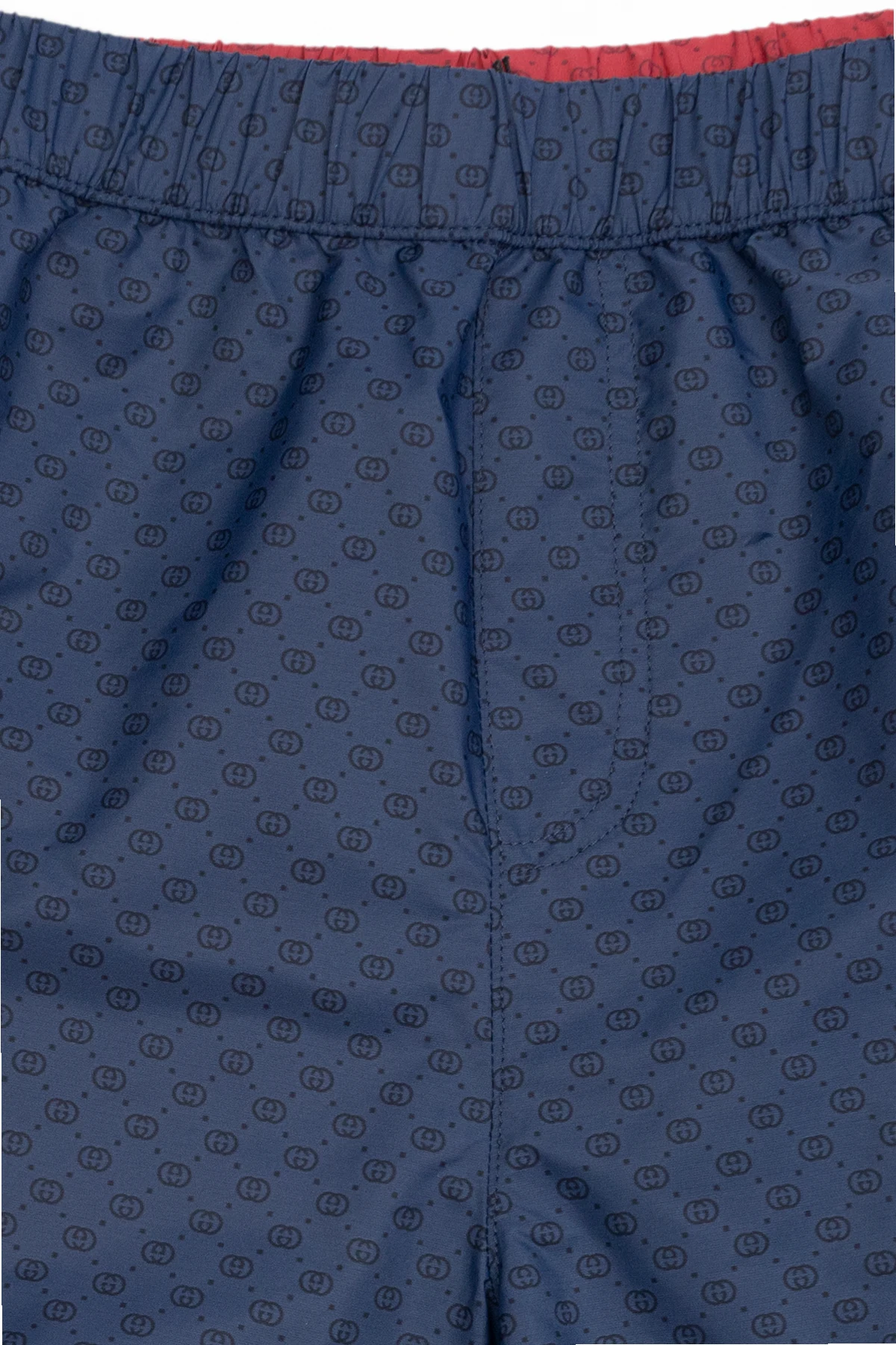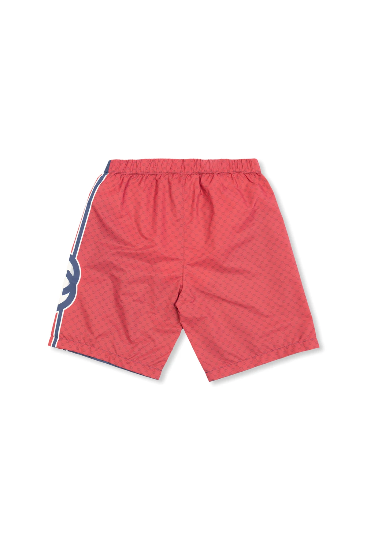 Granatowo-bordowe szorty kąpielowe Gucci Kids. W pasie wszyta gumka. Ozdobione wzorem z monogramem. Po bokach lampasy z logo.