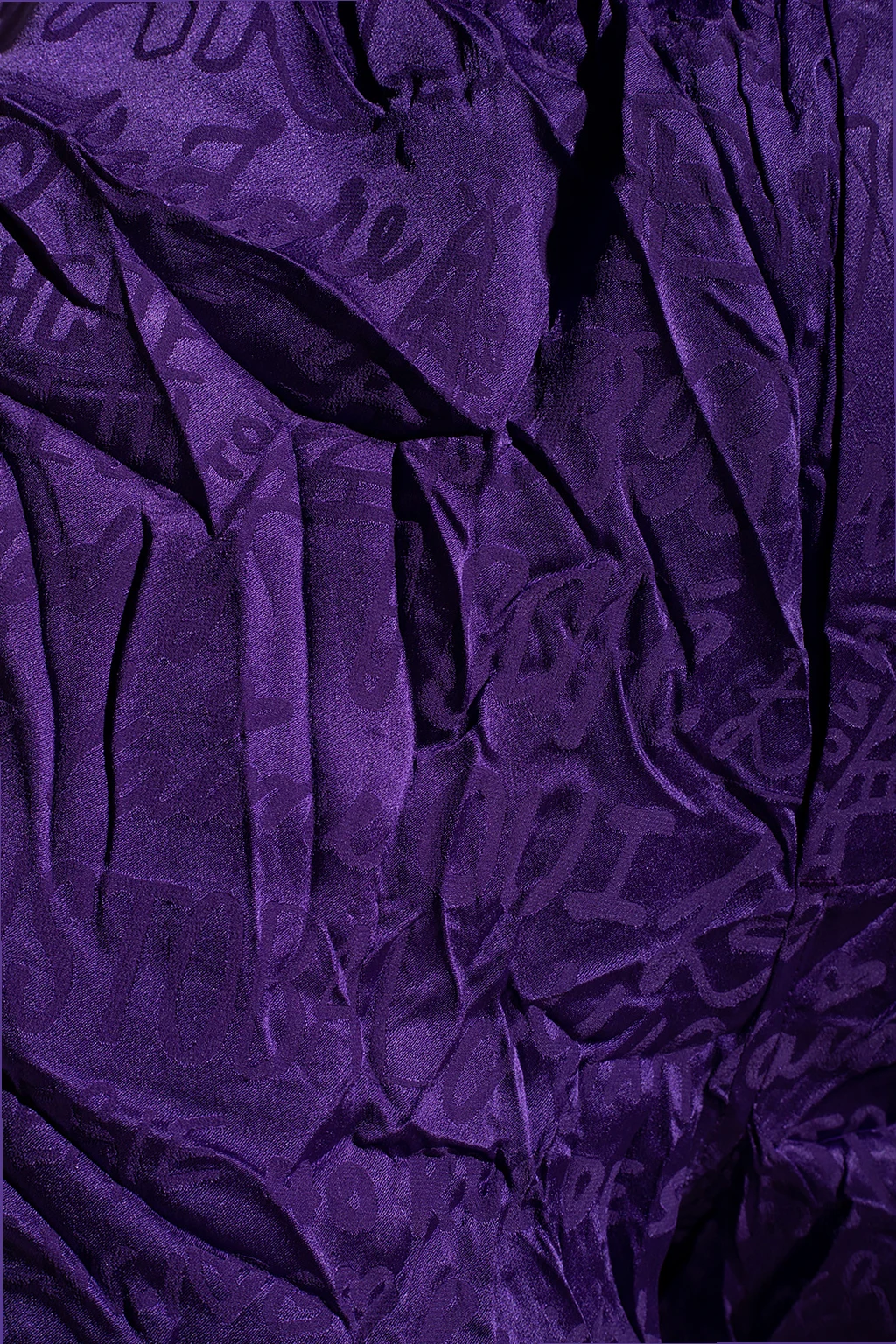 Fioletowy, jedwabny dół od piżamy Balenciaga. Zapinany na guziki. W pasie wszyta guma z naszywką z logo w kolorze czarnym. Ozdobiony wyszytym wzorem z motywem logo. Krótkie nogawki rozcięte po bokach.