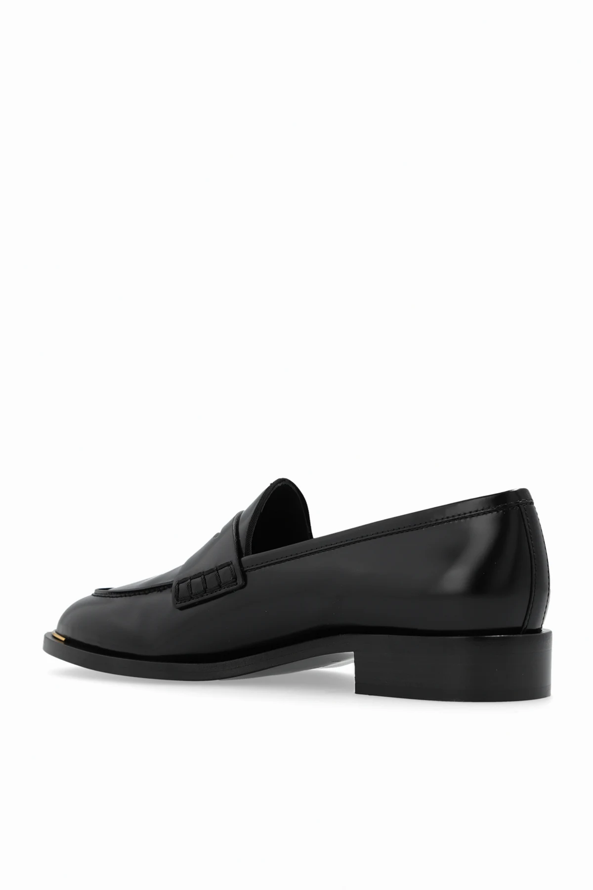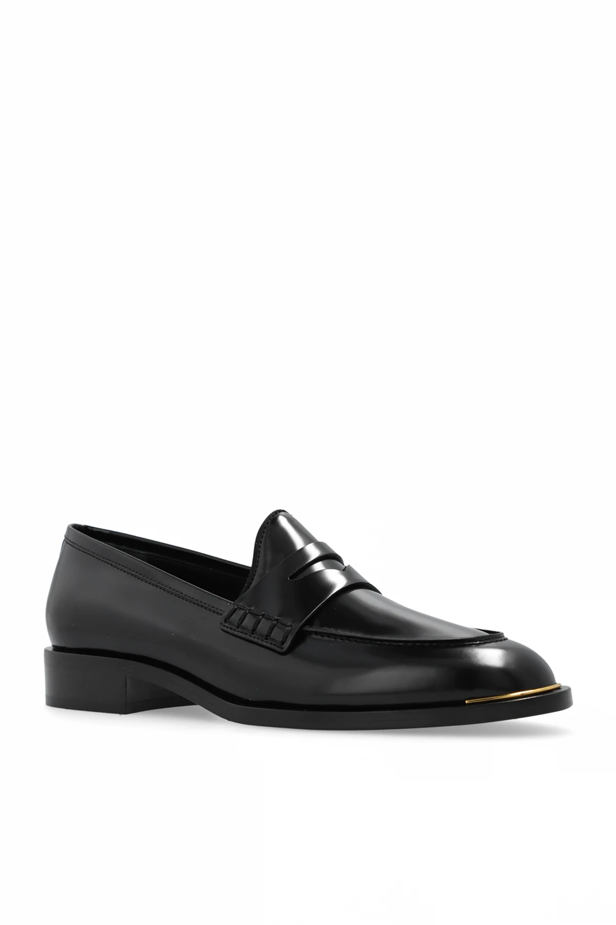 Czarne mokasyny, model ‘Faridha’ Giuseppe Zanotti. Wykonane ze skóry. Z przodu dekoracyjny pas oraz metalowa wstawka w kolorze złotym. Czarna, skórzana podeszwa.