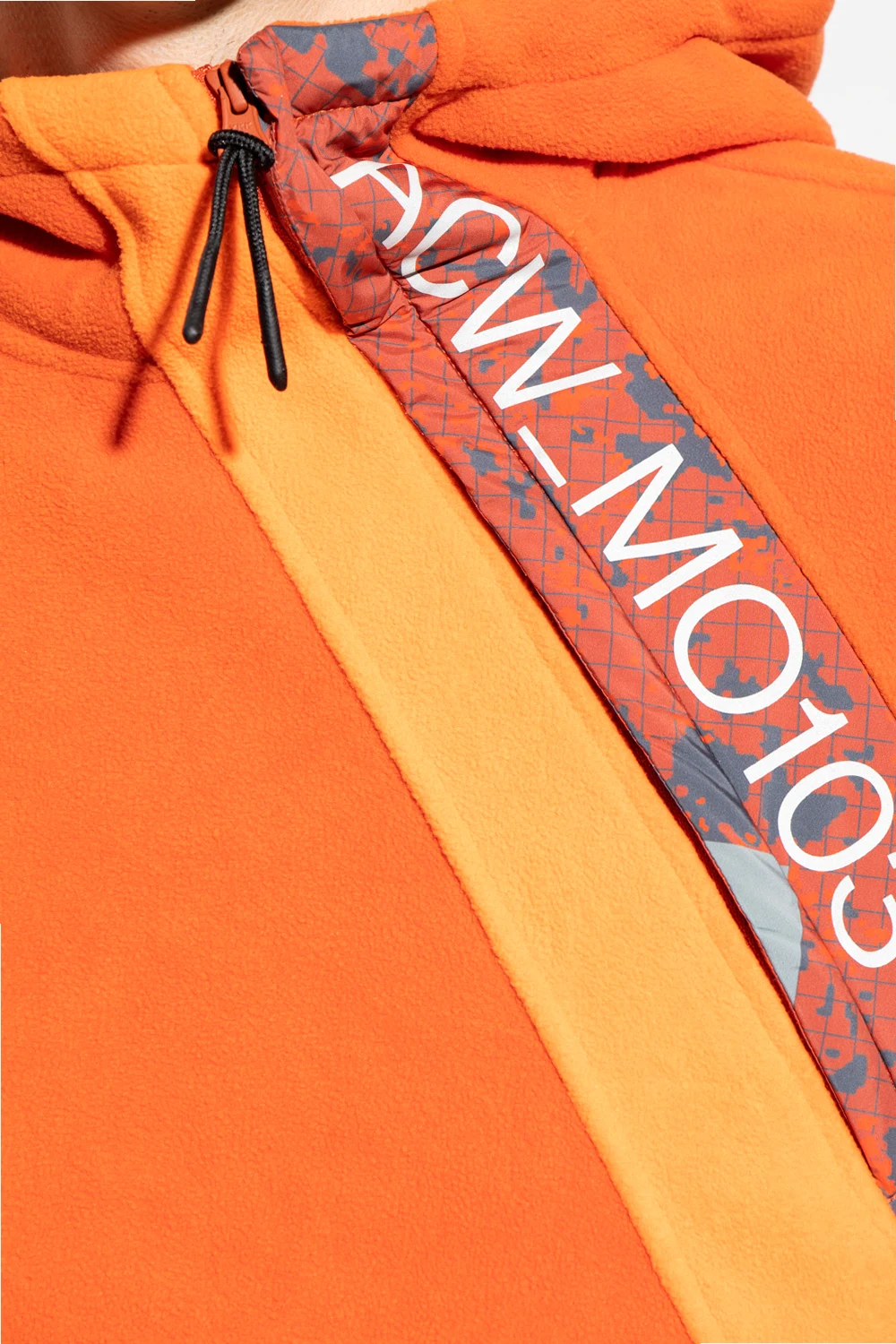 Pomarańczowa, polarowa bluza z kapturem A-COLD-WALL*. Zapinana z przodu na zamek. Z przodu gumowa naszywka z logo. Dekoracyjne wstawki z materiału ozdobionego wzorem w kratę i nadrukowanym logo w kolorze srebrnym o odblaskowym wykończeniu. Charakterystyczna dla marki czarna naszywka na ramieniu. Dwie kieszenie zapinane na zamek. Długie rękawy zakończone regulowanym zapięciem na rzep.