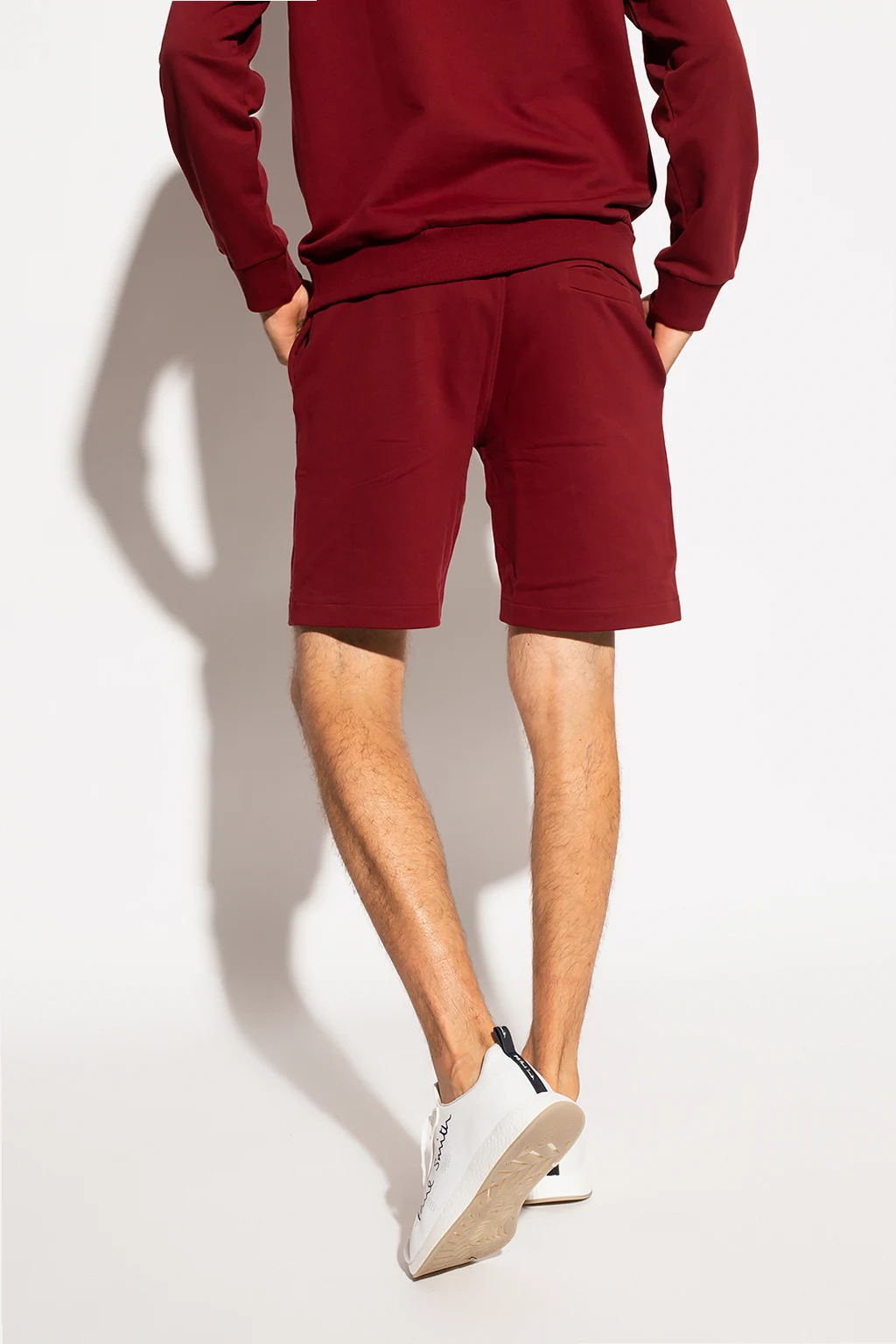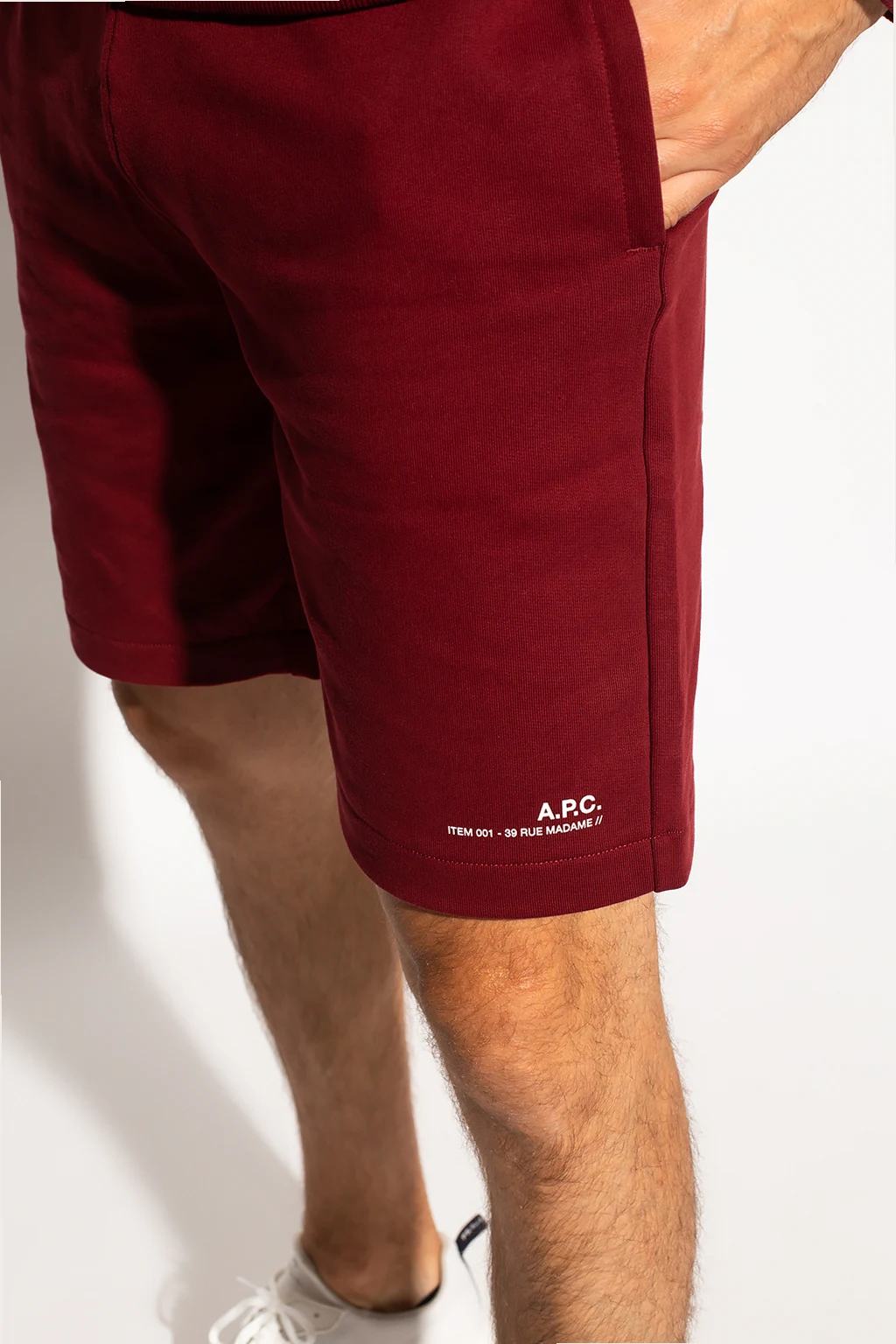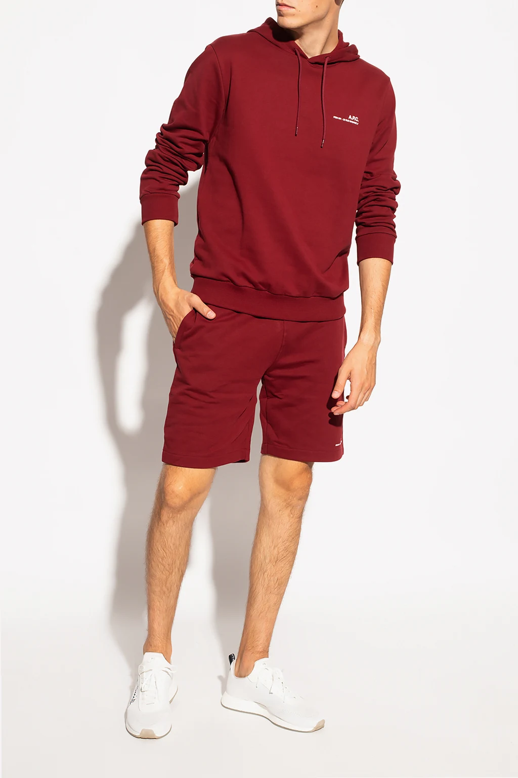 Bordowe szorty dresowe A.P.C. Wykonane z bawełny. W pasie wszyta guma ściągana trokami. Ozdobione nadrukowanym wzorem z logo w kolorze białym. Trzy wsuwane kieszenie. Krótkie, szerokie nogawki.