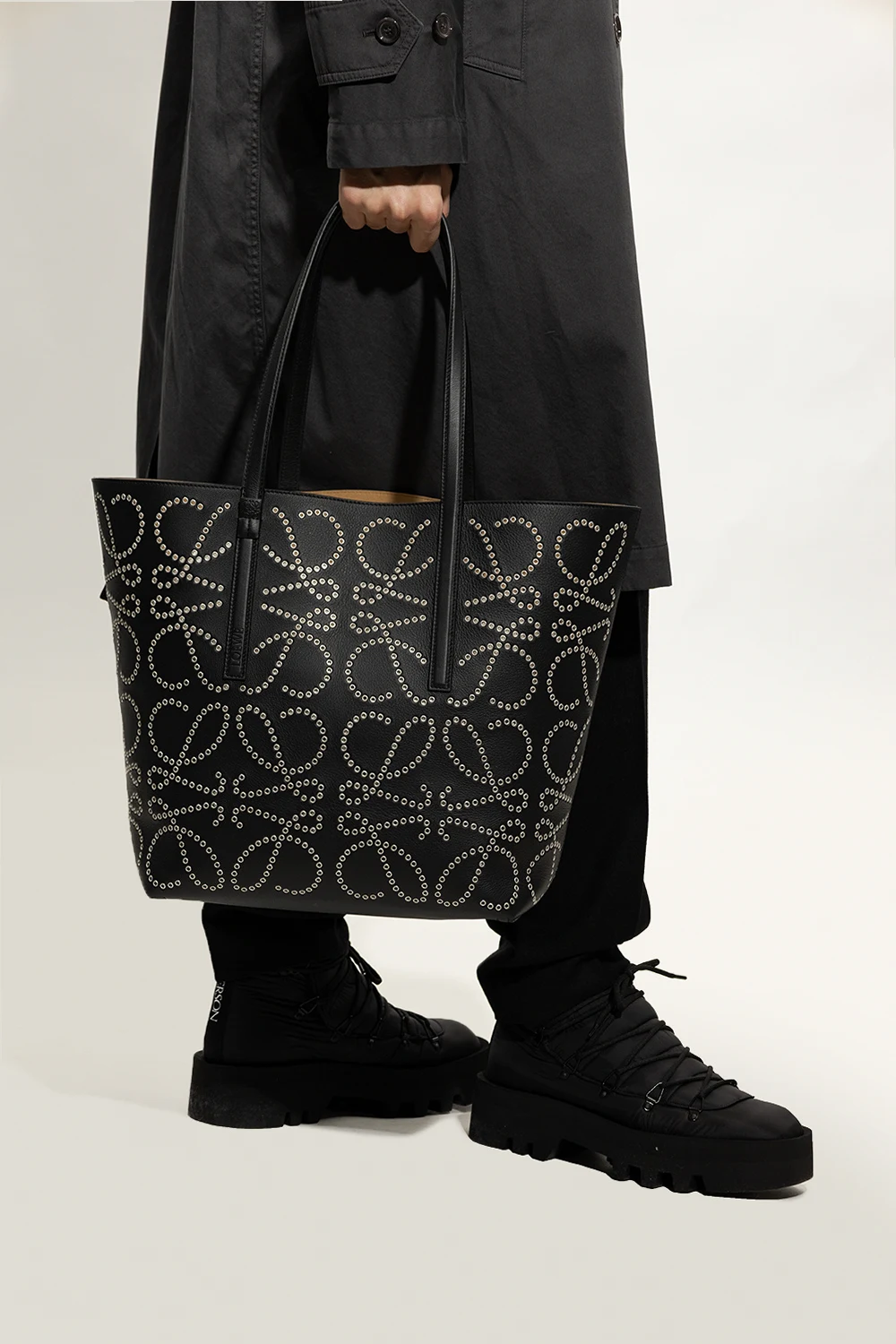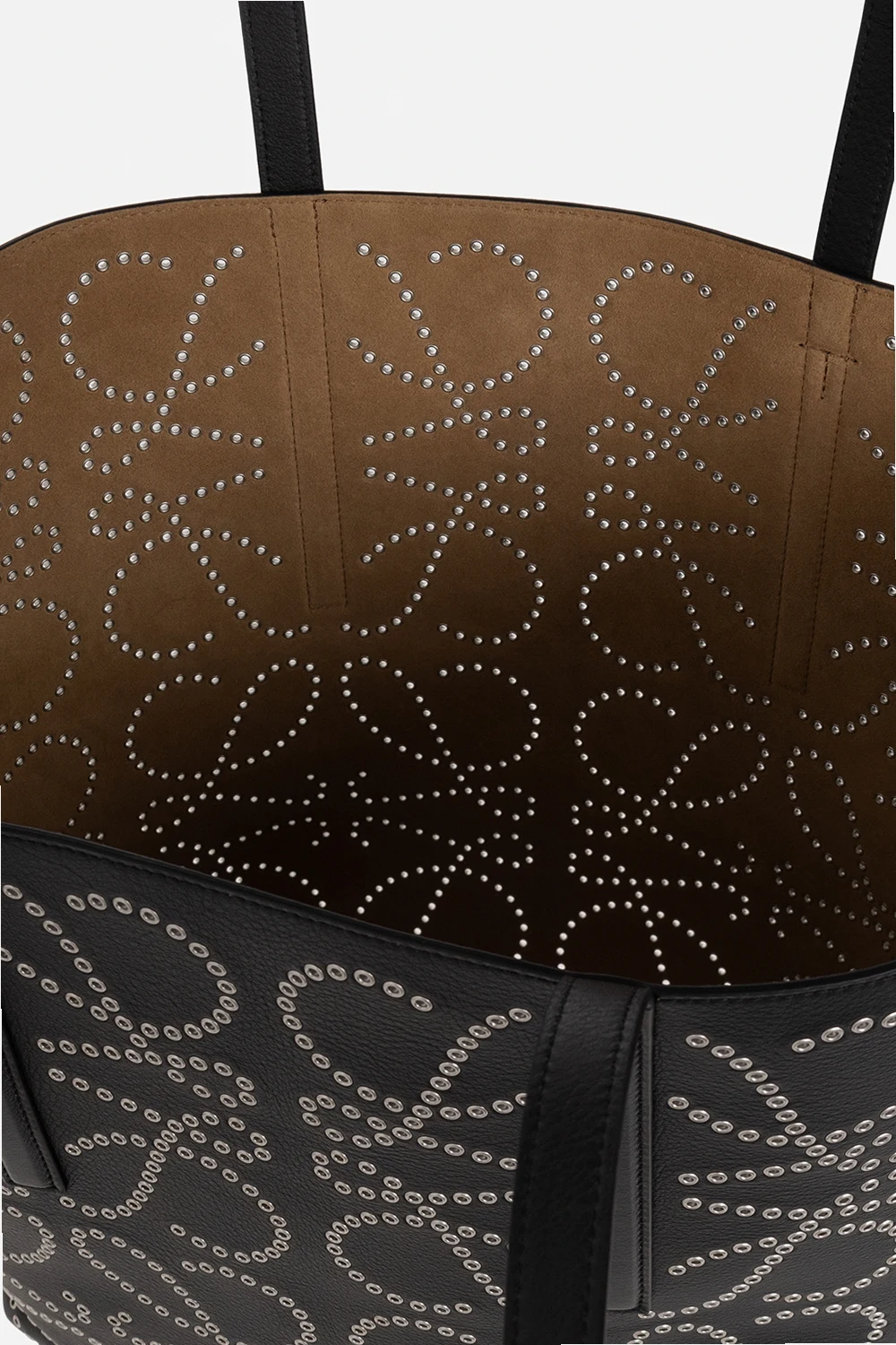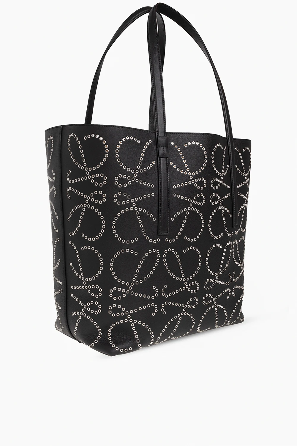 Czarna torba typu ‘shopper’, model ‘T Tote’ Loewe. Wykonana ze skóry cielęcej. Ozdobiona wzorem z logo ‘Anagram’ z metalowych ćwieków. Dwie półokrągłe rączki ozdobione wytłoczonym logo. Wewnątrz komora. Metalowe wykończenie w kolorze srebrnym.