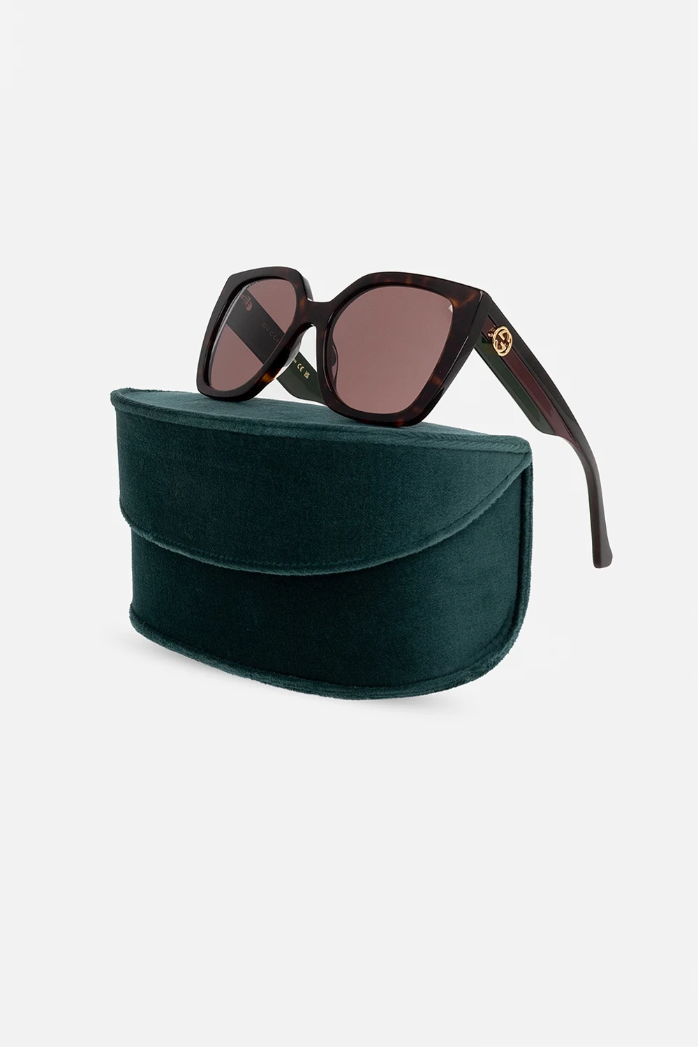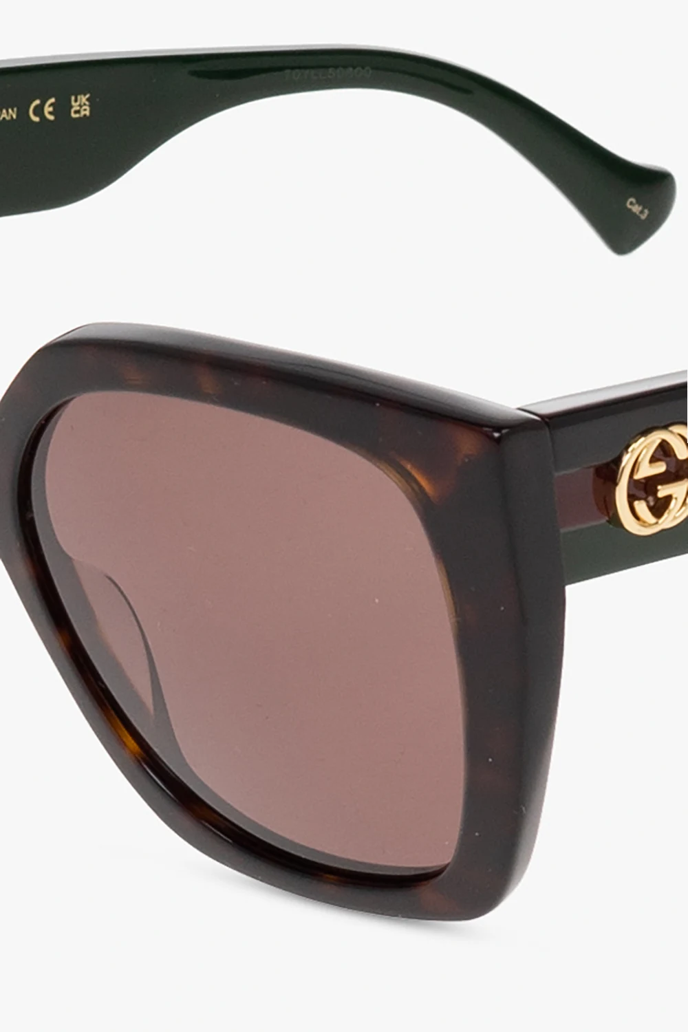 Brązowo-czarne, szylkretowe okulary przeciwsłoneczne Gucci. Kwadratowe oprawki z pojedynczym mostkiem. Zauszniki ozdobione charakterystycznym dla marki motywem ‘Web’ w kolorze zielono-czerwonym oraz aplikacją w kształcie logo ‘Interlocking G’. Brązowe szkła ze 100% ochroną przed promieniami UV. Dołączone etui w losowo wybranym kolorze.