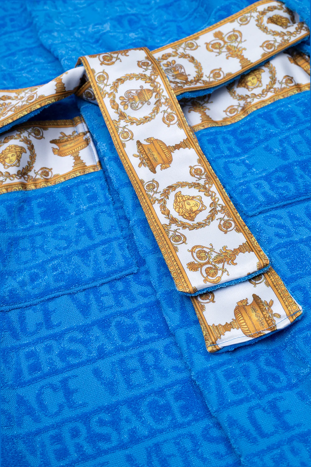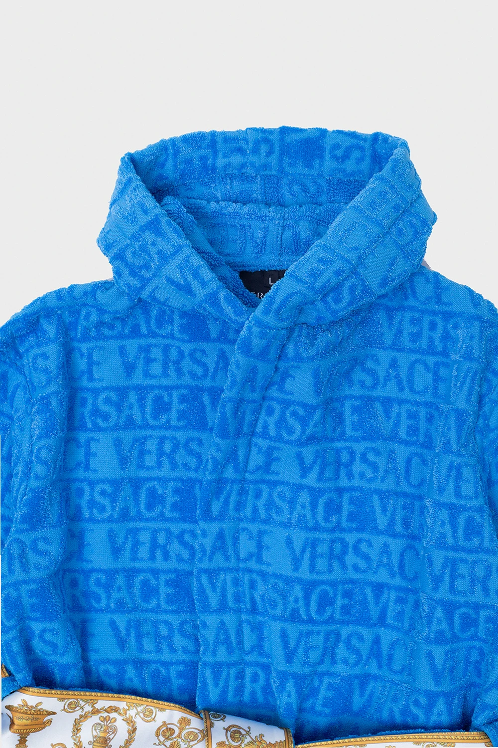 Niebieski szlafrok z kapturem Versace Kids. W tali pasek. Ozdobiony wypukłym monogramem. Biało-żółte materiałowe wstawki z charakterystycznym nadrukiem ‘Barocco’. Z przodu dwie kieszenie. Długie rękawy.