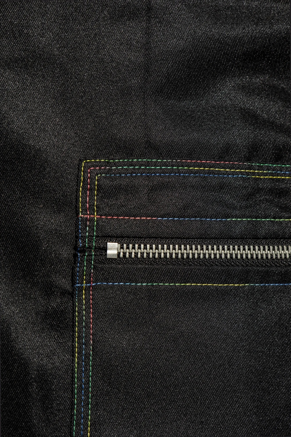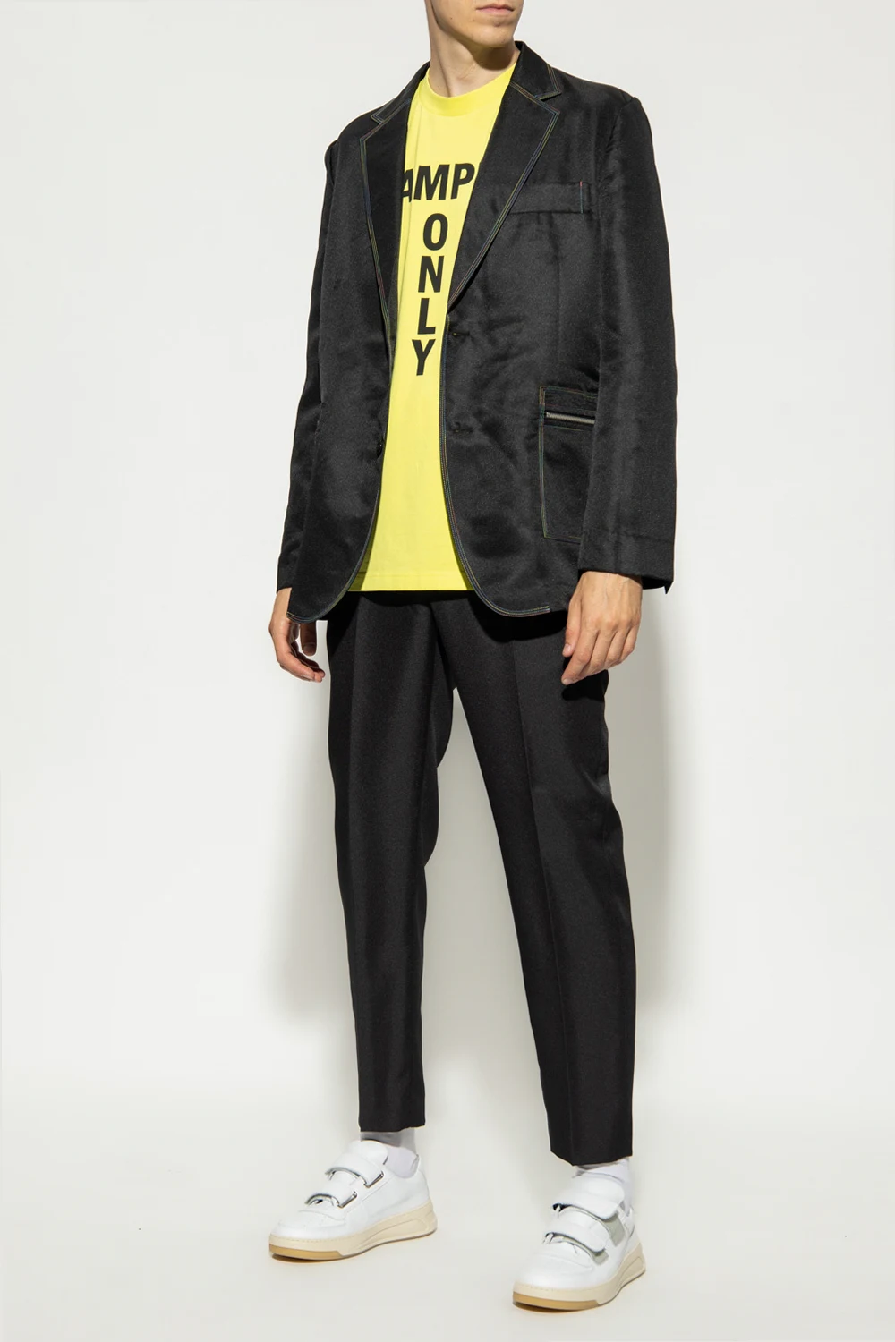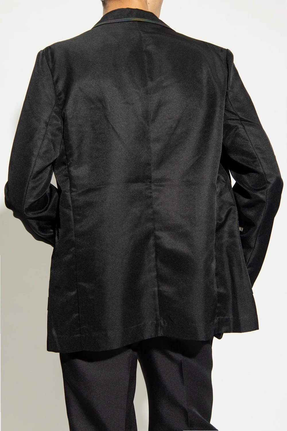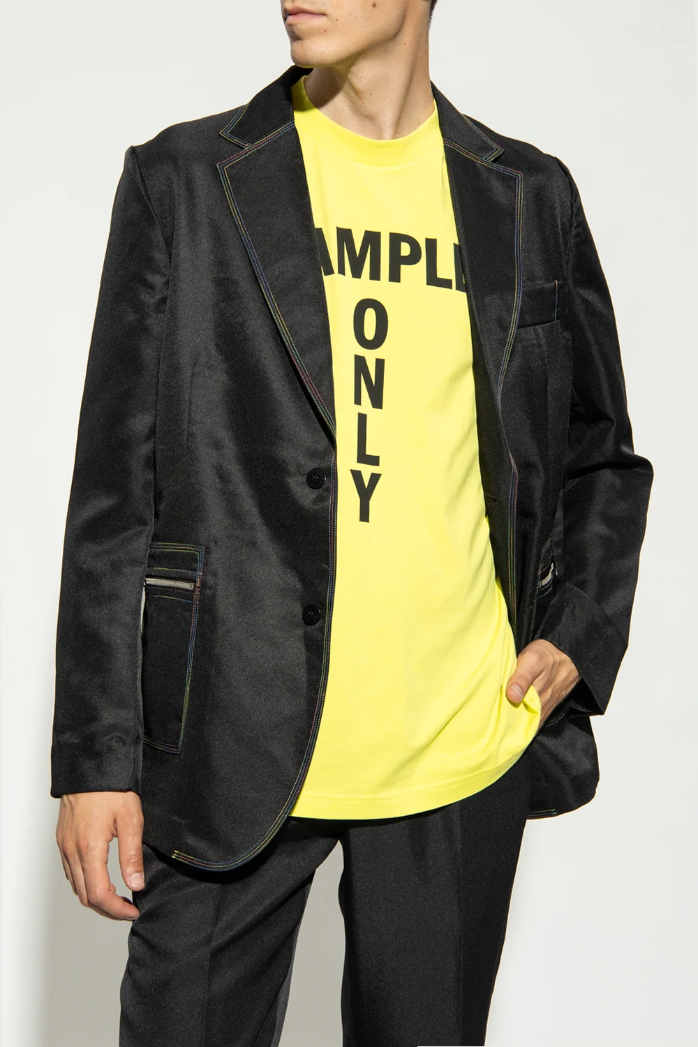 Czarna, jednorzędowa marynarka Acne Studios. Wykonana z połyskującego materiału pochodzącego z recyklingu. Zapinana na guziki. Ozdobiona kolorowymi, dekoracyjnymi szwami. Kołnierz wykończony otwartymi klapami. Trzy kieszenie: dwie zapinane na zamek oraz wsuwana. Długie rękawy.