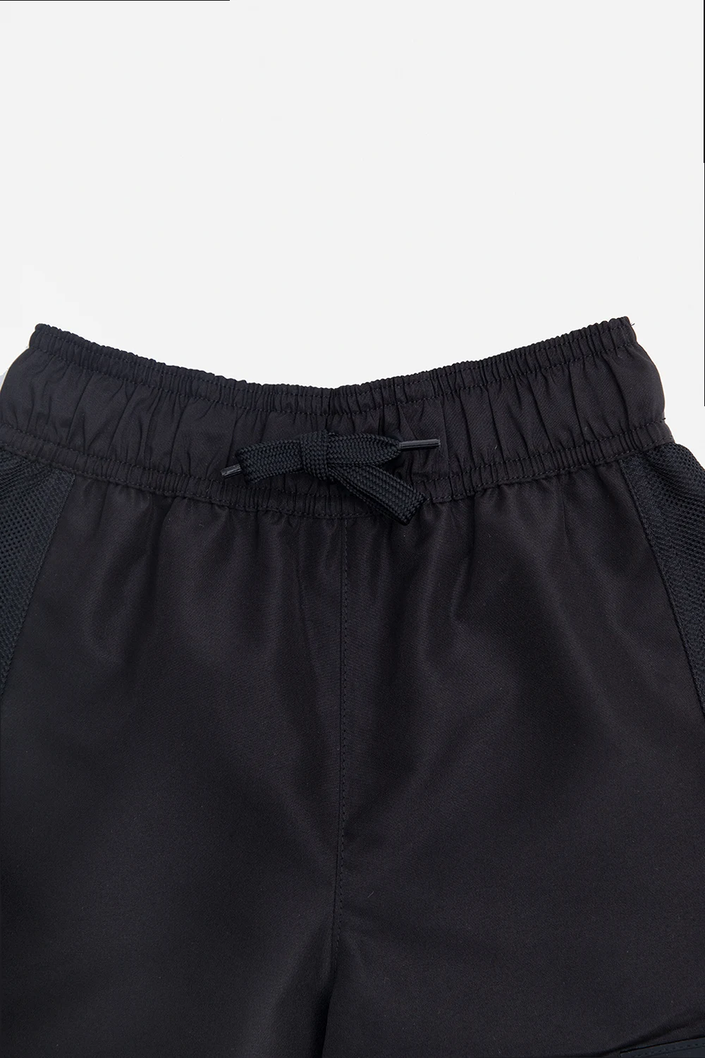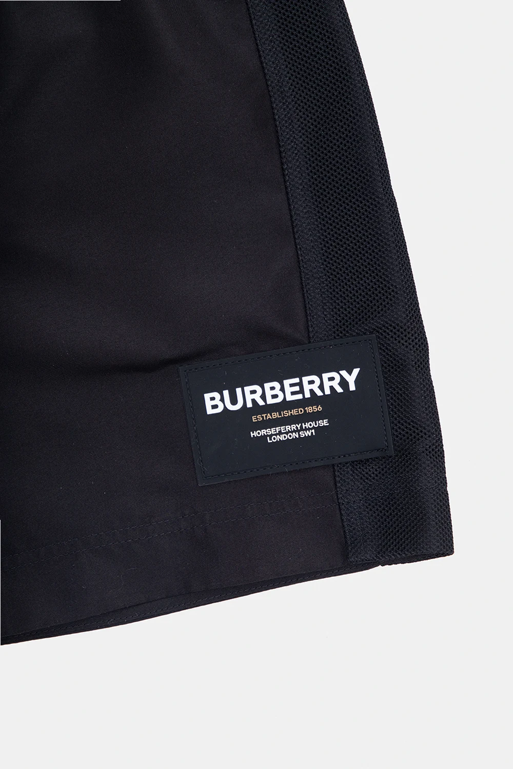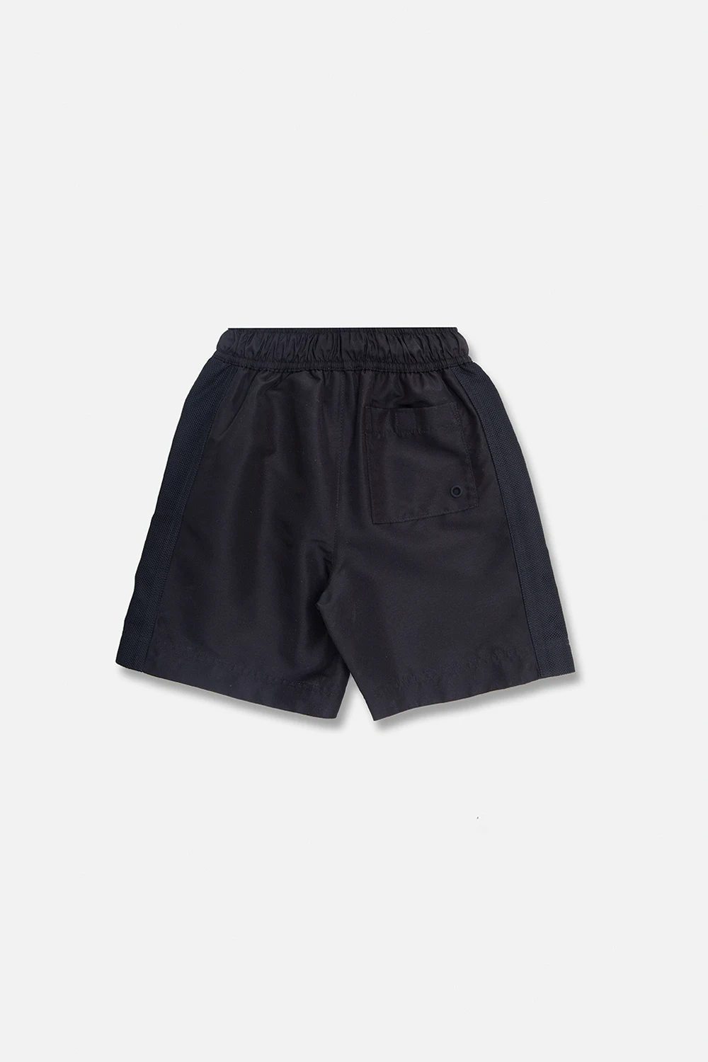 Czarne szorty kąpielowe, model ‘Malcolm’ Burberry Kids. W pasie wszyta guma ściągana trokami. Ozdobione czarną, gumową naszywką z logo. Z tyłu wsuwana kieszeń.