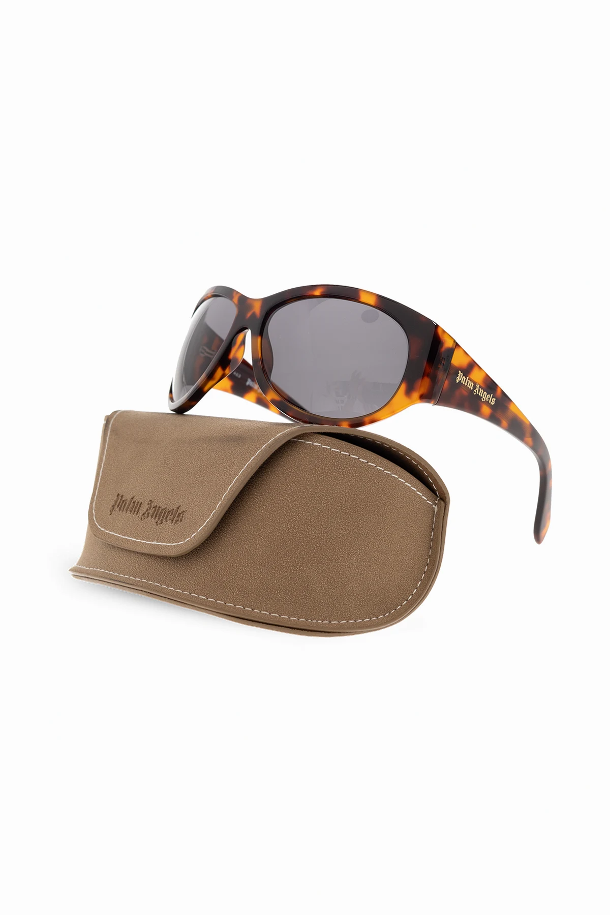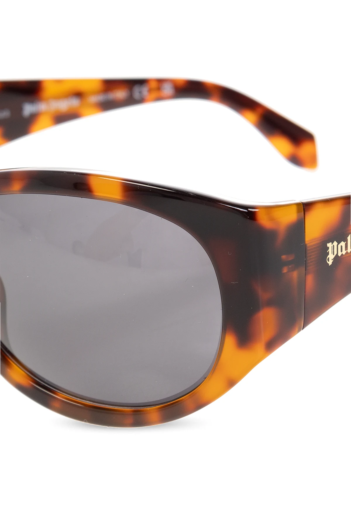 Brązowo-czarne, szylkretowe okulary przeciwsłoneczne, model ‘Gridley’ Palm Angels. Zauszniki ozdobione logo w kolorze złotym. Szare soczewki ze 100% ochroną przed promieniowaniem UV. Dołączone etui.