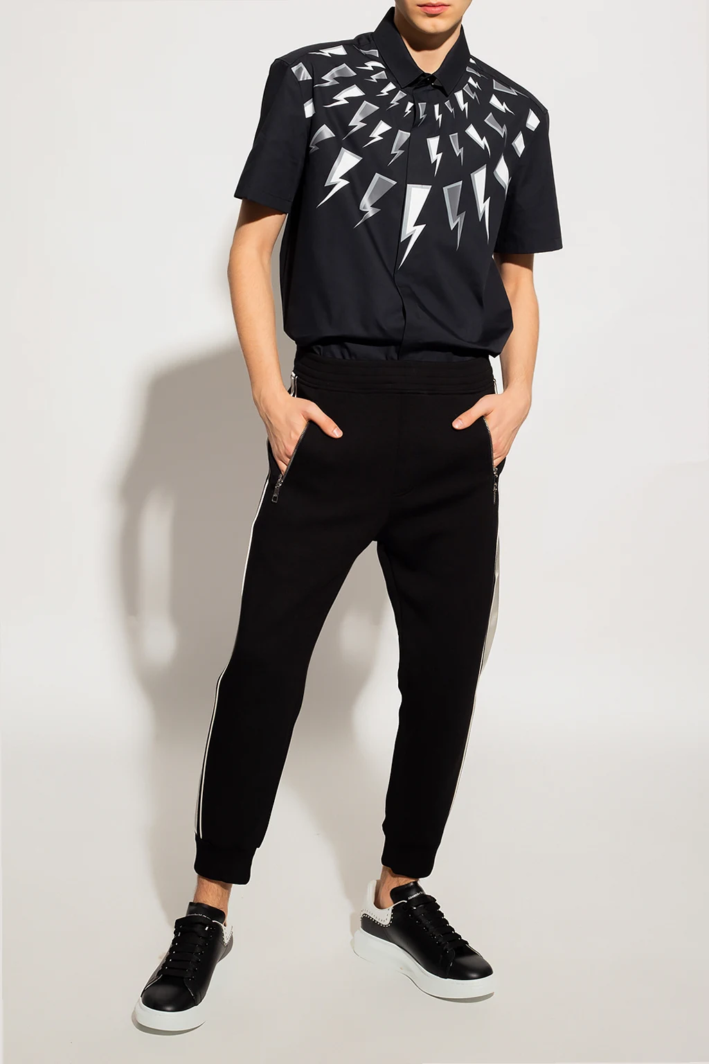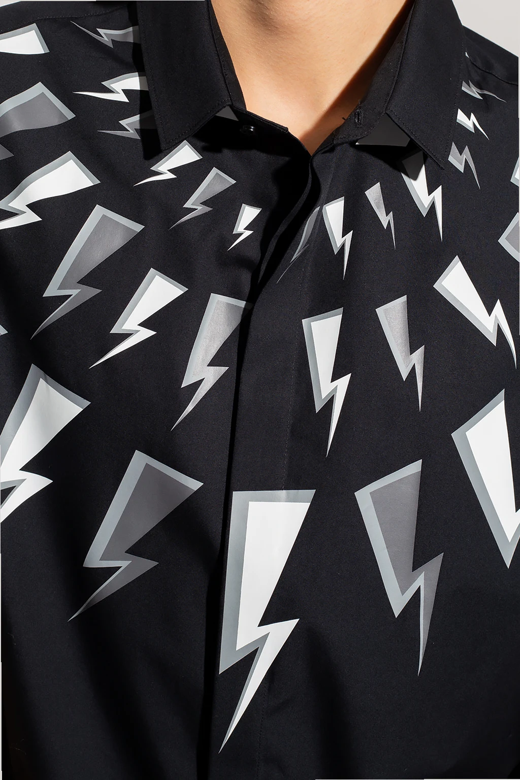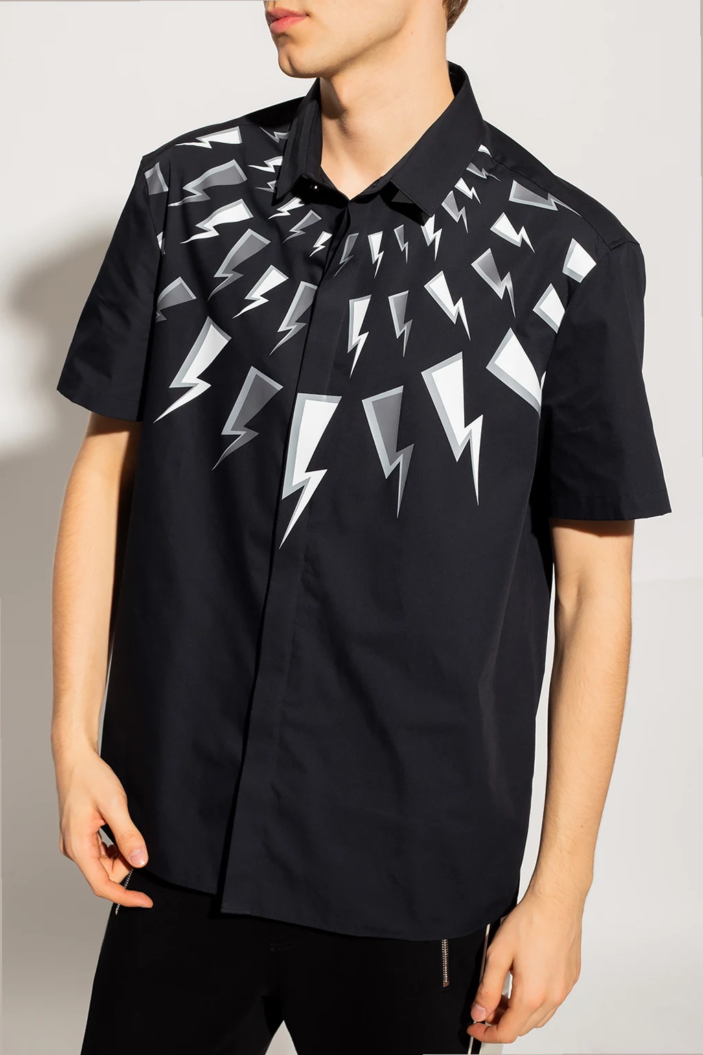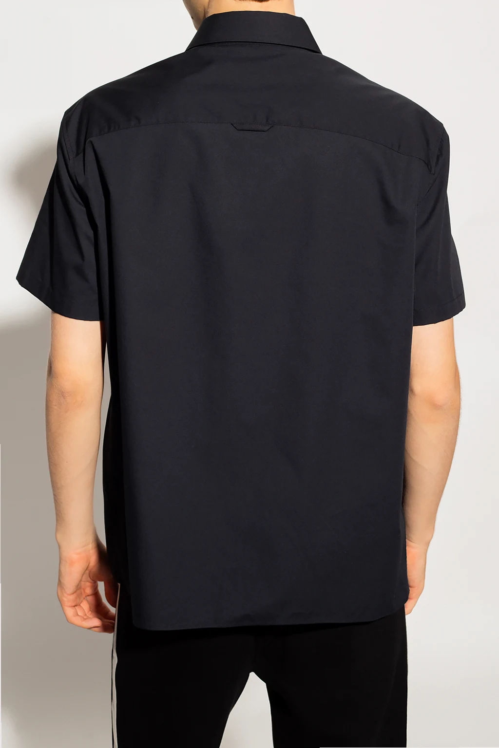 Czarna koszula Neil Barrett. Zapinana na guziki kryte plisą. Ozdobiona logo w kolorze biało-szarym. Krótkie rękawy.