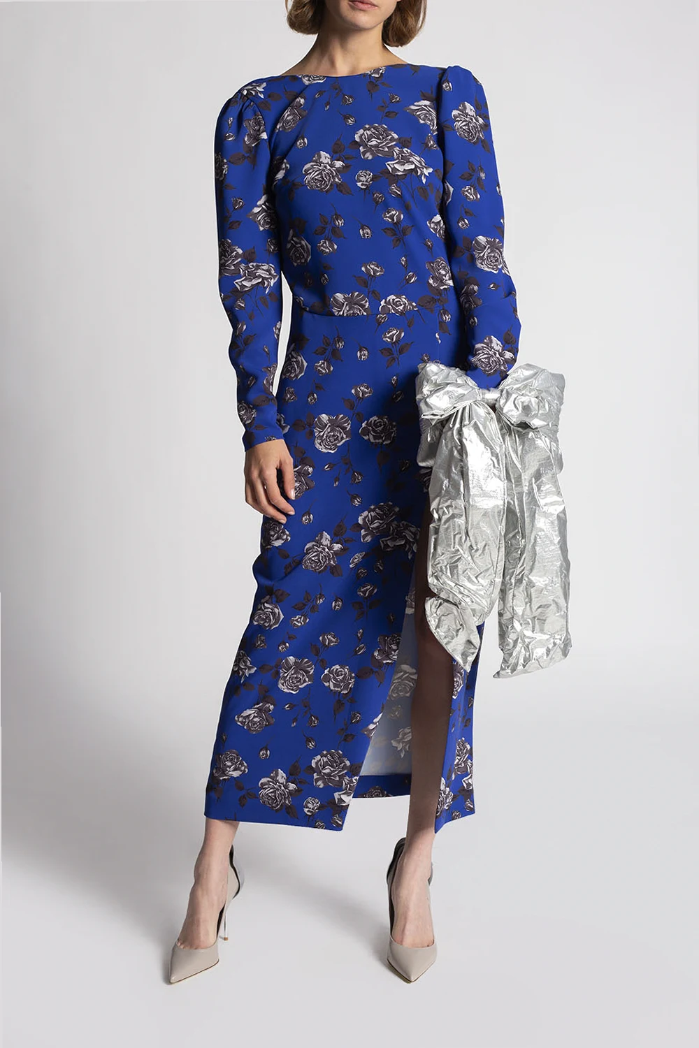 Szare, skórzane szpilki, model ‘Petalo Pump’ Le Silla. Z tyłu ozdobione dekoracyjną aplikacją. Szpilka w kolorze srebrnym. Beżowa podeszwa wykonana ze skóry oraz gumy.