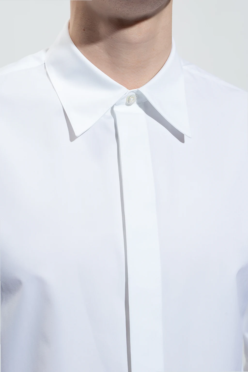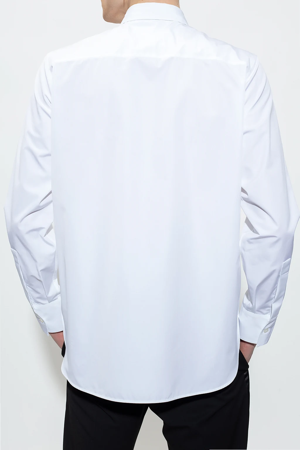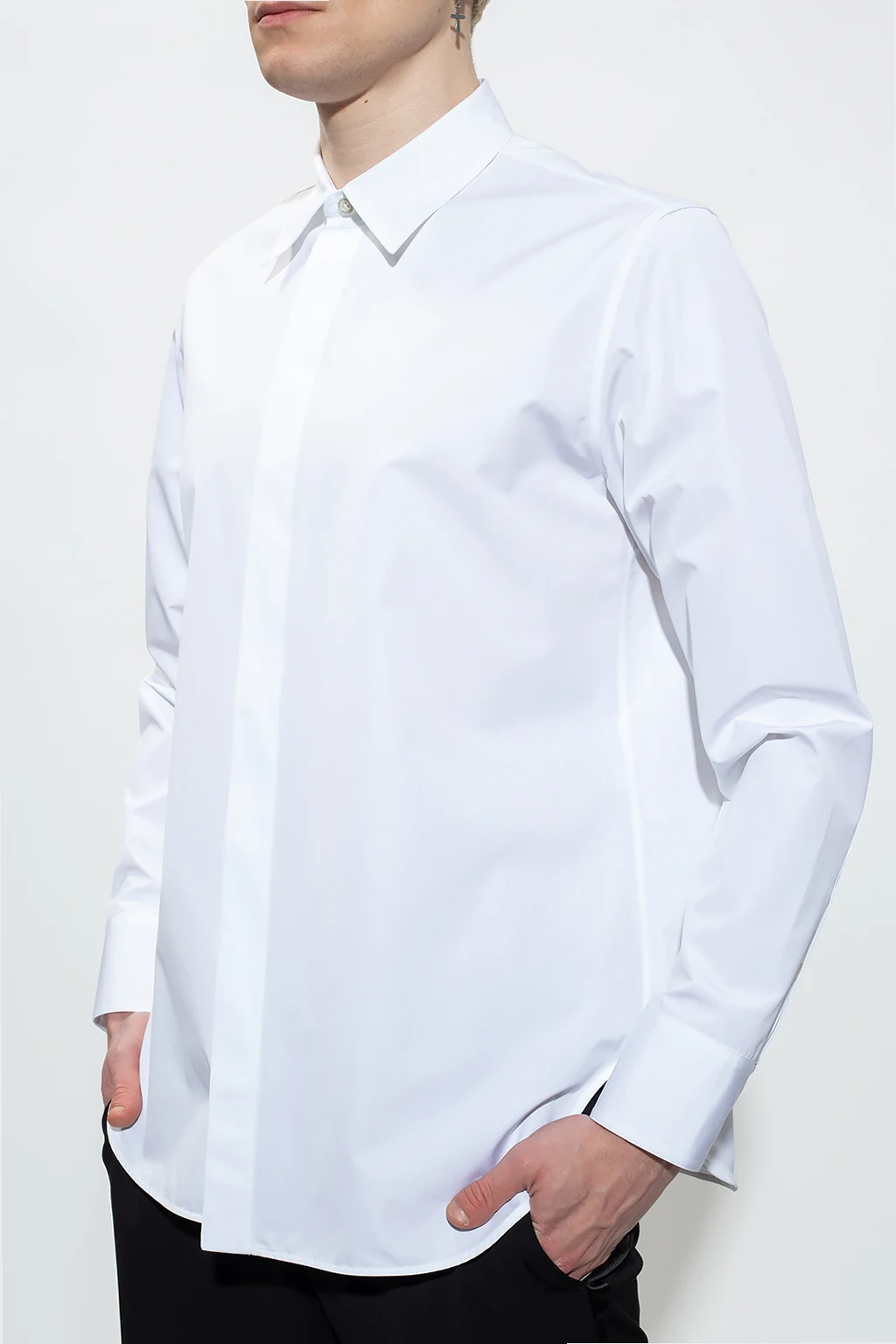 Biała, bawełniana koszula Jil Sander. Zapinana na guziki z krytą plisą. Po bokach rozcięcie. Długie rękawy, mankiety zapinane na guzik.