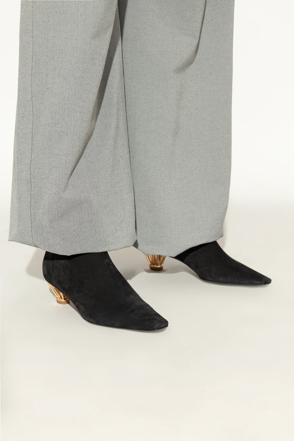 Obcas: Średniej wysokości, designerski obcas w kolorze złotym, z otwartą, ażurową konstrukcją, stanowi wyjątkowy akcent, który przyciąga uwagę i dodaje luksusowego charakteru.