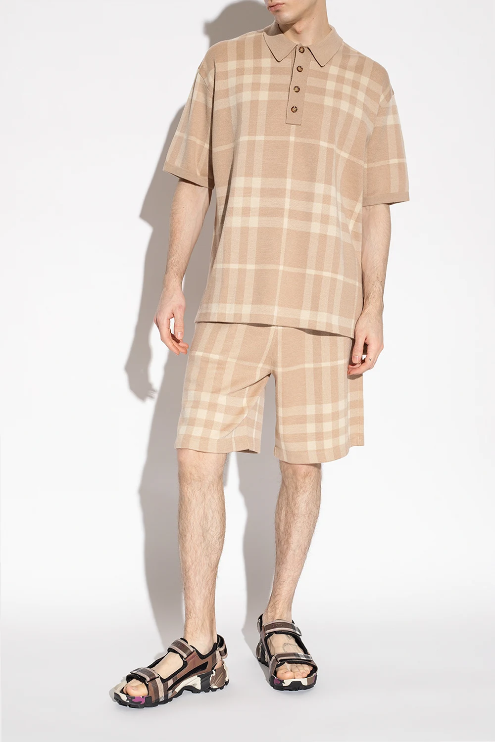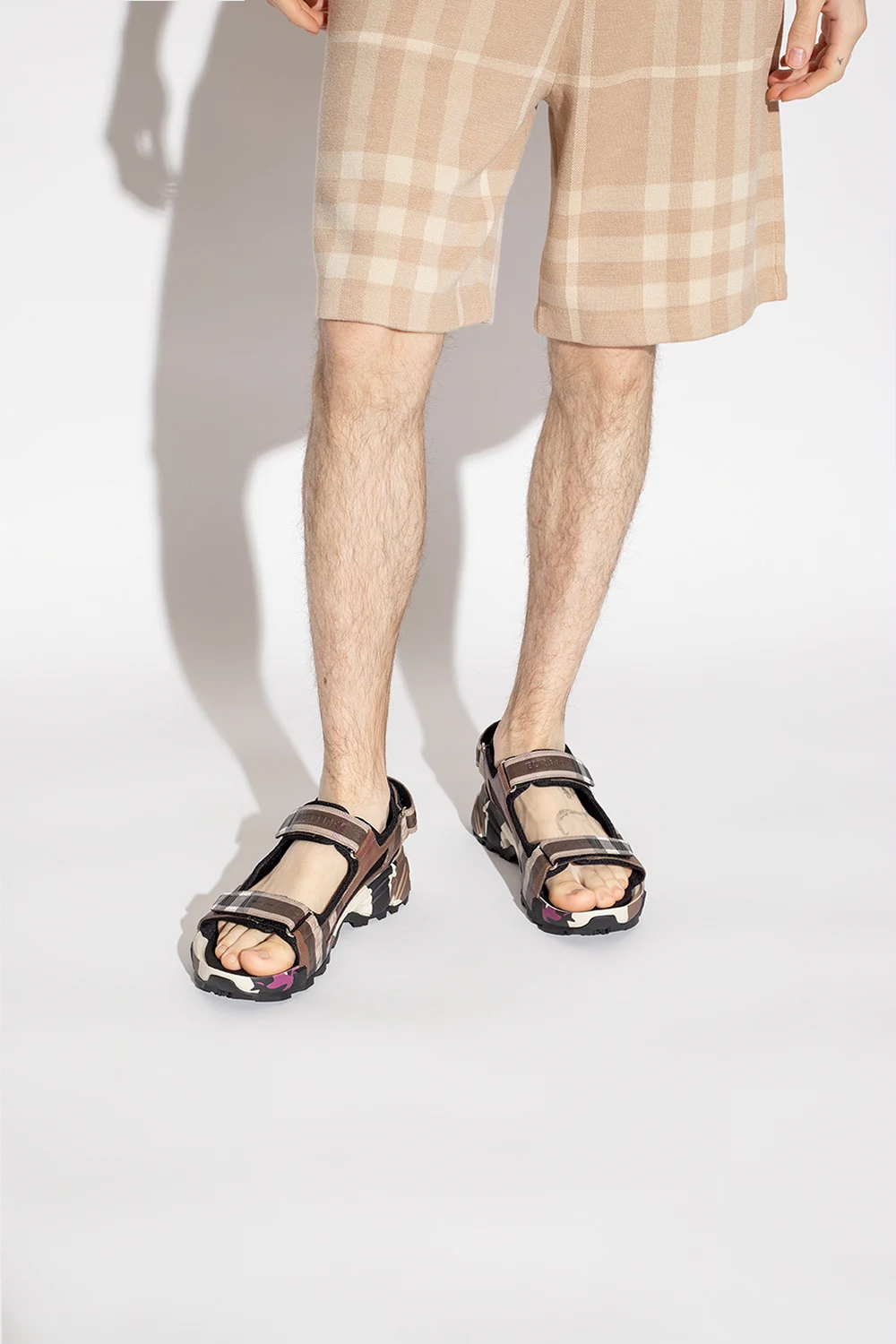 Brązowo-kremowo-czarne sandały Burberry. Zapinane na rzep. Ozdobione charakterystycznym dla marki wzorem w kratę oraz logo. Czarna, gumowa podeszwa.