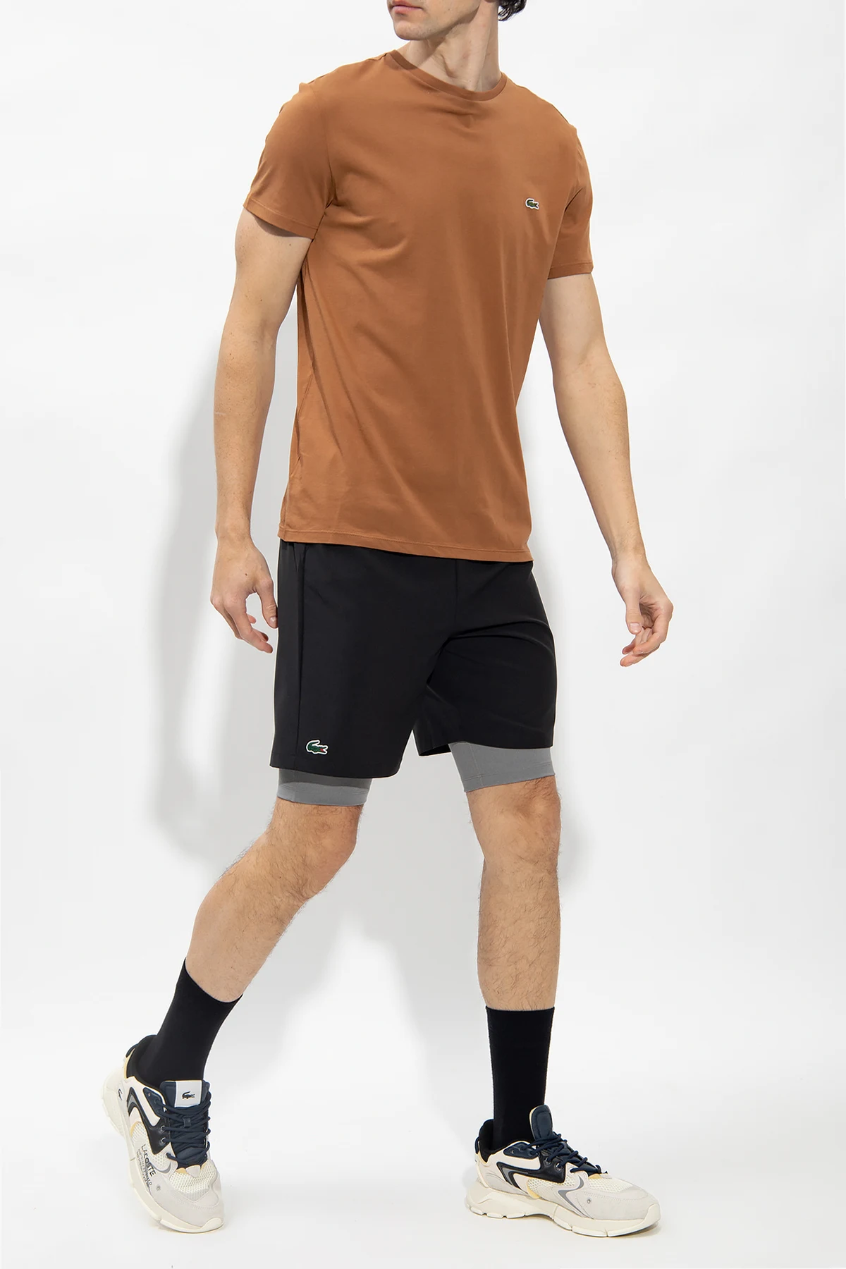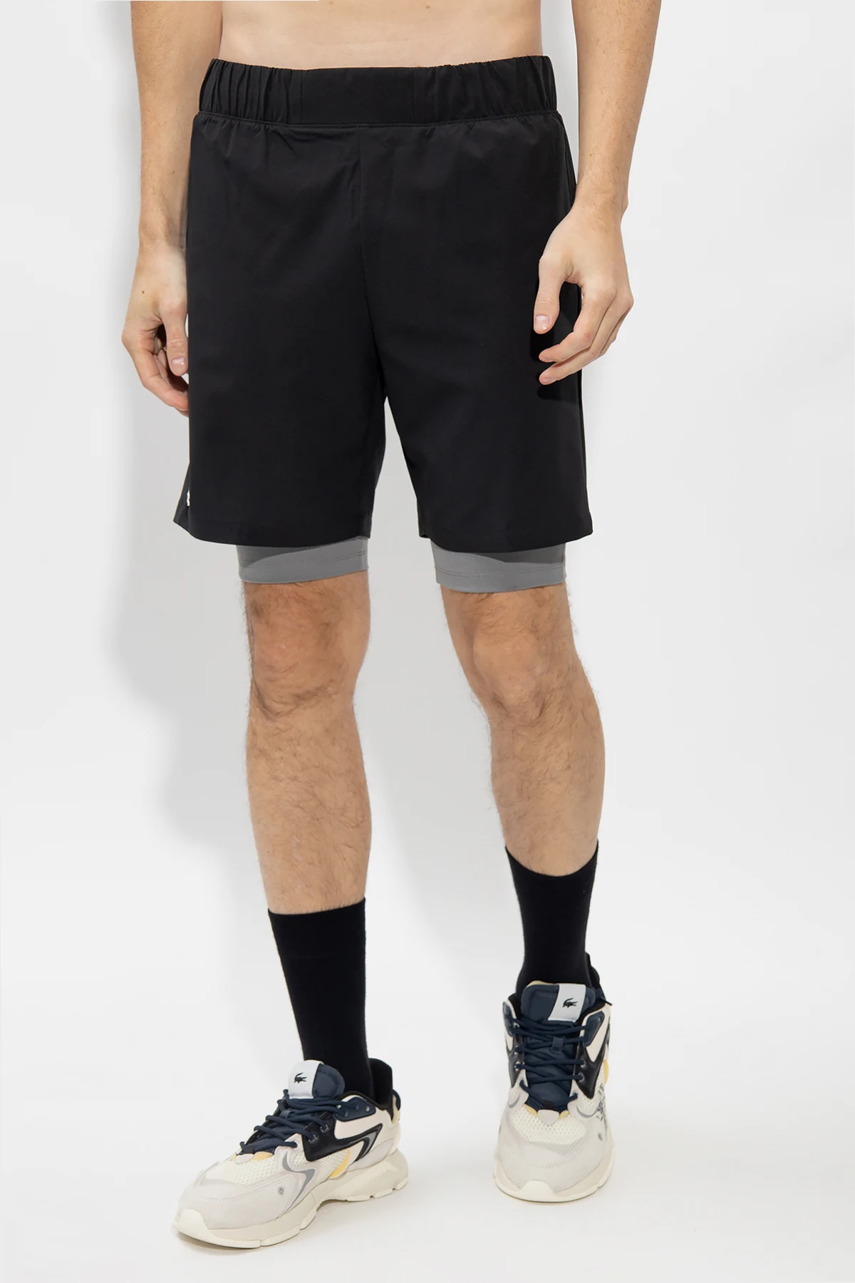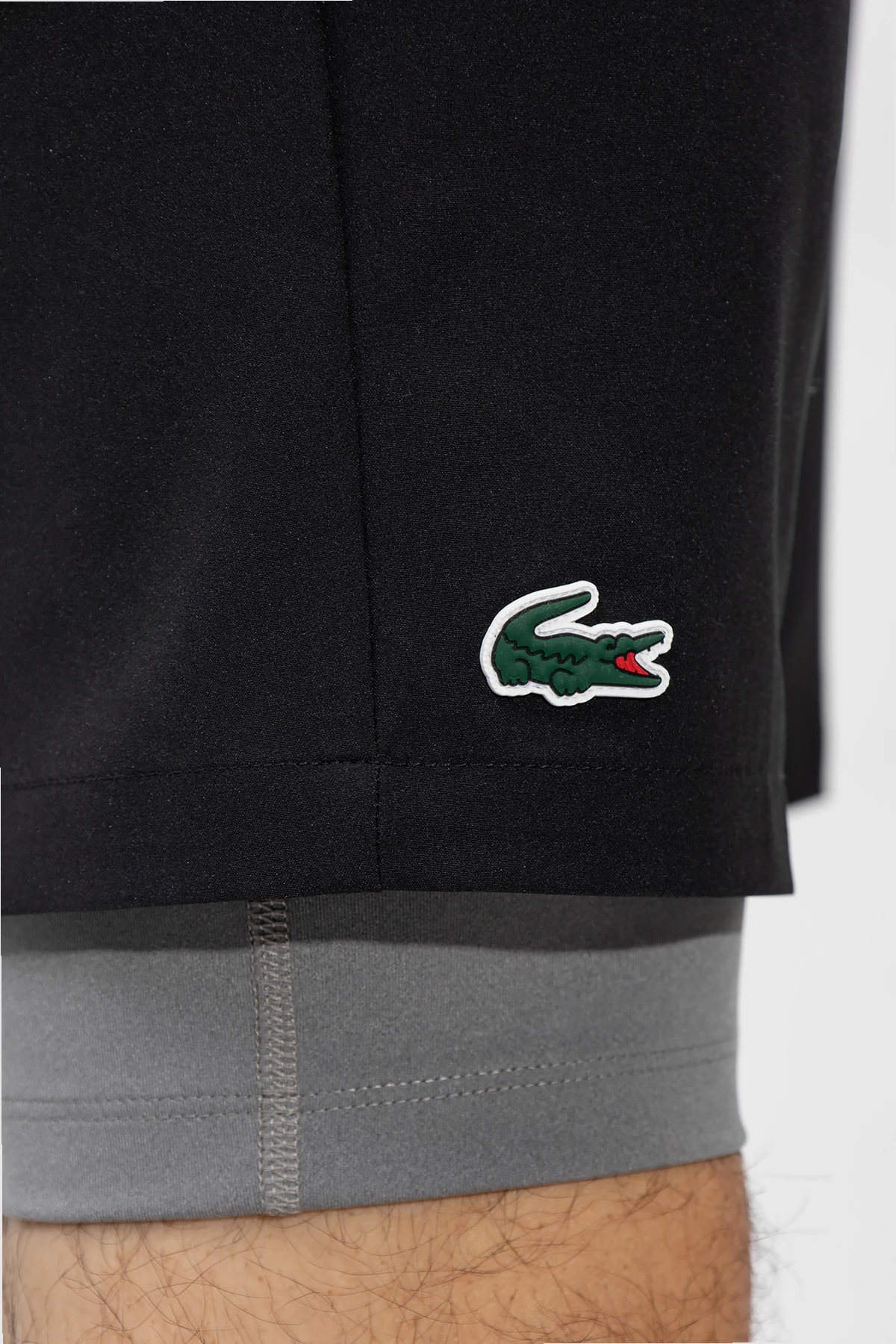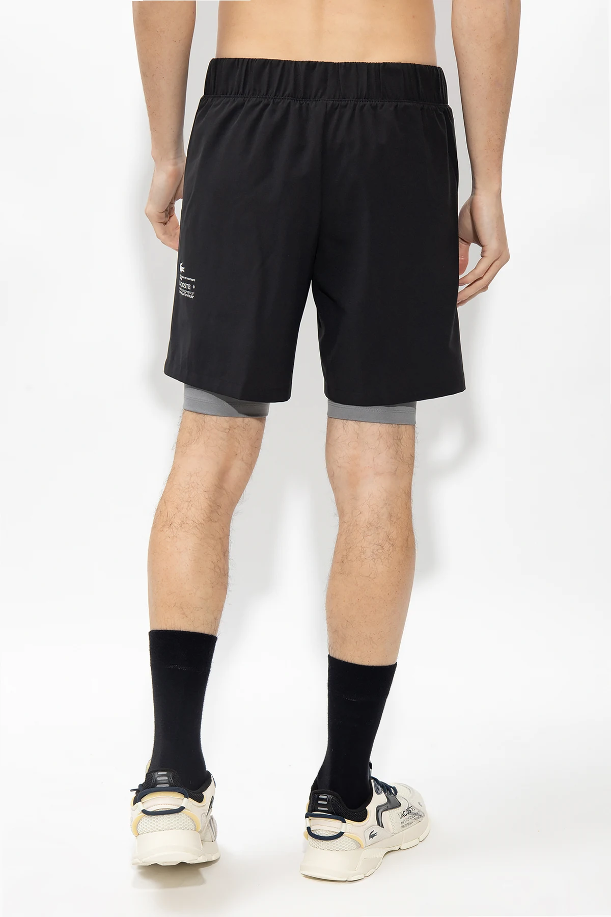 Czarno-szare, dwuwarstwowe szorty Lacoste. Wykonane z materiału z recyklingu. W pasie wszyta guma ściągana trokami. Ozdobione naszywką i nadrukiem z logo.