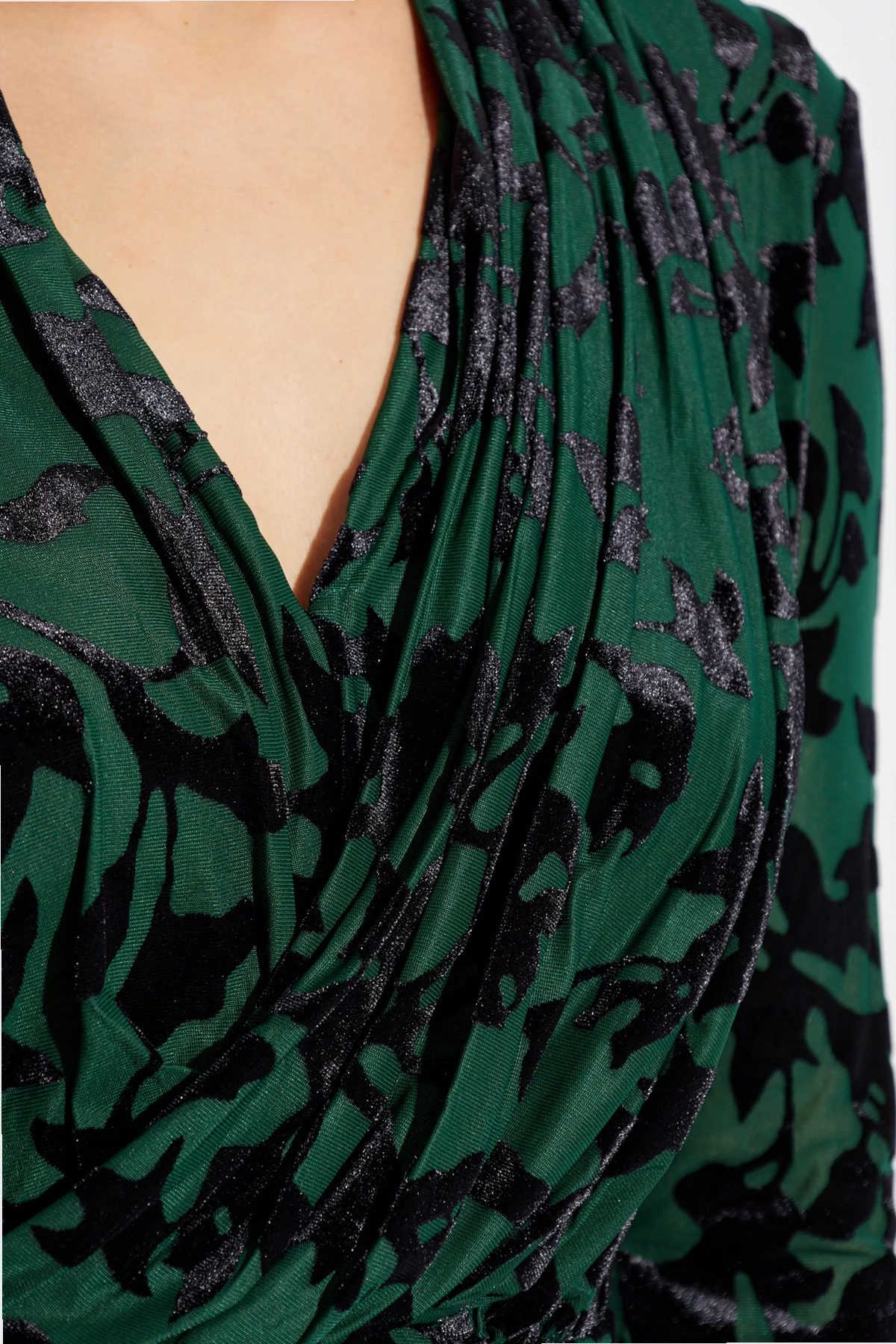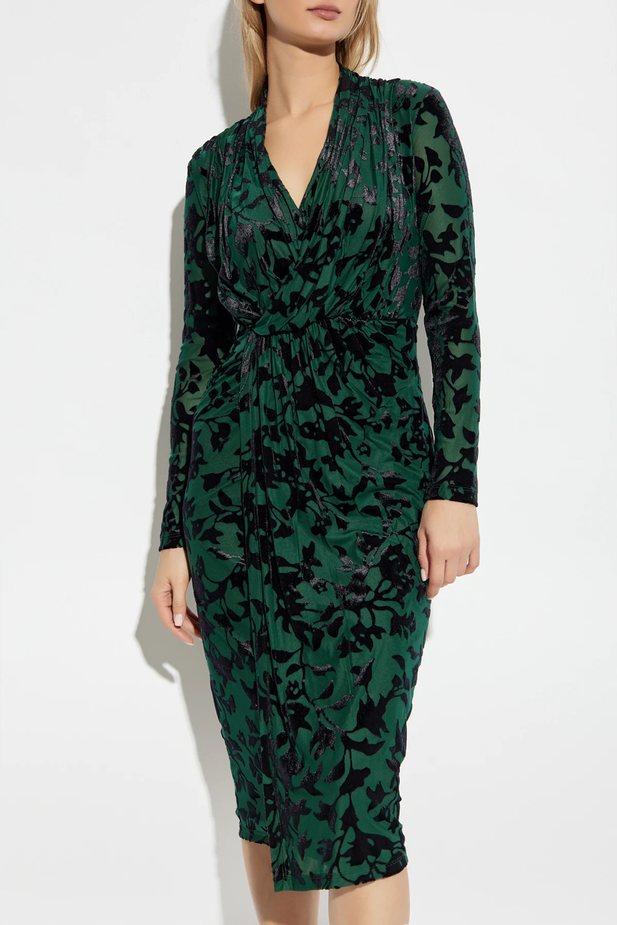 Kopertowy dekolt i długie rękawy nadają jej klasyczny i stylowy wygląd, zaś dopasowany krój z akcentem na talię podkreśla sylwetkę, dodając jej wdzięku. Marszczenia w okolicach dekoltu i talii wprowadzają element finezji, który dopełnia luksusowy charakter tej kreacji.
