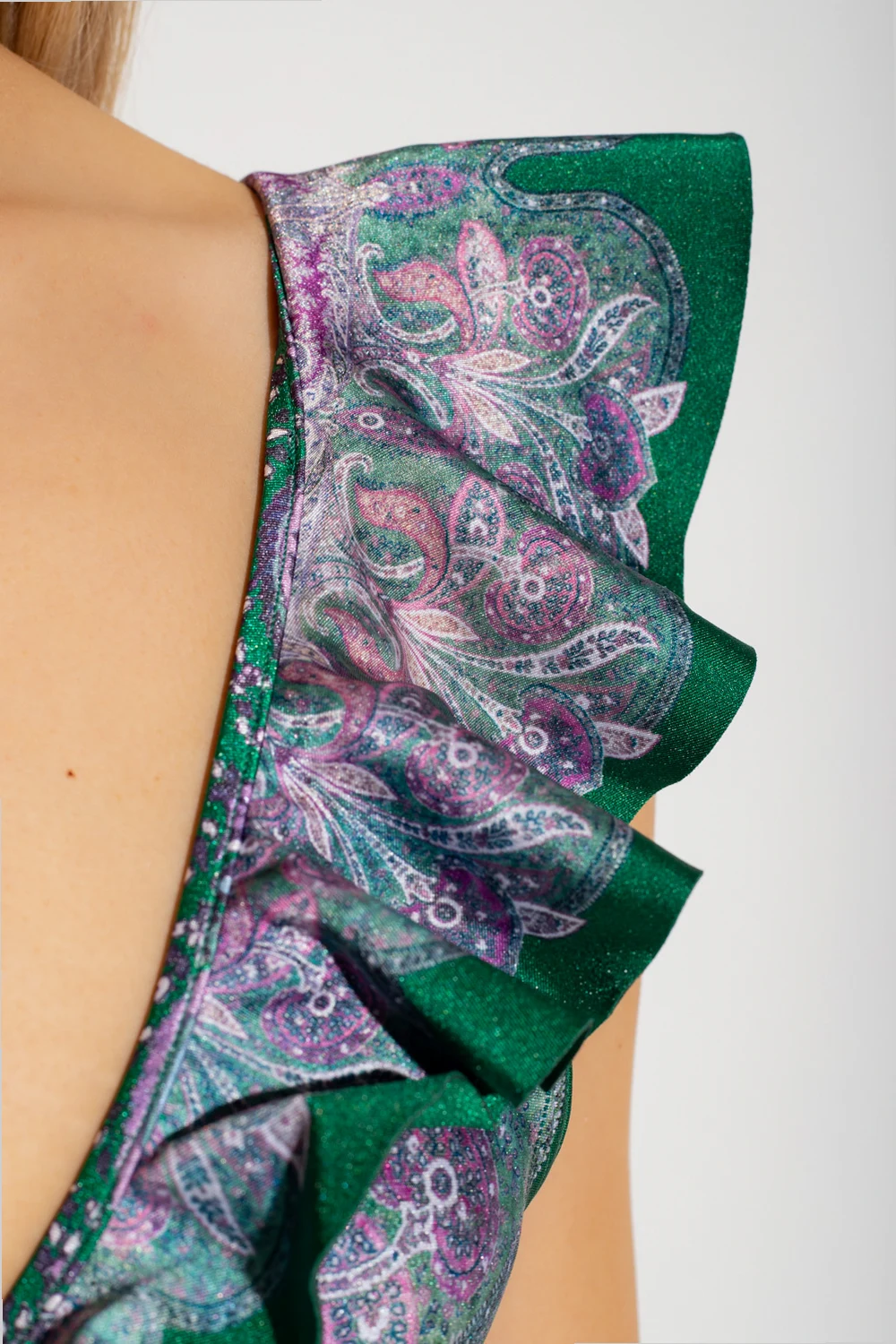 Kolorowy, dwuczęściowy kostium kąpielowy Zimmermann. Ozdobiony nadrukiem ‘paisley’. Góra wiązana w talii. Trójkątne miseczki. Dekoracyjne falbany. Regulowane ramiączka.
